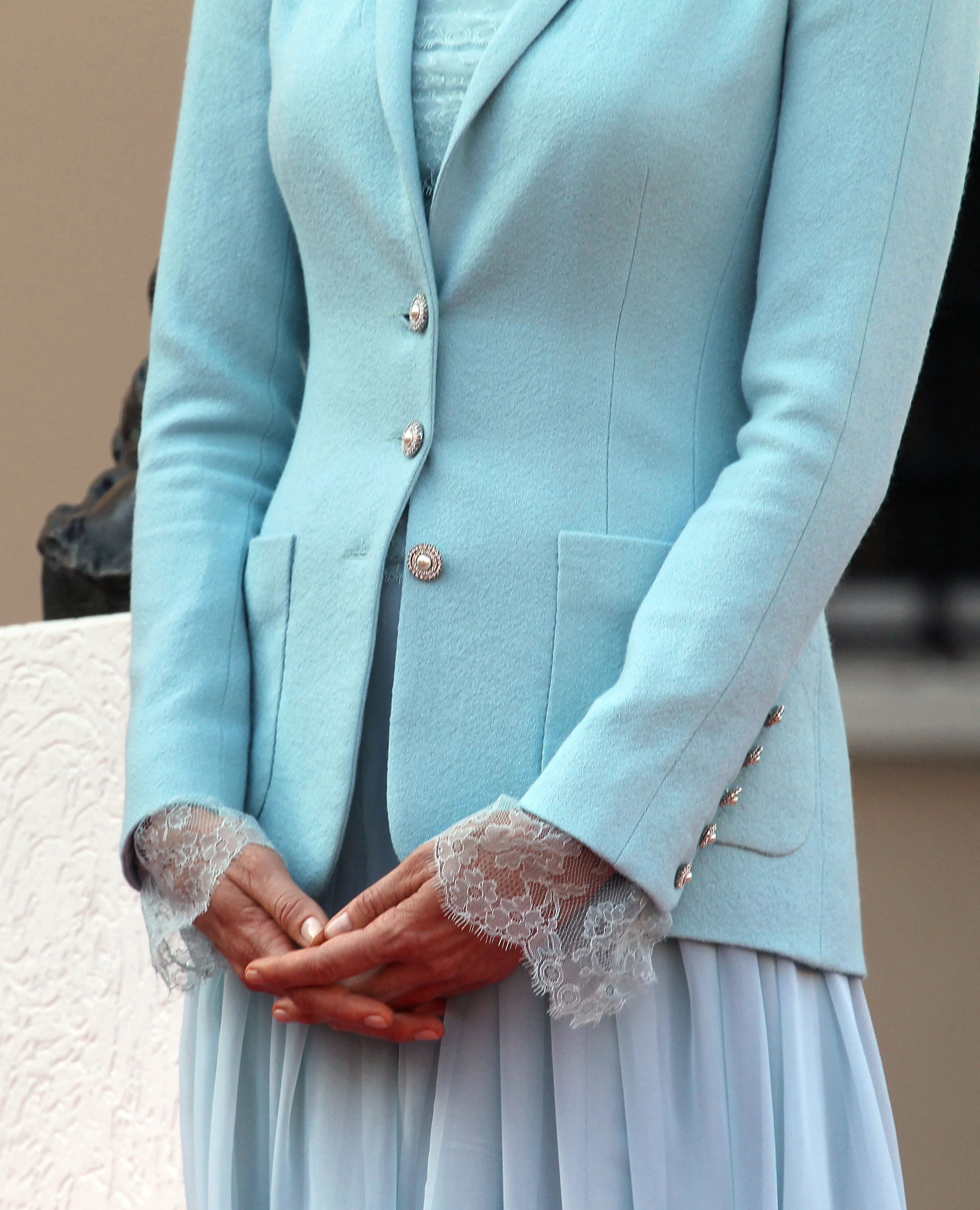 Charlène droeg tijdens deze ceremonie een ensemble van Chanel, ontworpen door Karl Lagerfeld. Het bestond uit een wijde broek van zachte stof en een bijpassend colbert. Lagerfeld zou de kleur later 'Charlène-bleu' noemen.