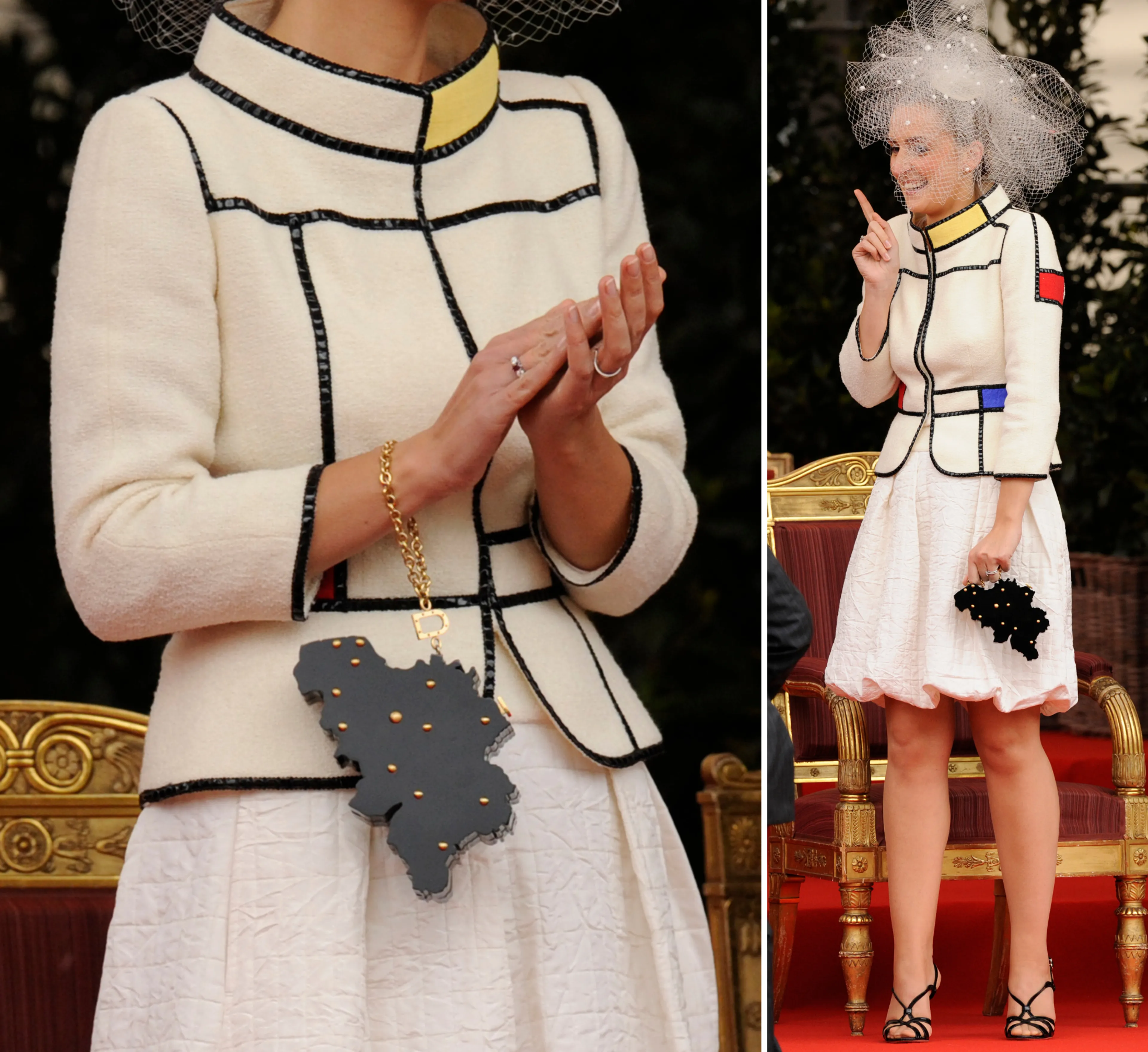 Tijdens de nationale feestdag in 2008 weet prinses Claire alle ogen op zich gericht. Ze verschijnt in een opvallend mantelpakje van de Belgische couturier Stijn Helsen, die zich liet inspireren door de Nederlandse kunstenaar Mondriaan. Als accessoire kiest Claire voor een zwart plexi handtasje met de contouren van het land België.