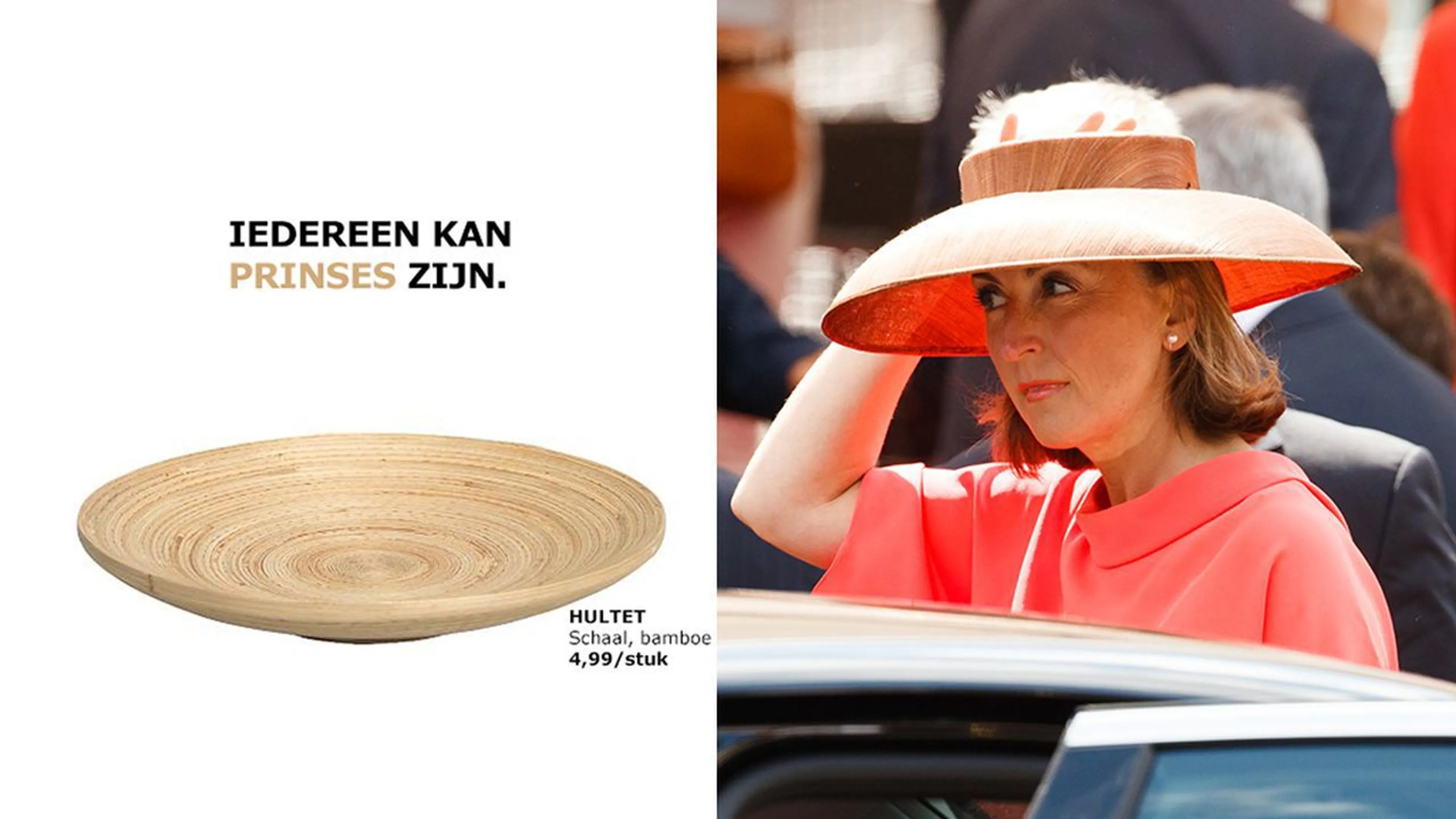 De Belgische vestiging van het Zweedse meubelwarenhuis haakt in op alle gekkigheid. Ikea pakt uit met een grappige reclame voor hun bamboeschaal. "Iedereen kan prinses zijn", staat er bij de afbeelding van schaal Hultet à 4,99 euro.
