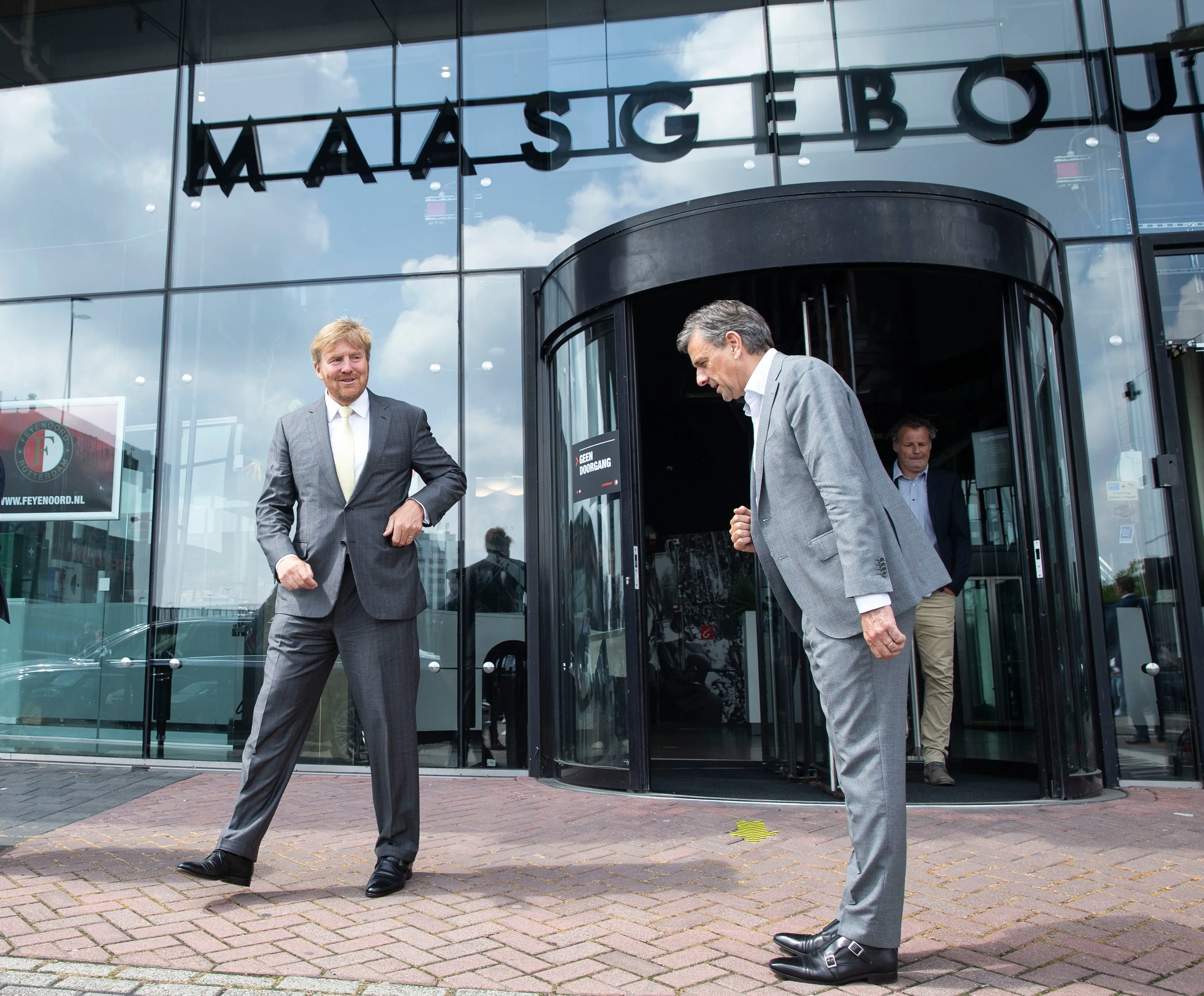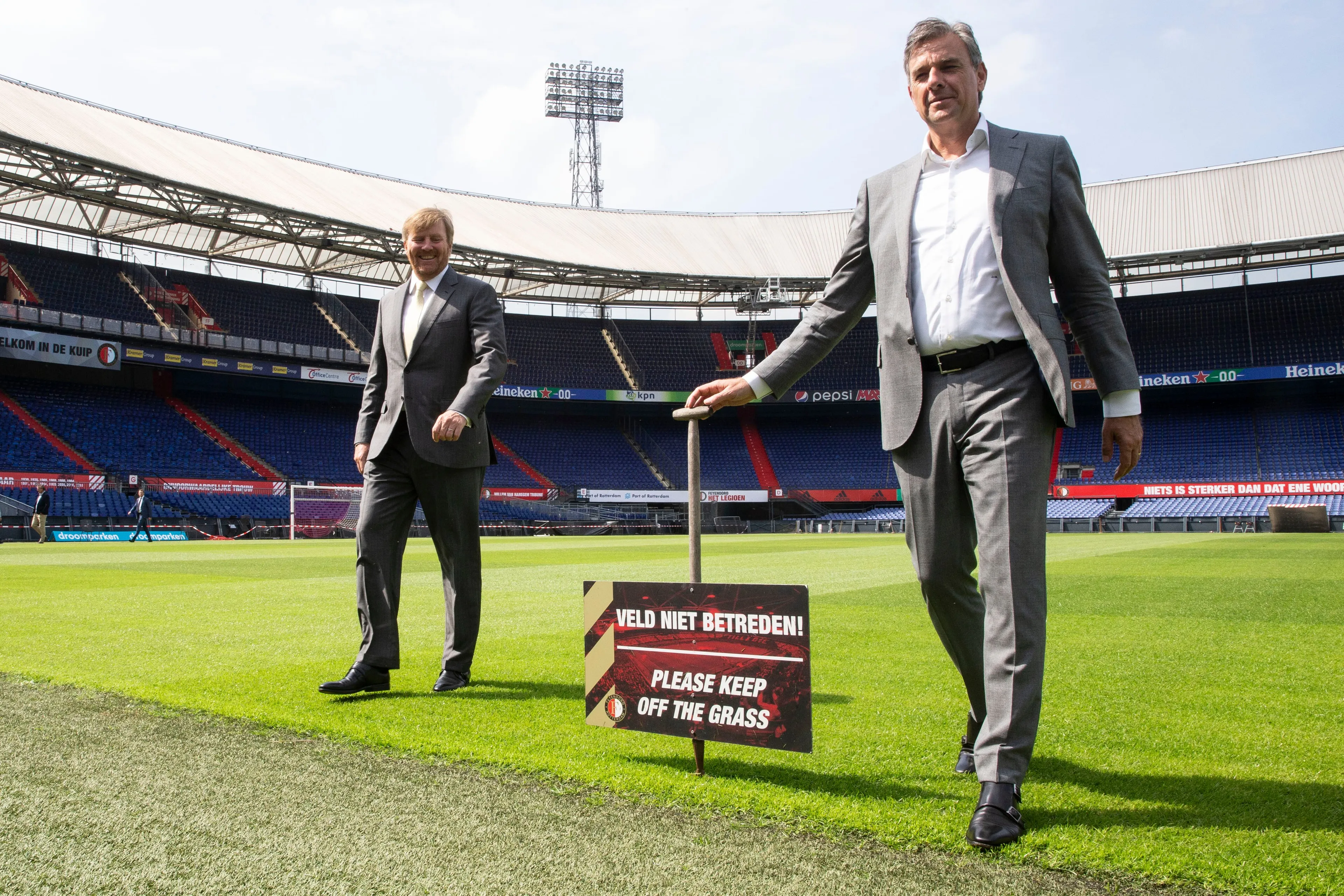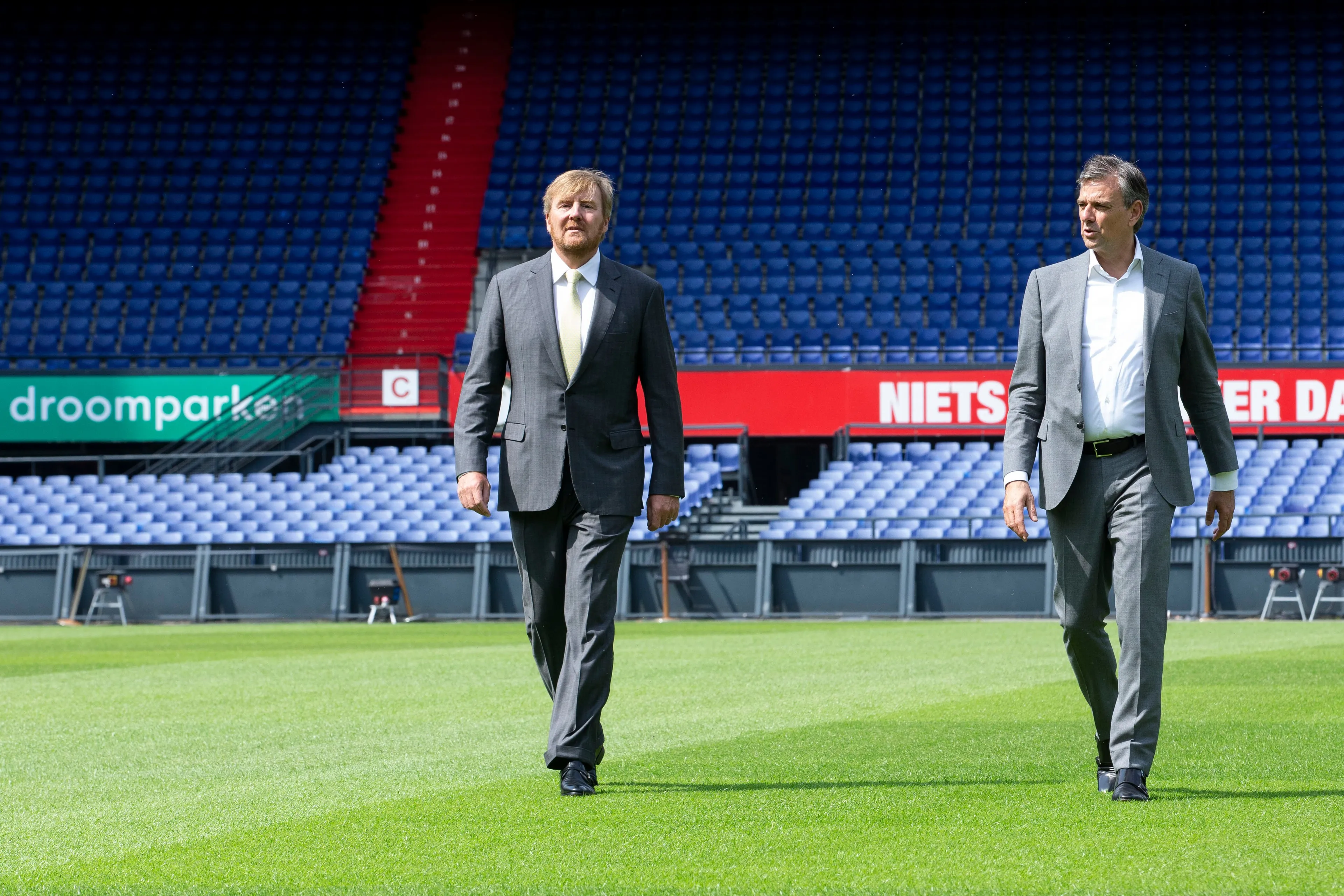 Willem-Alexander bezocht de Kuip om te praten over de gevolgen van de coronacrisis voor de sport- en evenementensector. Dat deed hij met algemeen directeur Mark Koevermans en speler Steven Berghuis. De Rotterdamse club deelde foto's van het bezoek op Twitter. De drie hielden netjes afstand van elkaar.