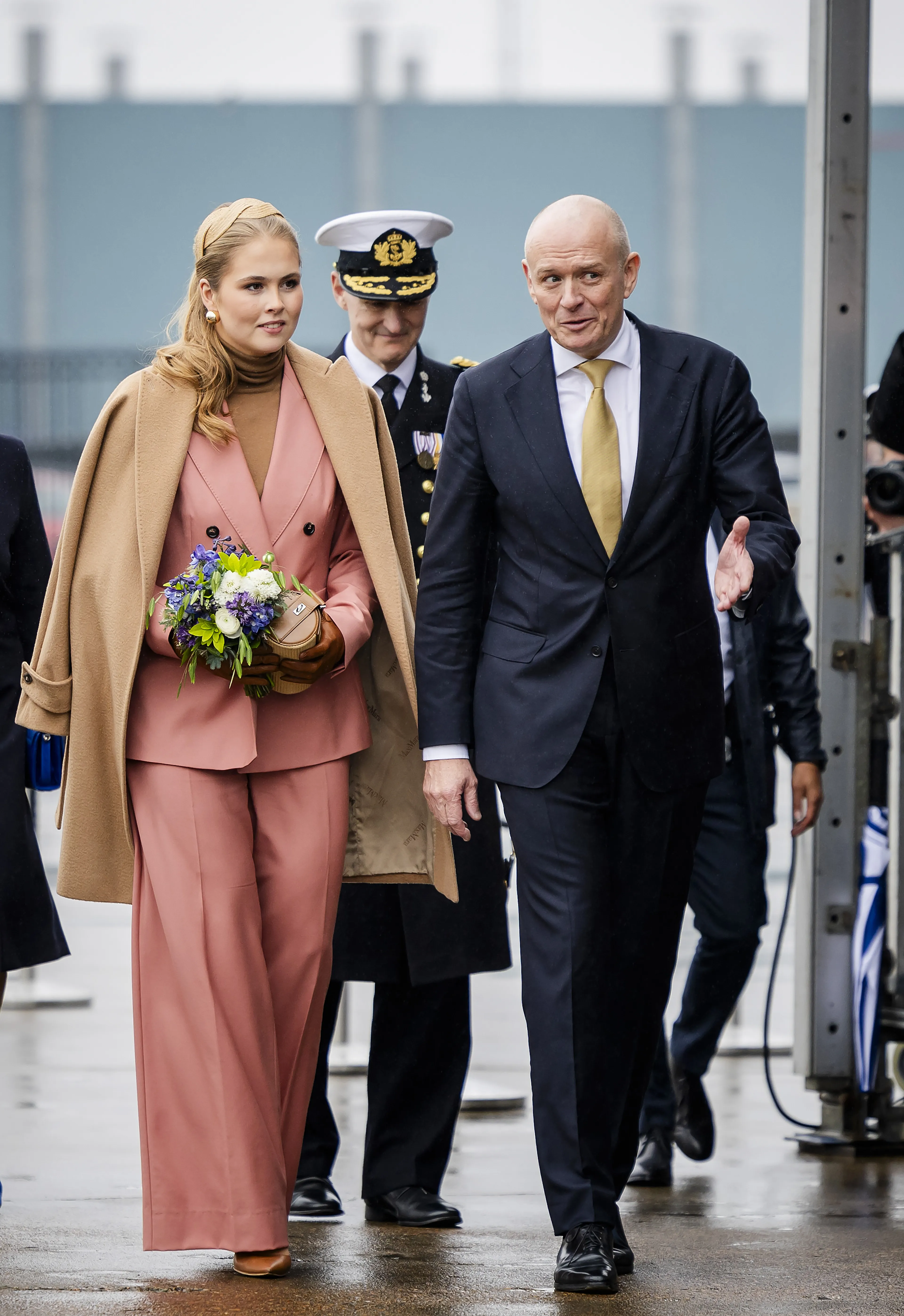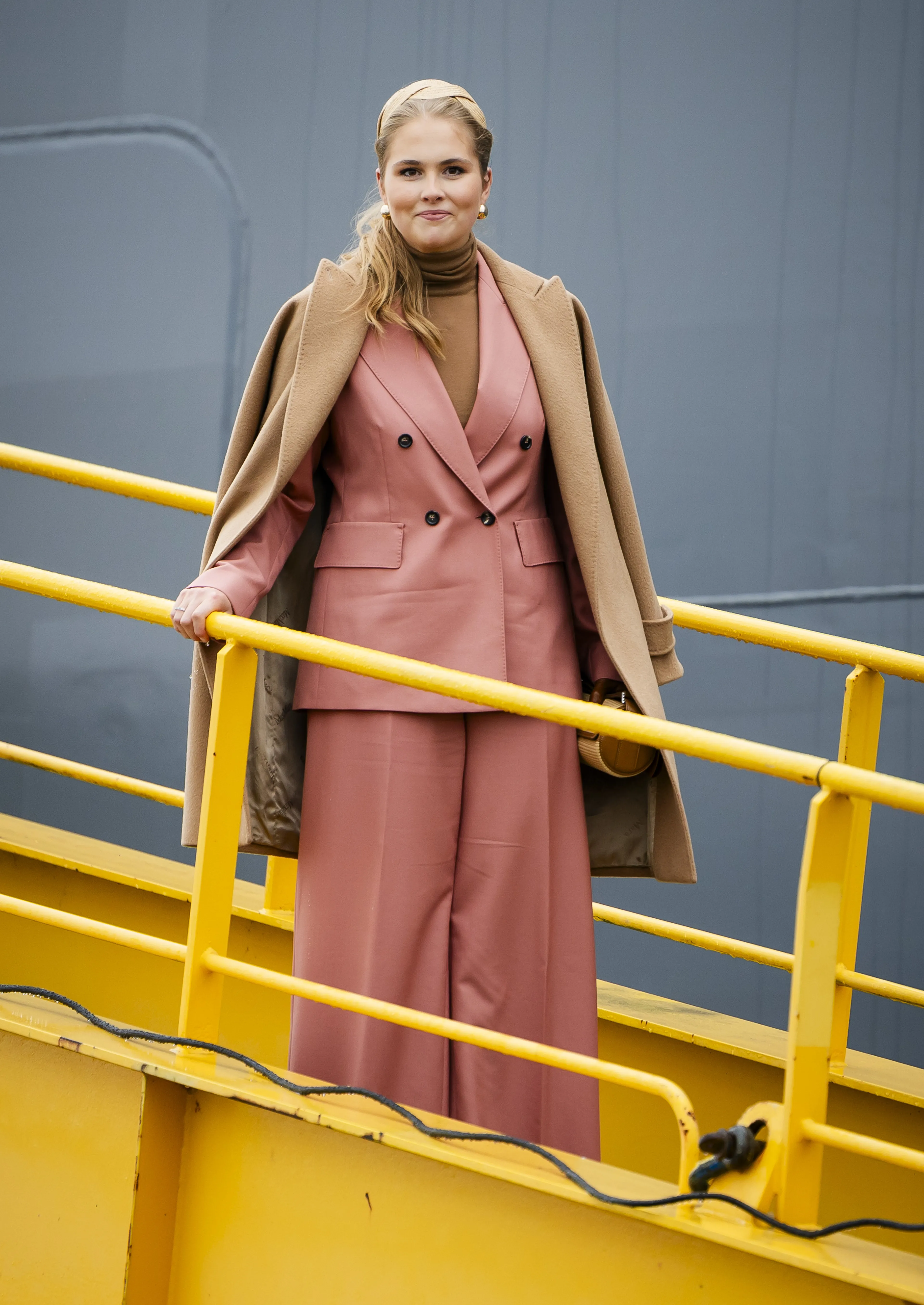 Op zaterdag 22 februari stond de eerste officiële handeling van de prinses op de agenda: het dopen van het schip 'Den Helder' in Vlissingen. Voor deze gelegenheid haalde de prinses een bekend broekpak uit haar garderobe: een roze broekpak van MaxMara. Ze combineerde deze met een beige coltrui en bijpassende beige accessoires.