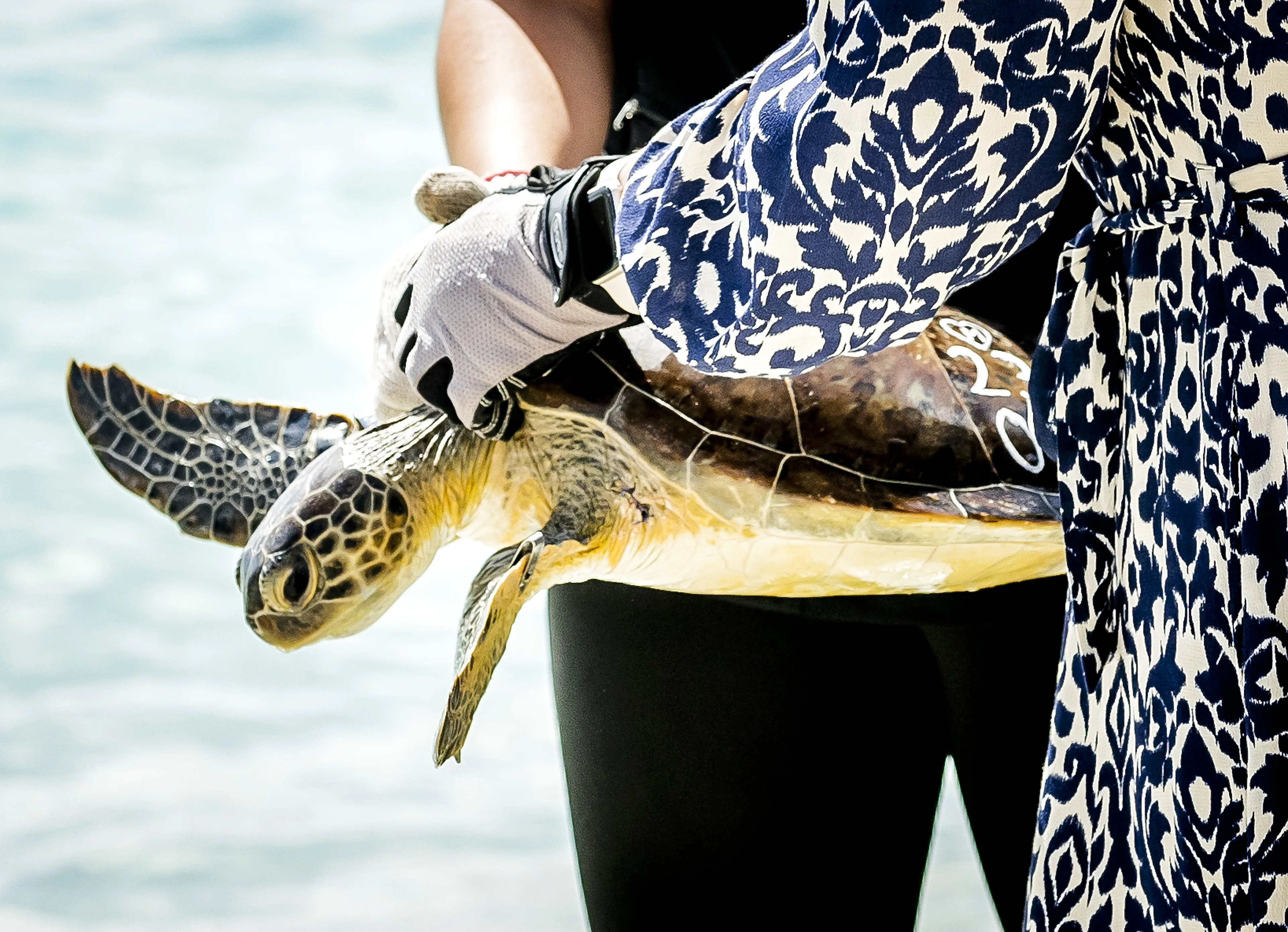 De schildpad verbleef bij Sea Turtle Conservation Curaçao en was net hersteld van vijf tumoren. Die waren waarschijnlijk veroorzaakt door vervuild zeewater. Op teenslippers - met blarenpleisters op haar enkels, vermoedelijk van de hoge hakken die ze de afgelopen dagen ook heeft aangehad - bracht Amalia het dier samen met een begeleider naar de zee.