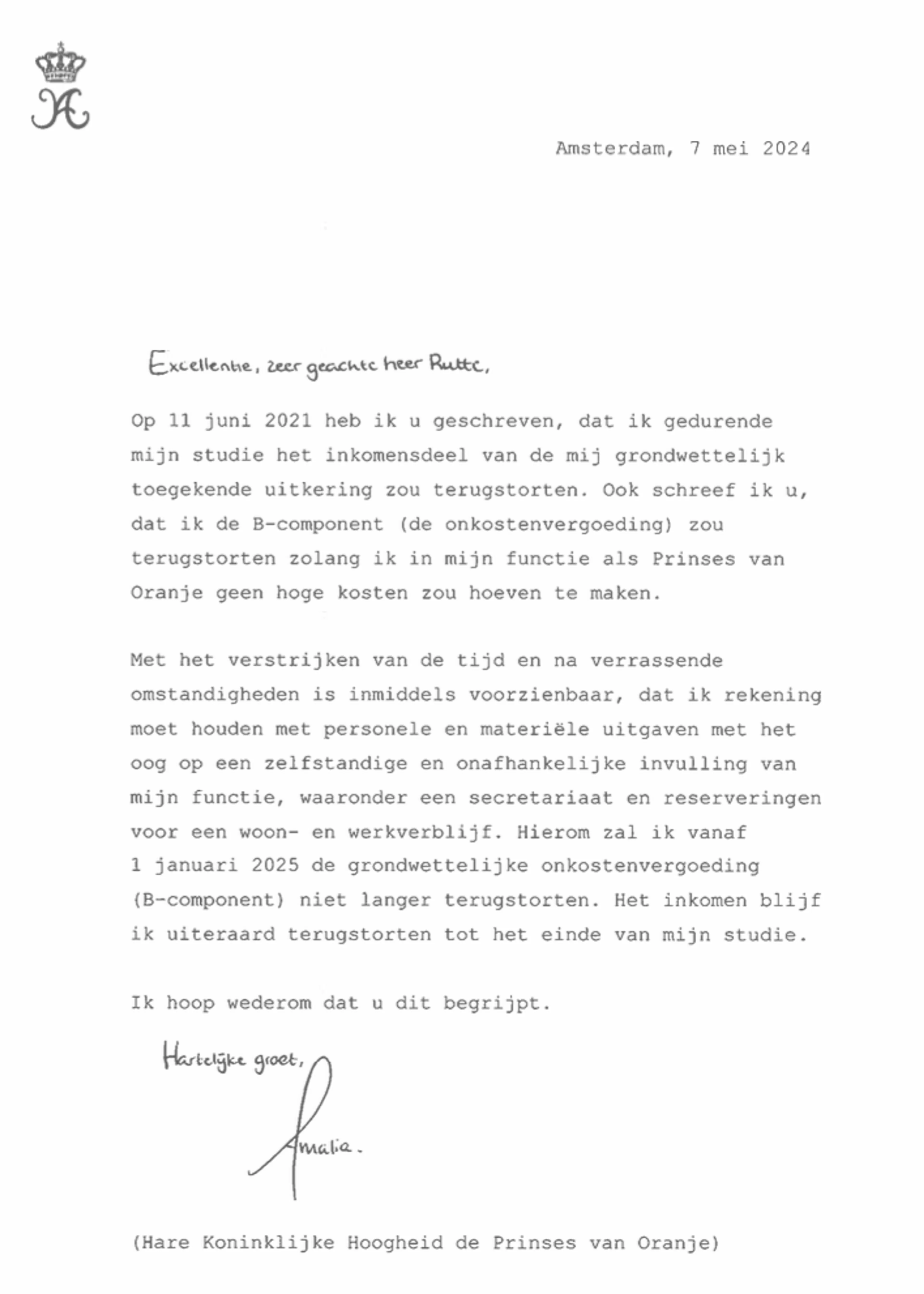 De Prinses van Oranje heeft het geld nodig voor "voorzienbare kosten die samenhangen met een zelfstandige en onafhankelijke invulling van haar functie" en voor "een secretariaat en reserveringen voor een woon- en werkverblijf". In haar bericht aan Mark Rutte schrijft prinses Amalia ook over het inkomensdeel: "Het inkomen blijf ik uiteraard terugstorten tot het einde van mijn studie". De brief van prinses Amalia aan demissionair Rutte werd gedeeld door het Het Koninklijk Huis en lees je hieronder.