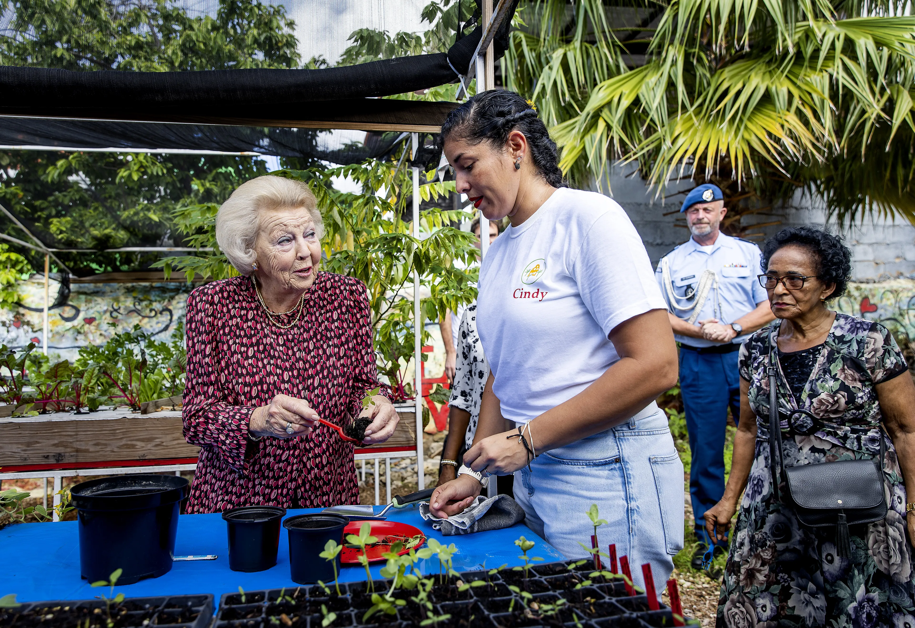 Prinses Beatrix is van 7 tot 10 november op de Caribische eilanden Curaçao en Aruba. Op de tweede dag van haar bezoek aan Curaçao bezocht de prinses onder andere een buurttuin waar ze een handje meehielp tijdens het planten.