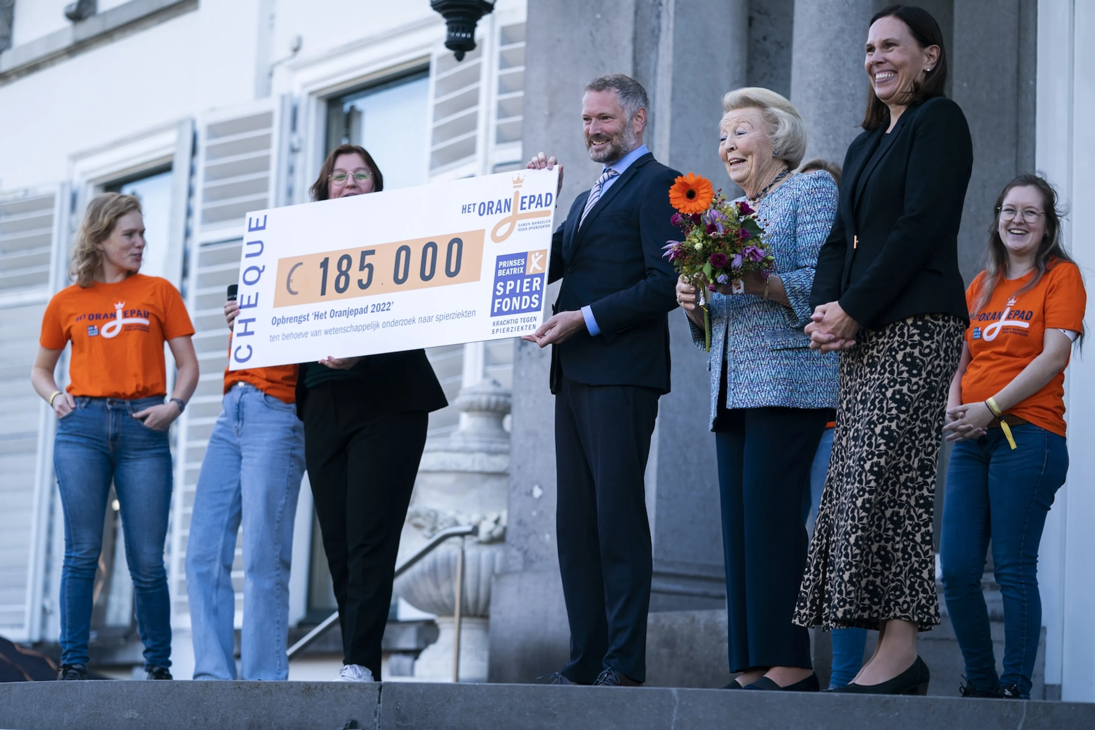 De 84-jarige Beatrix, sinds 1957 beschermvrouwe van het naar haar vernoemde fonds, was zaterdag ook getuige van de bekendmaking van de opbrengst. De prinses stond naast de grote cheque met daarop het bedrag van 185.000 euro.