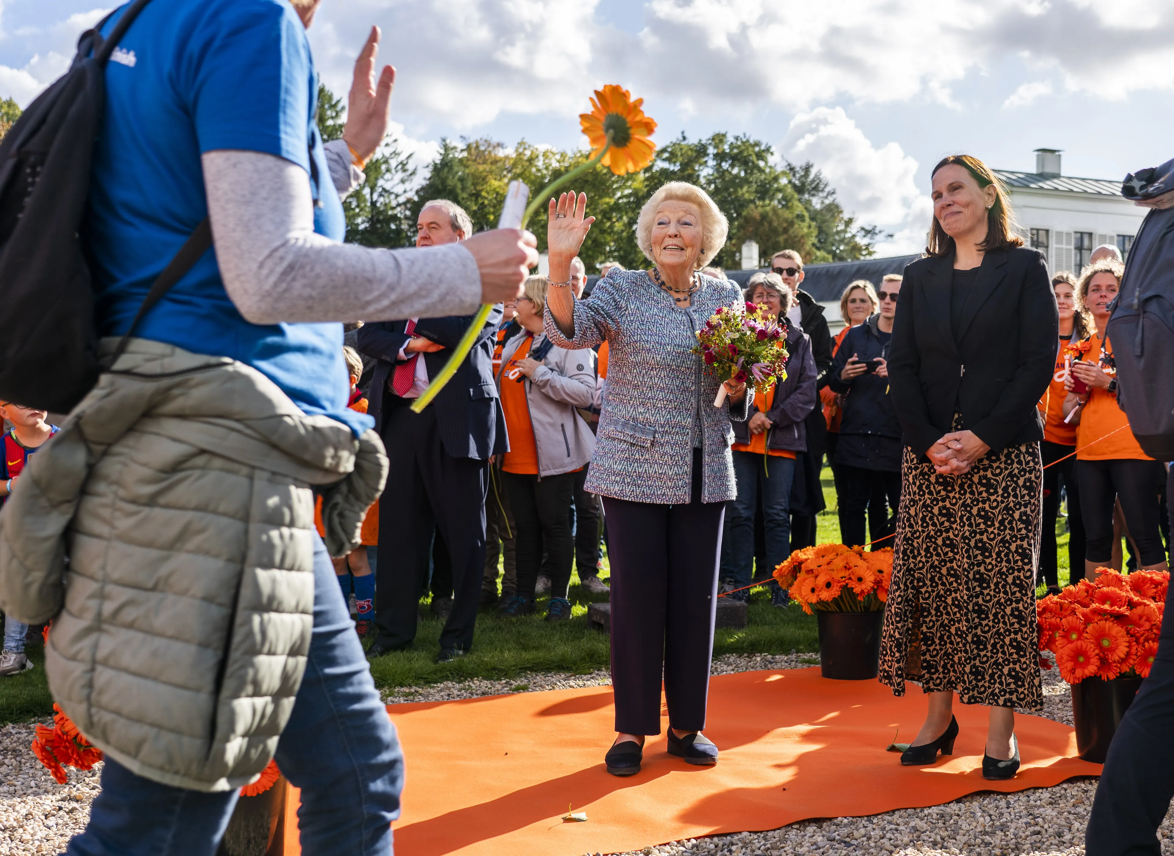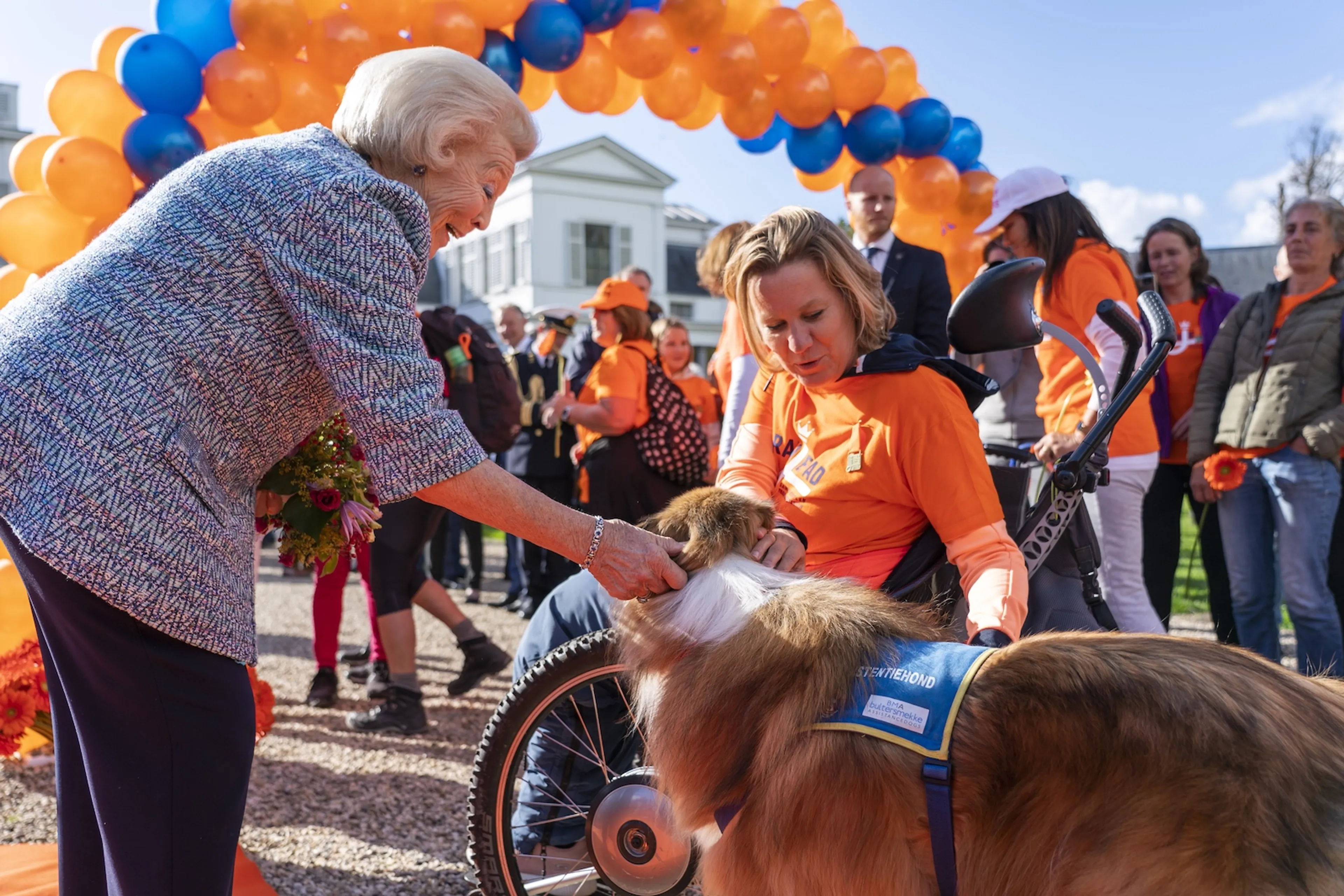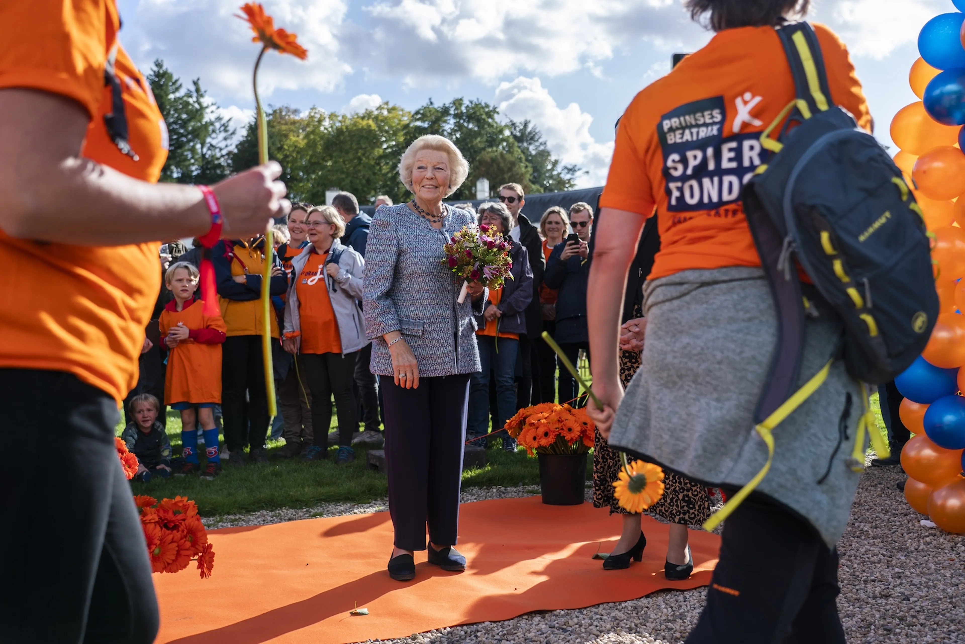 Prinses Beatrix heeft zaterdagmiddag deelnemers van de wandeling Het Oranjepad bij de finish ontmoet. De prinses trof ze bij Paleis Soestdijk in Baarn, het eindpunt van de route om aandacht te vragen voor de strijd tegen spierziekten.