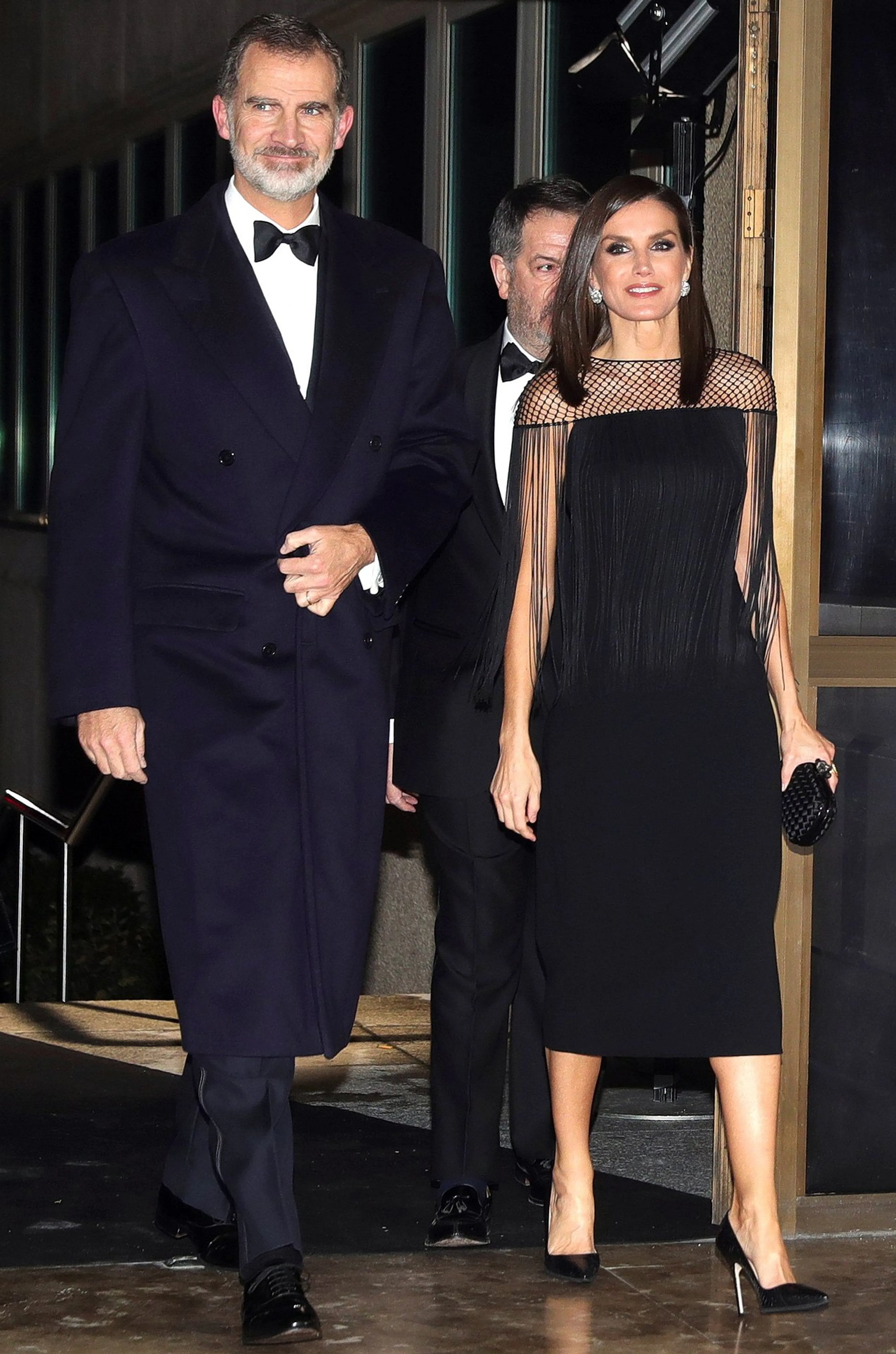 Zwart is stijlvol en heel geschikt voor het kerstfeest, want je slaat met een zwarte look niet snel de plank mis. De Spaanse koningin Letizia zien we dan ook regelmatig in een zwarte jurk, zoals deze met gaas-effect aan de bovenkant.