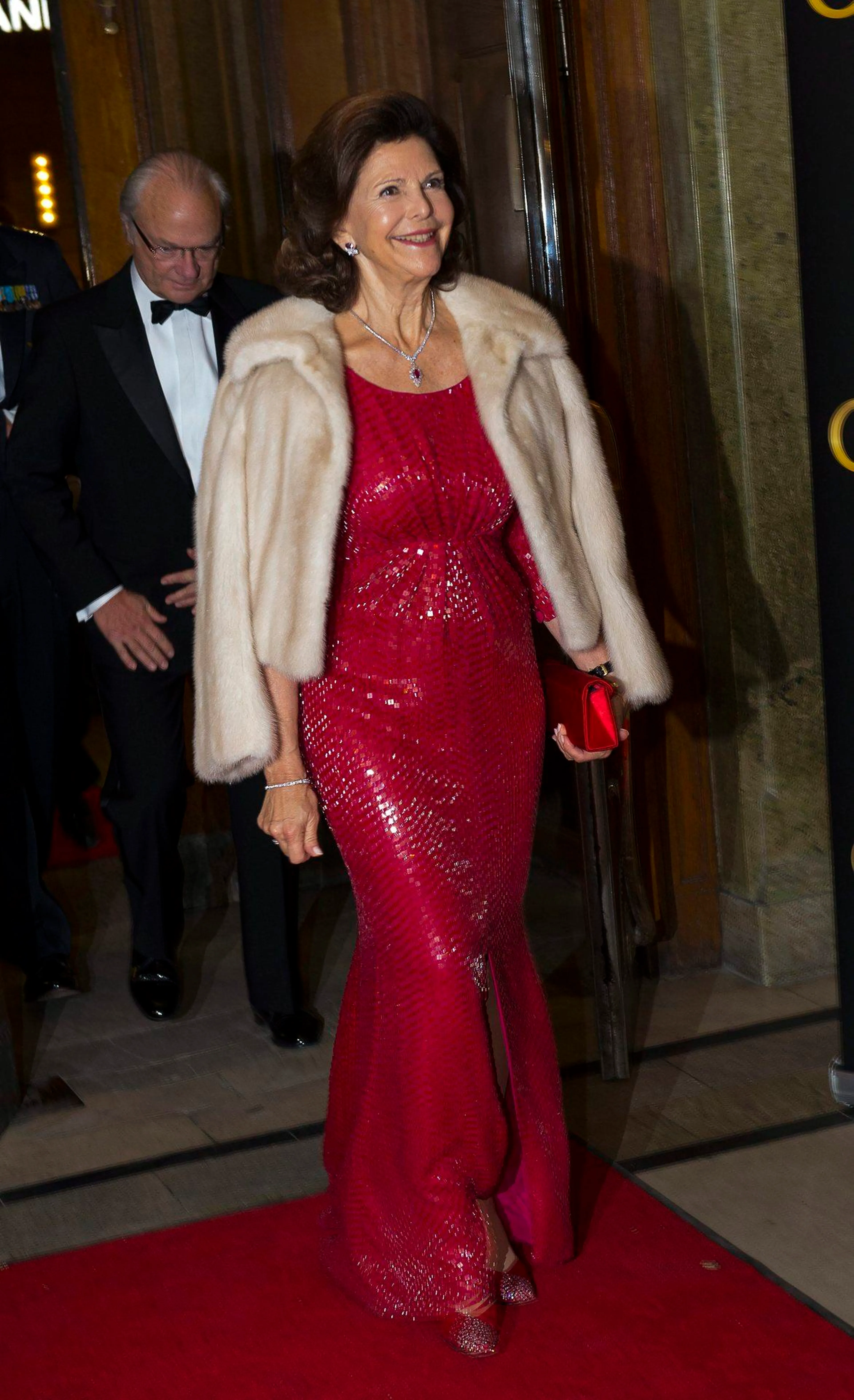 Een glanzende outfit tijdens kerst is altijd een goed idee. In 2013 werd koningin Silvia zeventig jaar en vierde dit met een gala. De Zweedse koningin verschijnt op die dag in een glanzende rode jurk waarmee ze straalt op de rode loper.