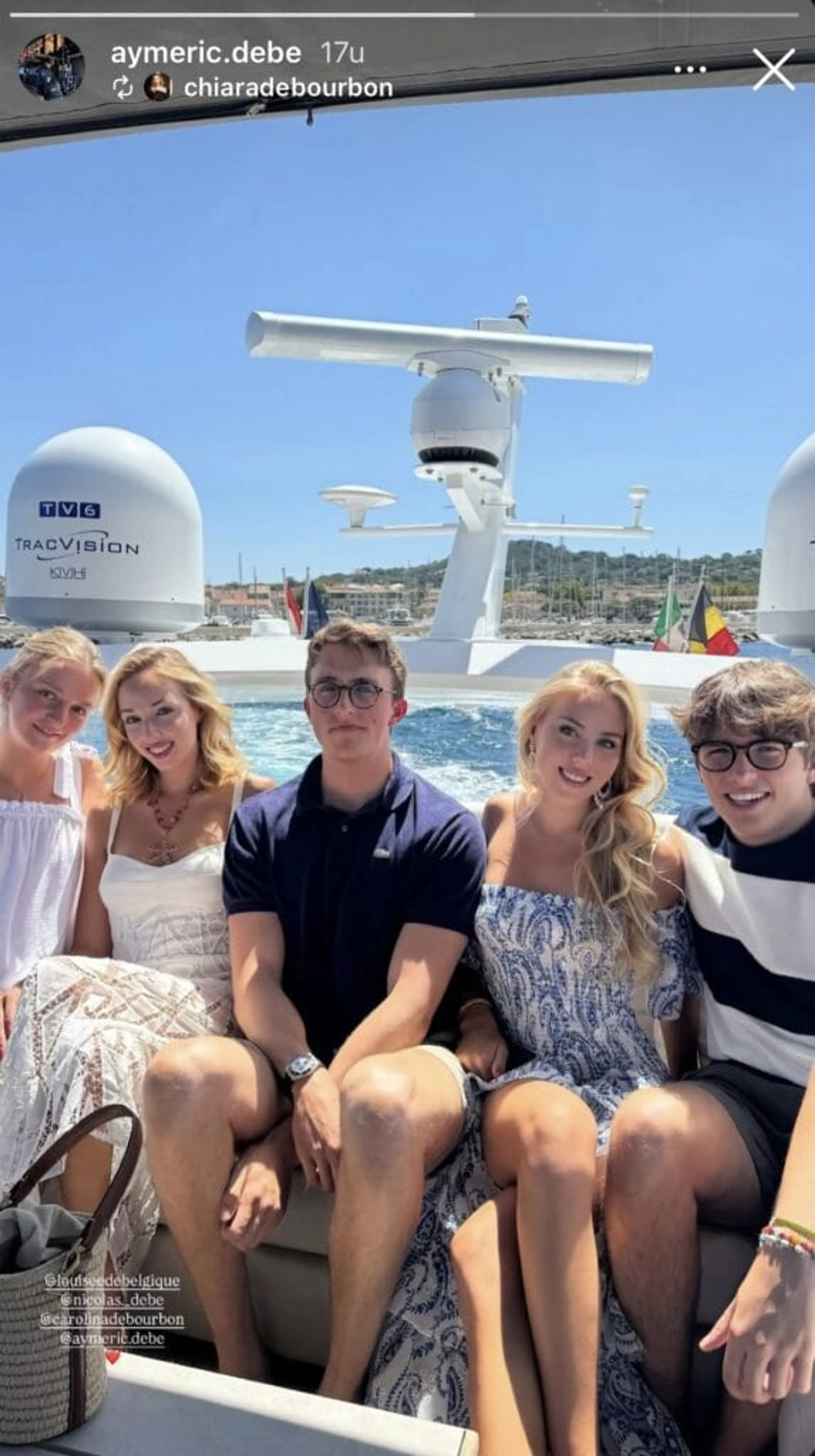 De Belgische prins Aymeric is momenteel in Saint-Tropez. De 19-jarige zoon van prins Laurent en prinses Claire is daar al een tijdje, want hij vierde daar de Nationale Feestdag van België. Dat liet hij zien op social media. Maar Aymeric is daar niet alleen, want hij wordt vergezeld door zijn tweelingbroer prins Nicolas en zijn zus prinses Louise (21). Niet alleen de Belgische royals zijn er, ze zijn gespot met prinses Carolina en prinses Chiara van Bourbon van Twee Siciliën, een adellijke familie. Op Instagram delen Chiara en Aymeric een story waar het vijftal te zien is op een snelle boot.