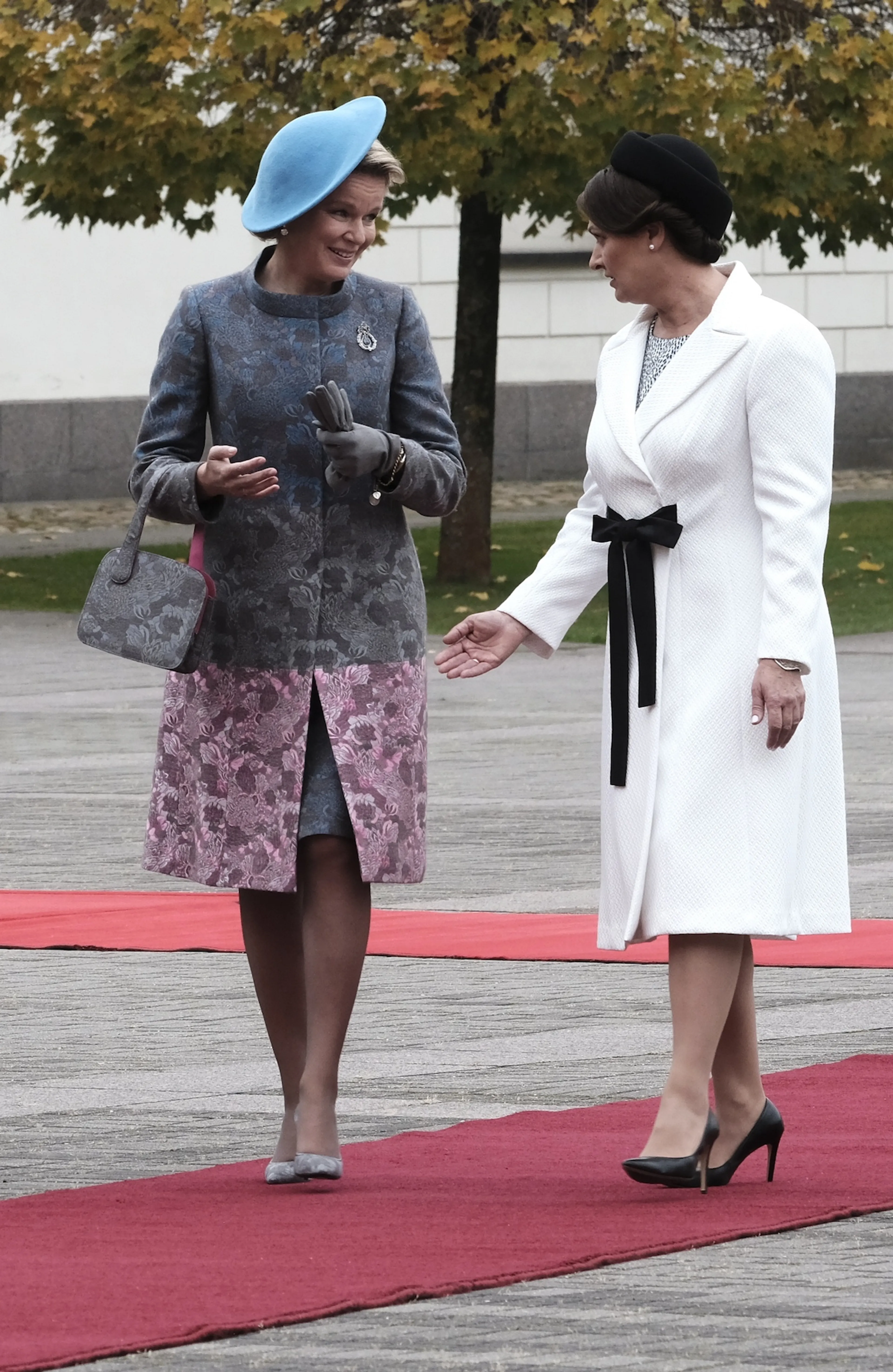 Kijk: Koningin Mathilde start staatsbezoek Litouwen in nieuwe outfit