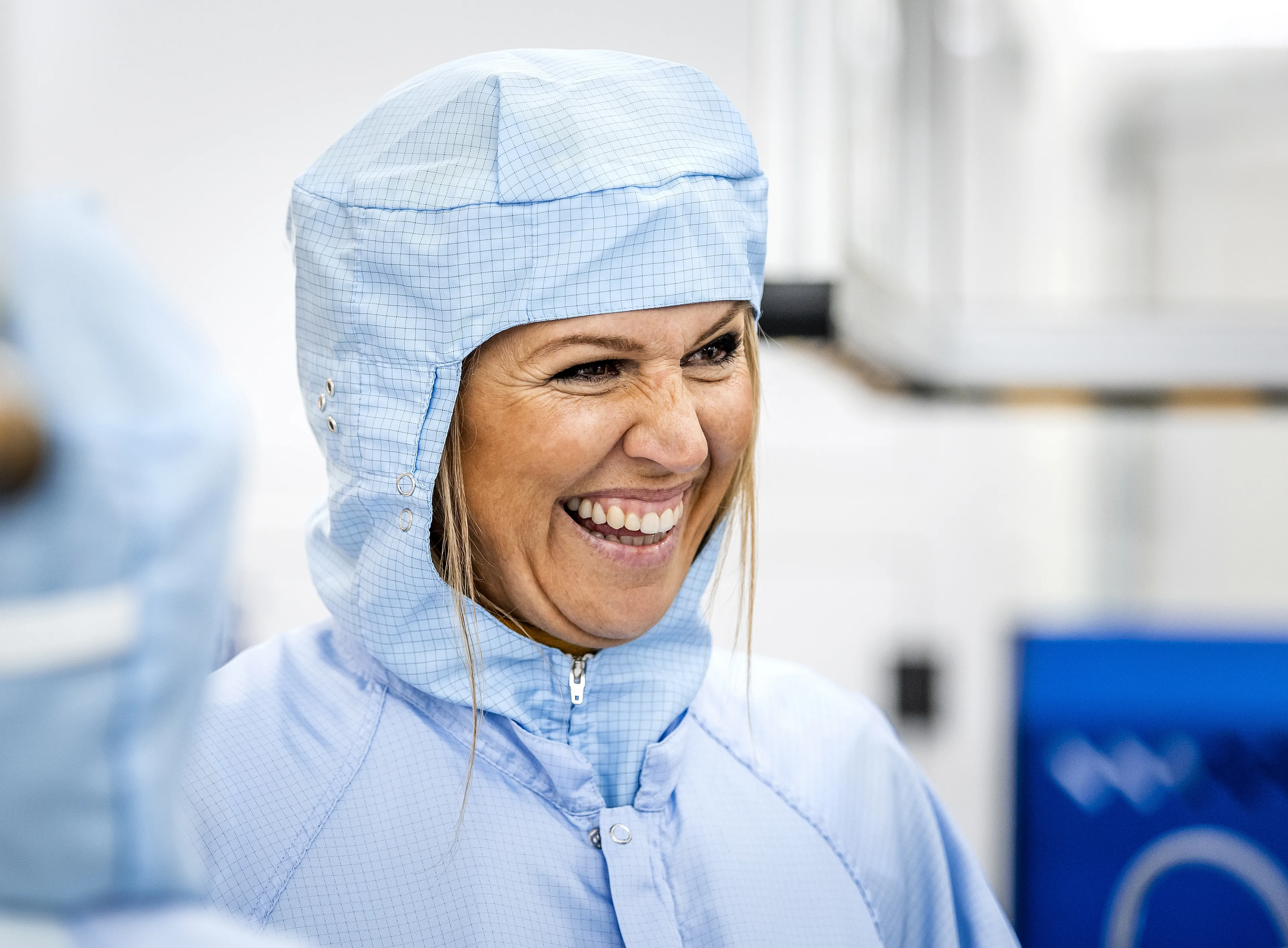 Ook voor dit futuristische werkbezoek aan de Technische Universiteit Eindhoven kiest koningin Máxima voor een bijpassende outfit. Dat doet ze niet geheel vrijwillig want voor het lab waar de koningin uitleg krijgt over bepaalde materialen, is een beschermende outfit verplicht. Maar gelukkig is onze koningin de beroerdste niet en trok ze het beschermende pak zo over haar gele outfit heen. En eerlijk gezegd, laat koningin Máxima zelfs een beschermend pak er modieus uitzien.