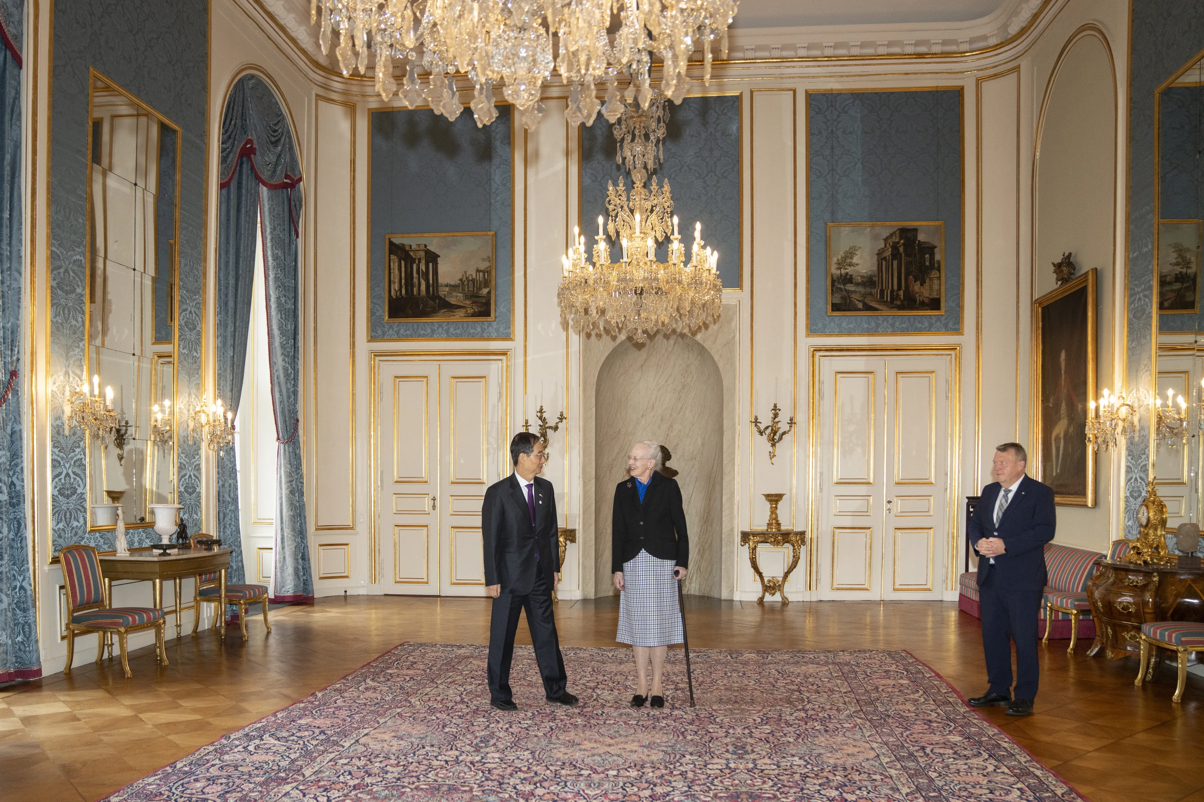 Koningin Margrethe houdt als (bijna) elke vorst elk jaar een kersttoespraak. Daarvoor kiest ze een kamer met wit-gouden deuren, met op de achtergrond een kleurrijk tapijt, dat vergelijkbaar is met het exemplaar dat in de grote hal hangt.