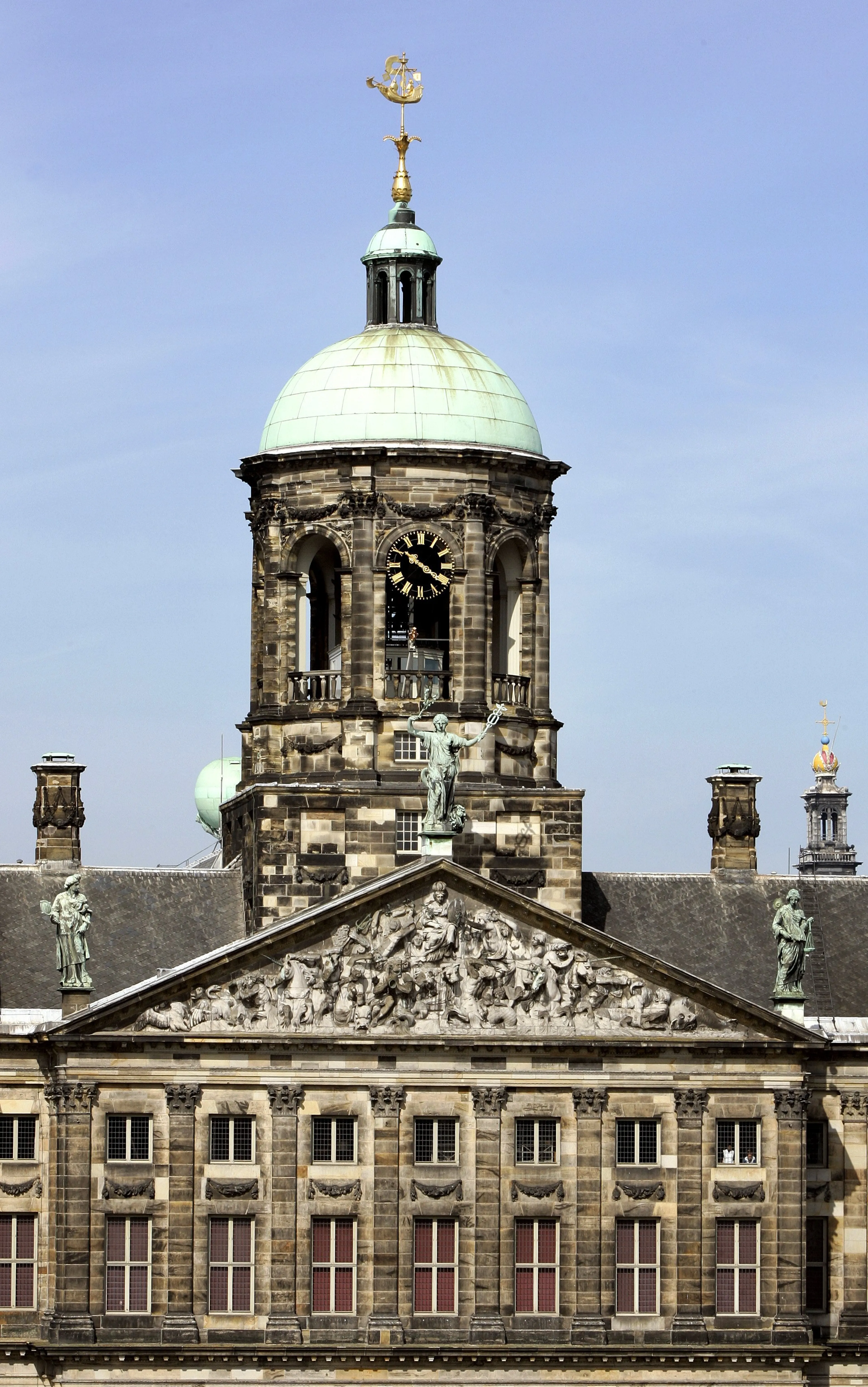 Opvallend aan het paleis is de groene koepel boven de middenpartij. Vanuit deze koepel kon men vroeger de aankomst van de schepen op het IJ zien. Bovenop de koepel bevindt zich een windvaan in de vorm van een koggeschip, het oude symbool van de stad Amsterdam. Deze windvaan is recentelijk voor het eerst 100 jaar van het dak gehaald, vanwege een restauratie van het dak. Dit kunstwerk en andere attributen waren door de restauratie een tijd lang te bewonderen voor publiek. Achter de koepel, aan de achterkant van het paleis, bevindt zich een beeld van Atlas.