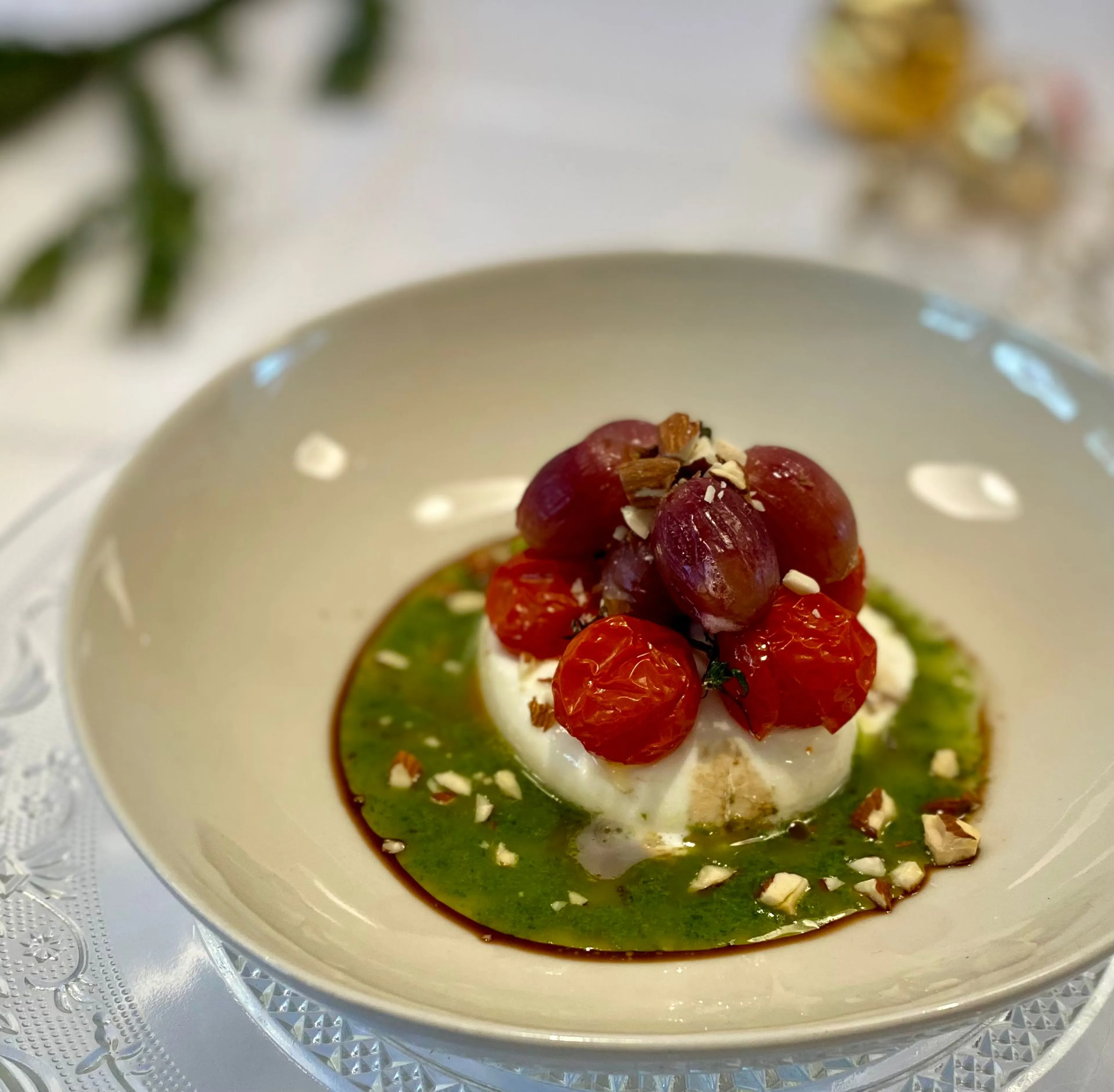 Tip van de chef: het is lekker om het voorgerecht te serveren als de tomaten en druiven nog warm zijn.