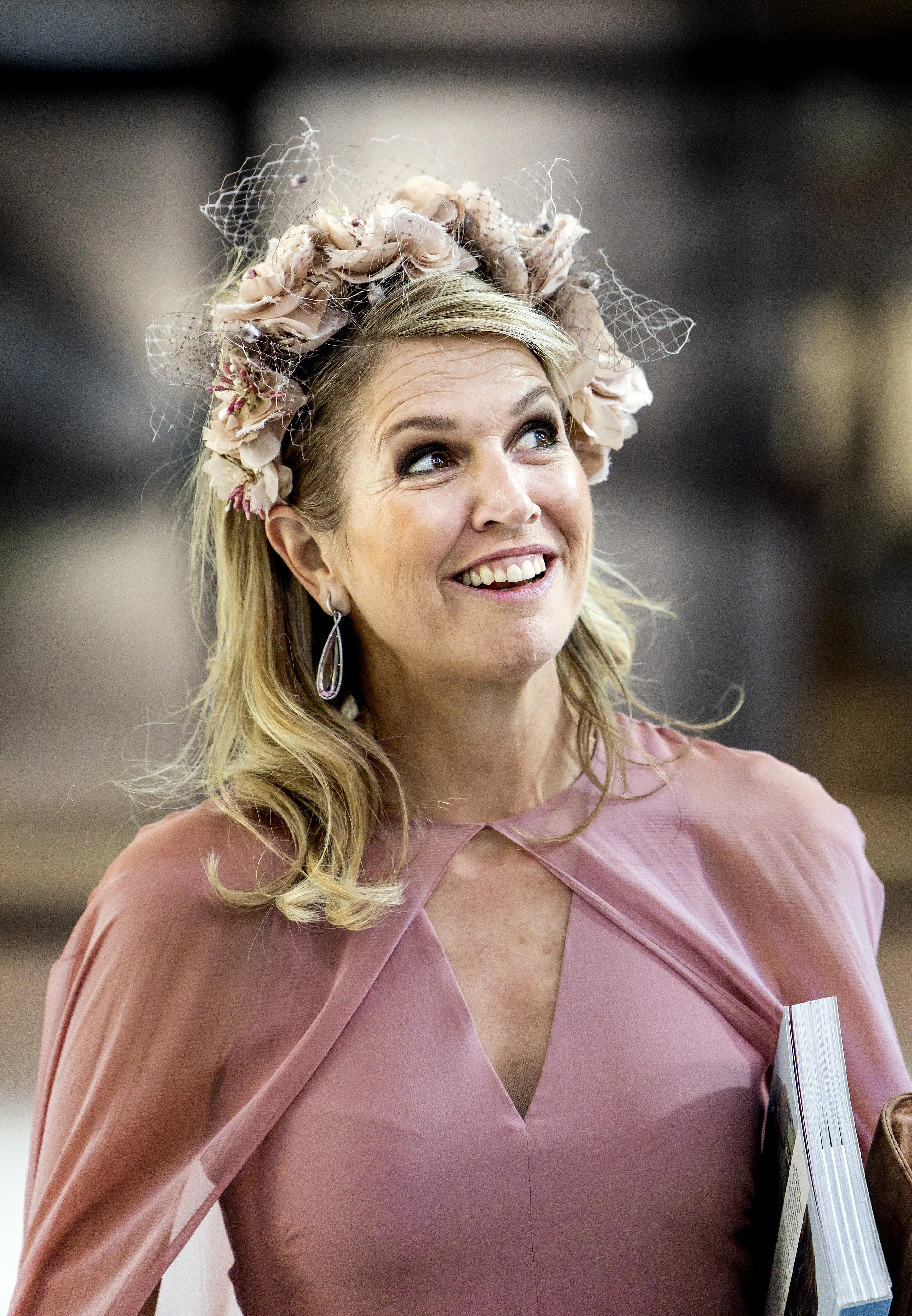 Koningin Máxima heeft nog een accessoire met handgemaakte bloemen in haar garderobe liggen, namelijk een lichtroze bloemenkrans. Het ontwerp is van hoedenontwerper Berry Rutjes. Een opvallende haarband die een en al lente uitstraalt.