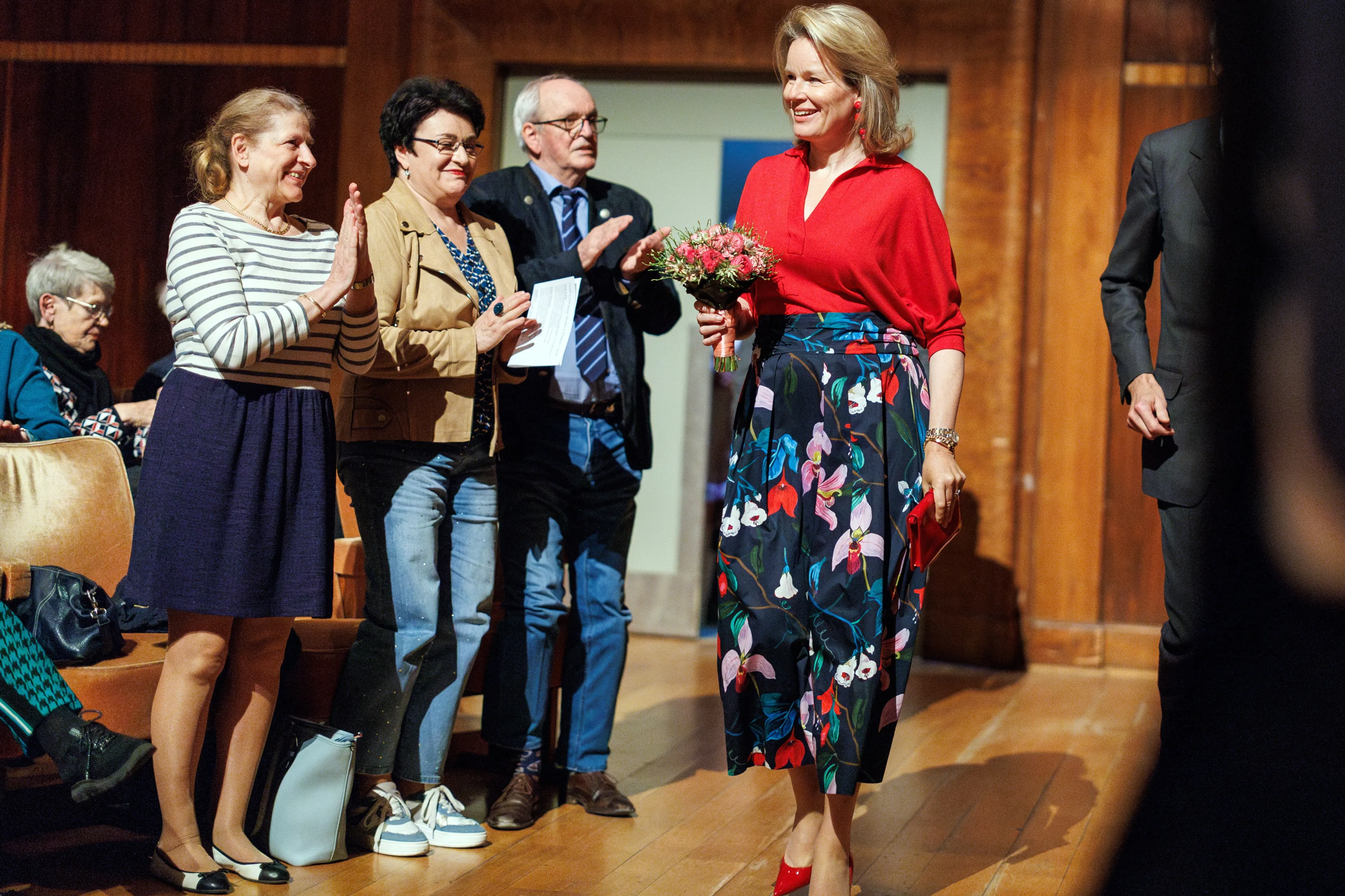 Koningin Mathilde heeft een aantal fleurige items in haar kast hangen. Zo haalt ze ook deze lente weer een exemplaar tevoorschijn. Het ontwerp van de maxi rox met tropische bloemendessin is van – hoe kan het ook anders – Mathilde's favoriete modehuis Natan.