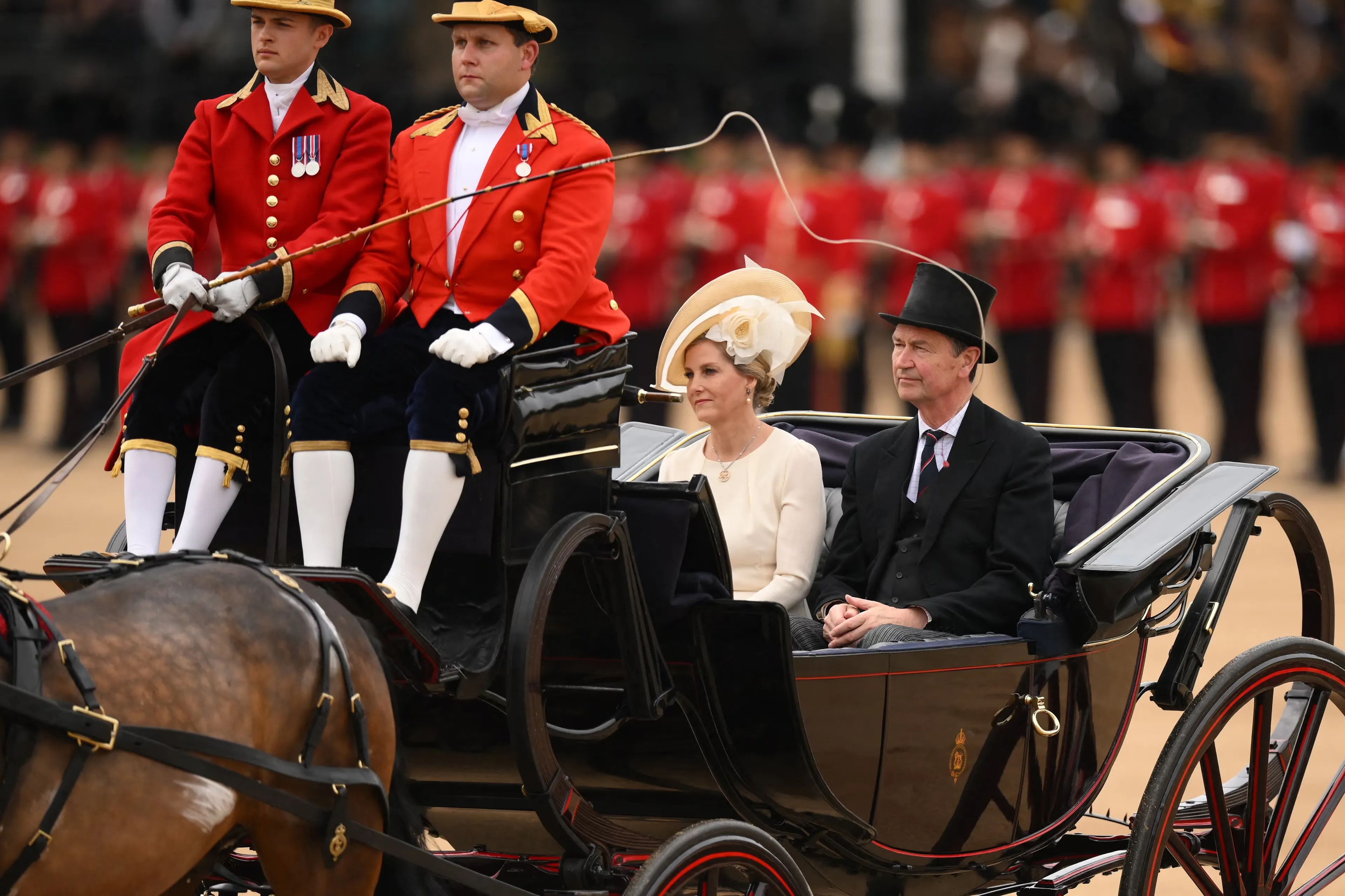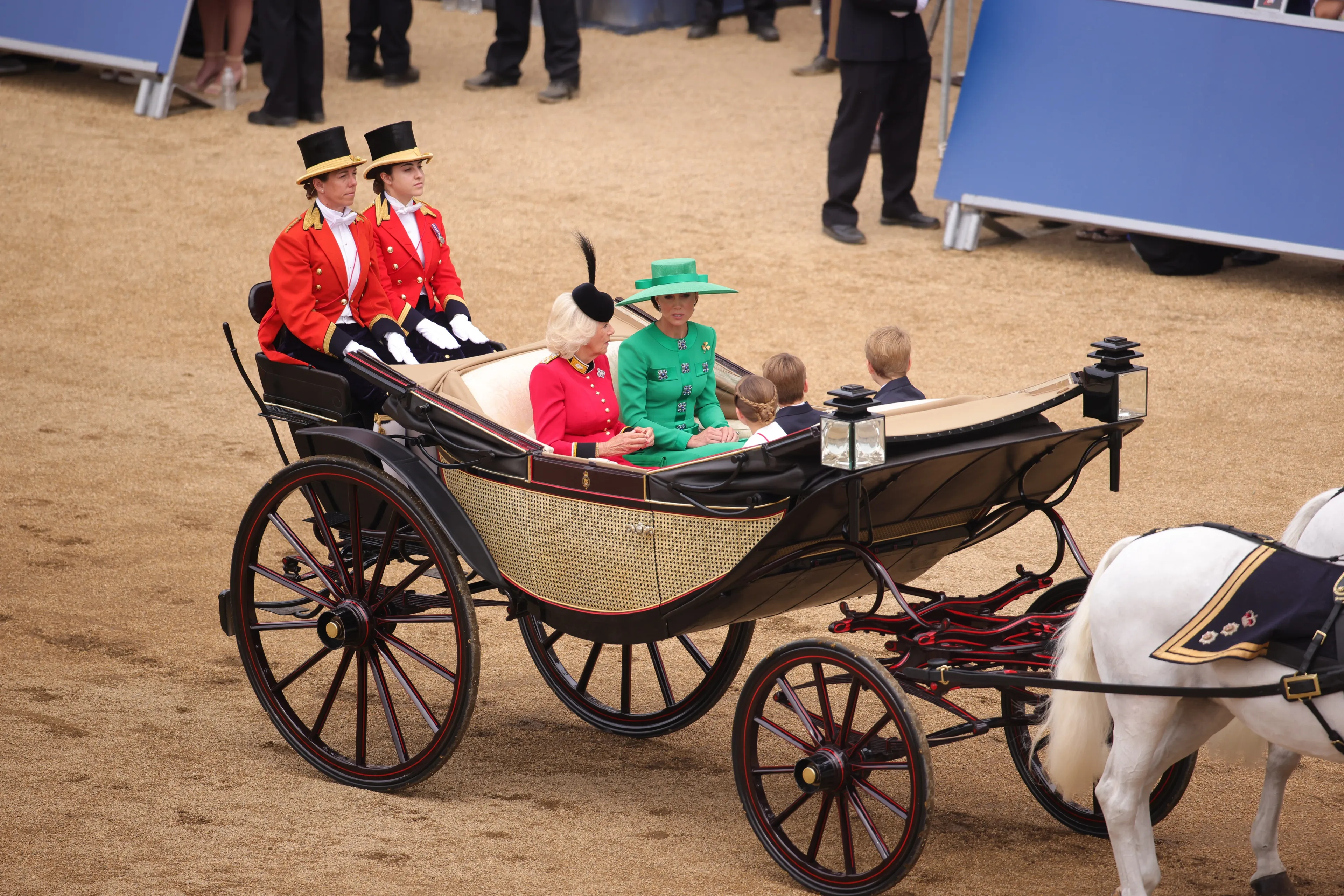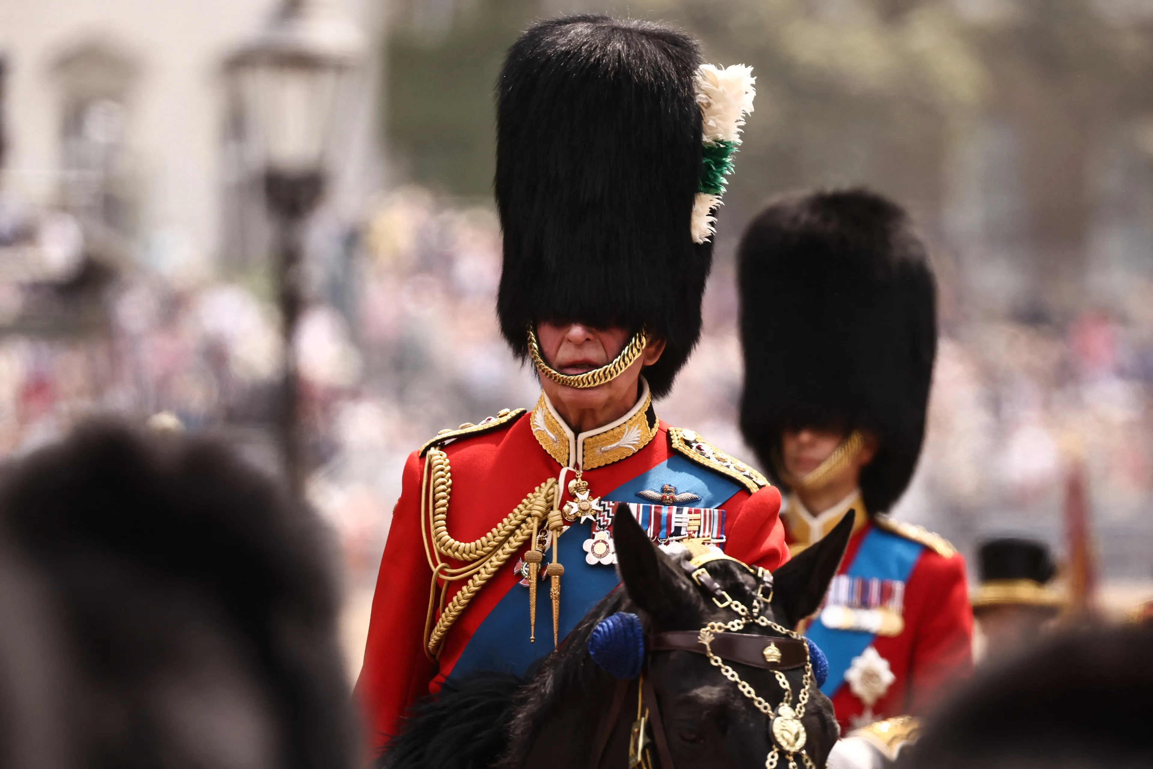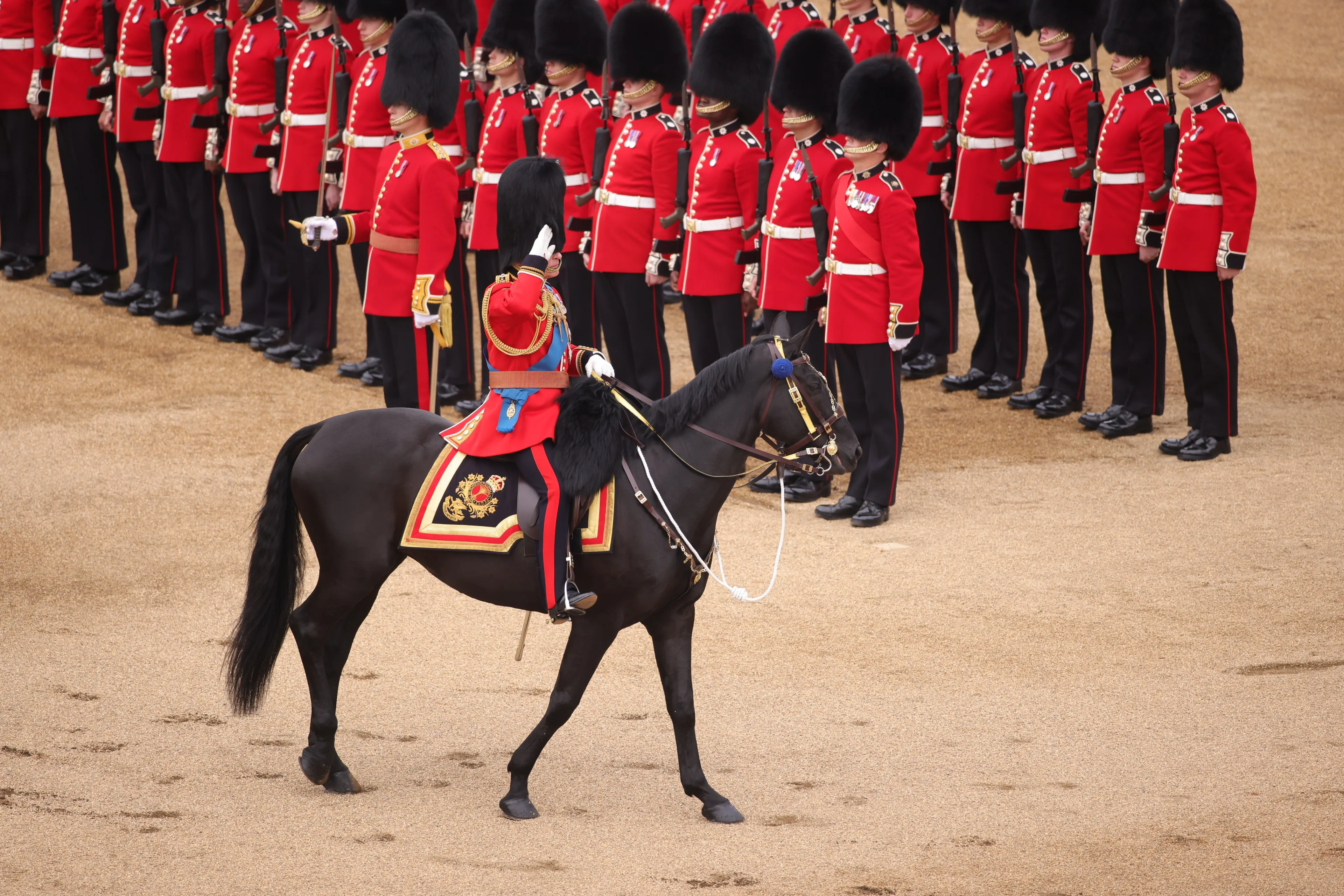 Koning Charles heeft te paard deelgenomen aan Trooping the Colour. Het was de eerste keer in 37 jaar dat een monarch op een paard zat tijdens de ceremonie. Koningin Elizabeth deed dit in 1986 voor het laatst, toen zij zestig was. Sindsdien nam ze deel aan de ceremonie in een koets.