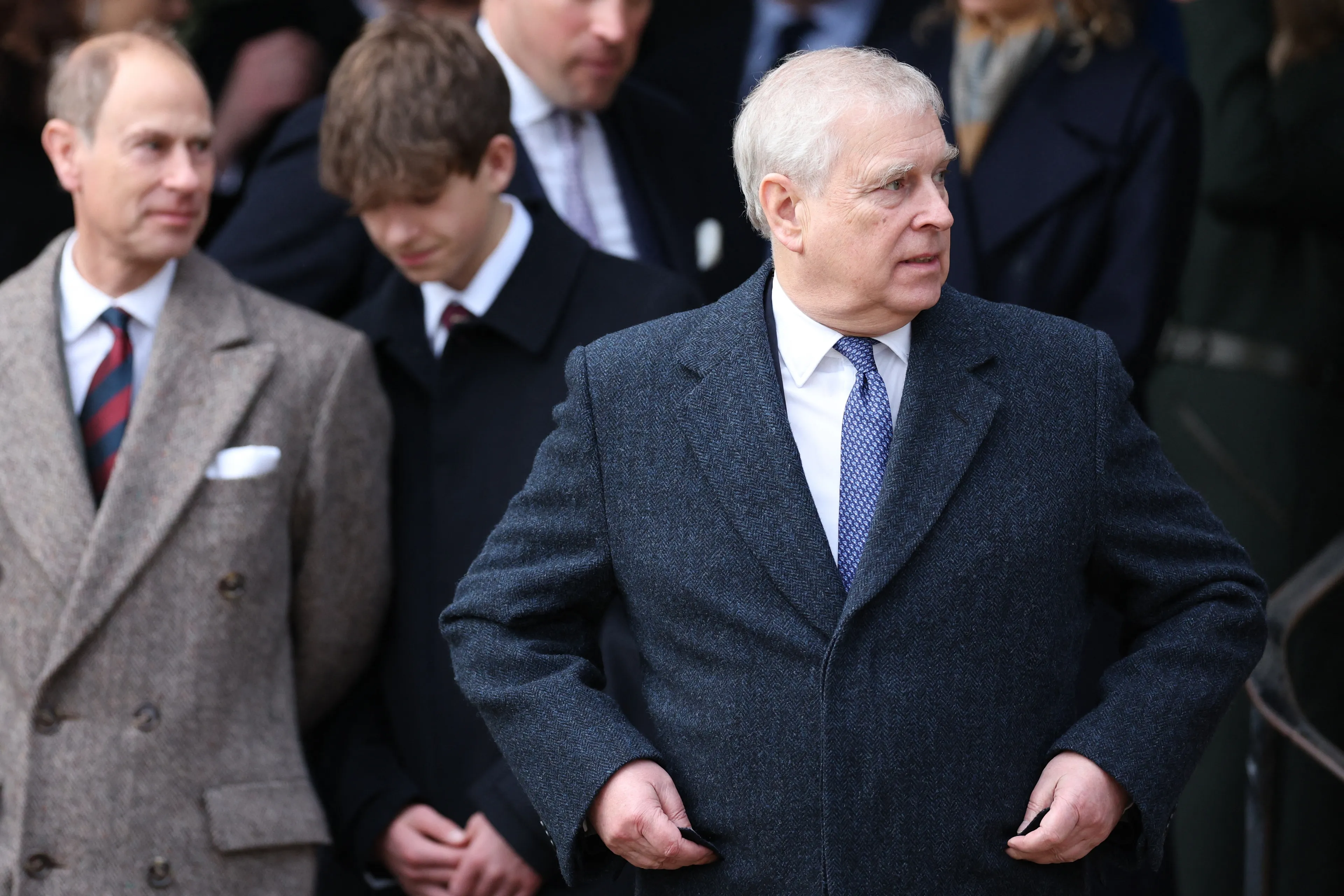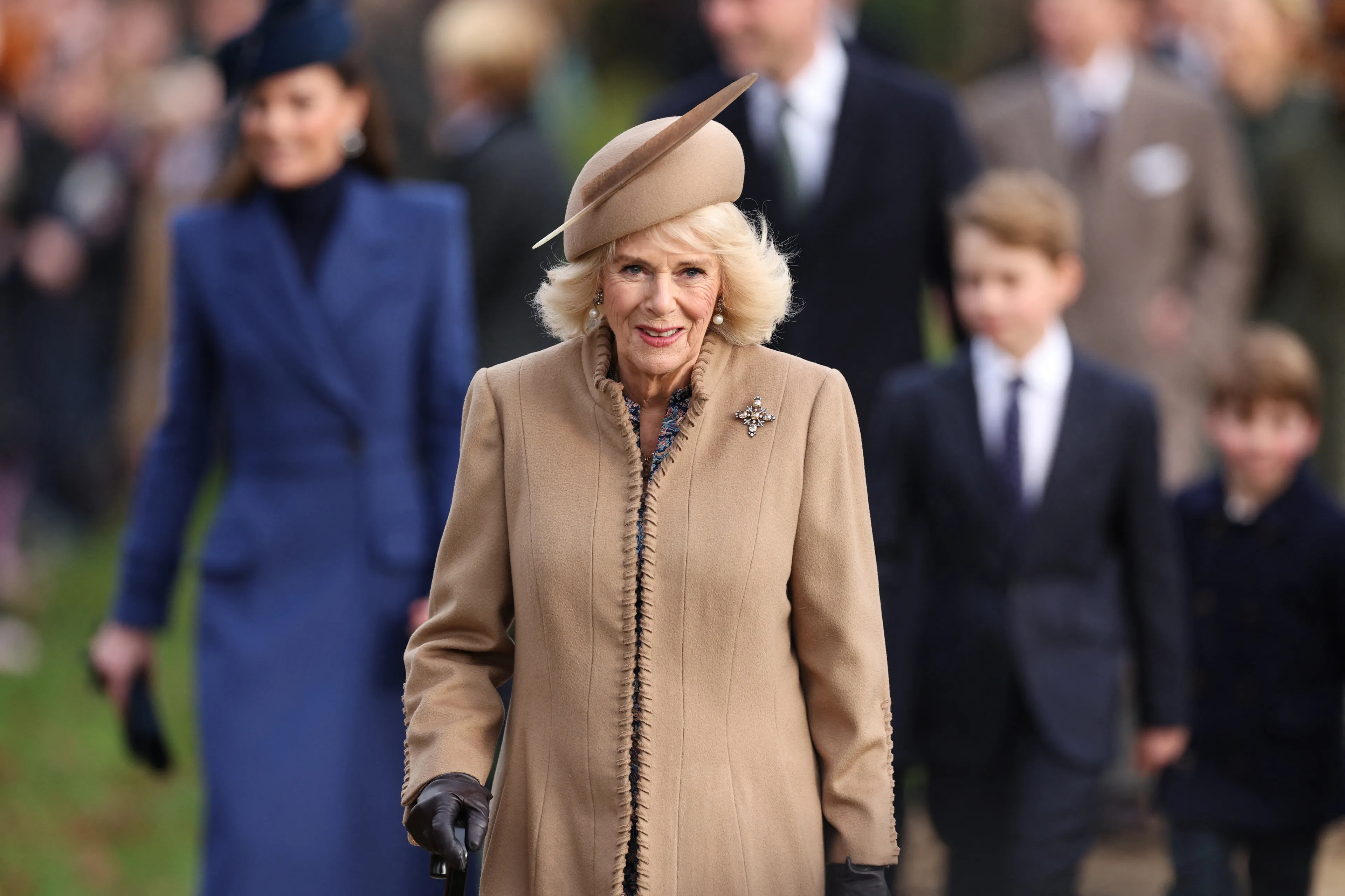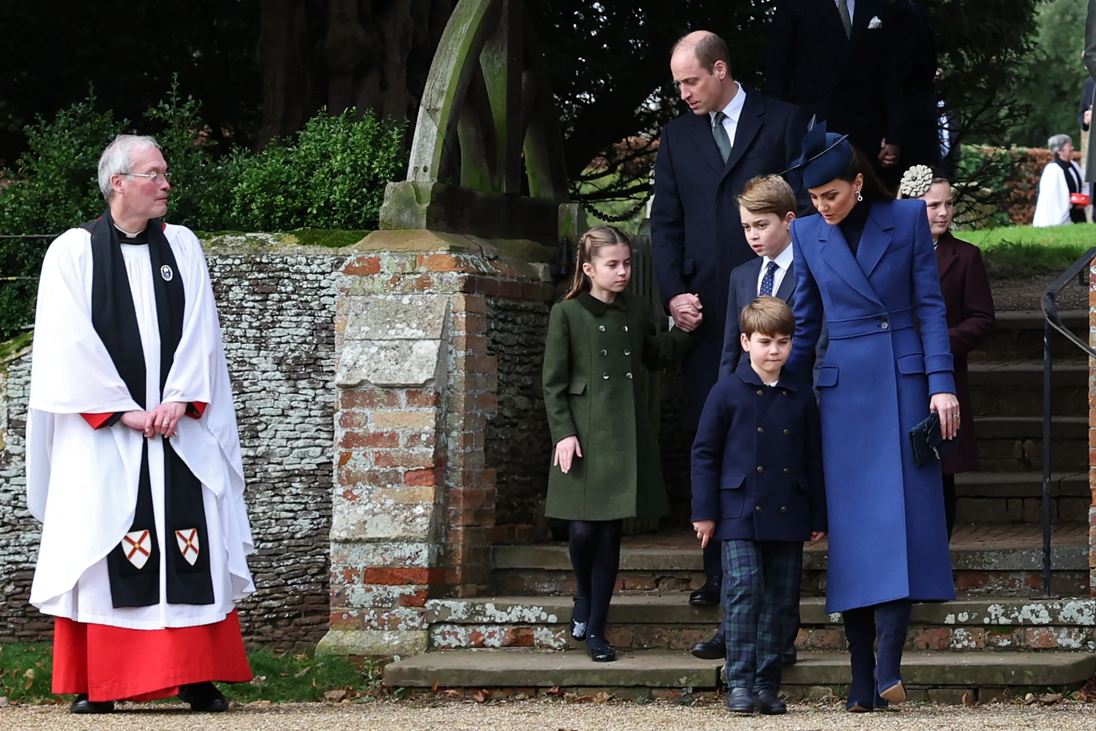Prins William, zijn vrouw Catherine en hun drie kinderen George, Charlotte en Louis vergezelden het Britse koningspaar op Sandringham. Ook zagen we prins Andrew met zijn twee dochters Beatrice en Eugenie, en hun echtgenoten Edoardo en Jack. Opvallend was de komst van Sarah Ferguson, de ex-vrouw van prins Andrew. Verder waren ook prinses Anne en haar echtgenoot Timothy Laurence erbij. Charles' jongste broer prins Edward was eveneens van de partij. Hij arriveerde samen met zijn vrouw Sophie, dochter Louise en zoon James.