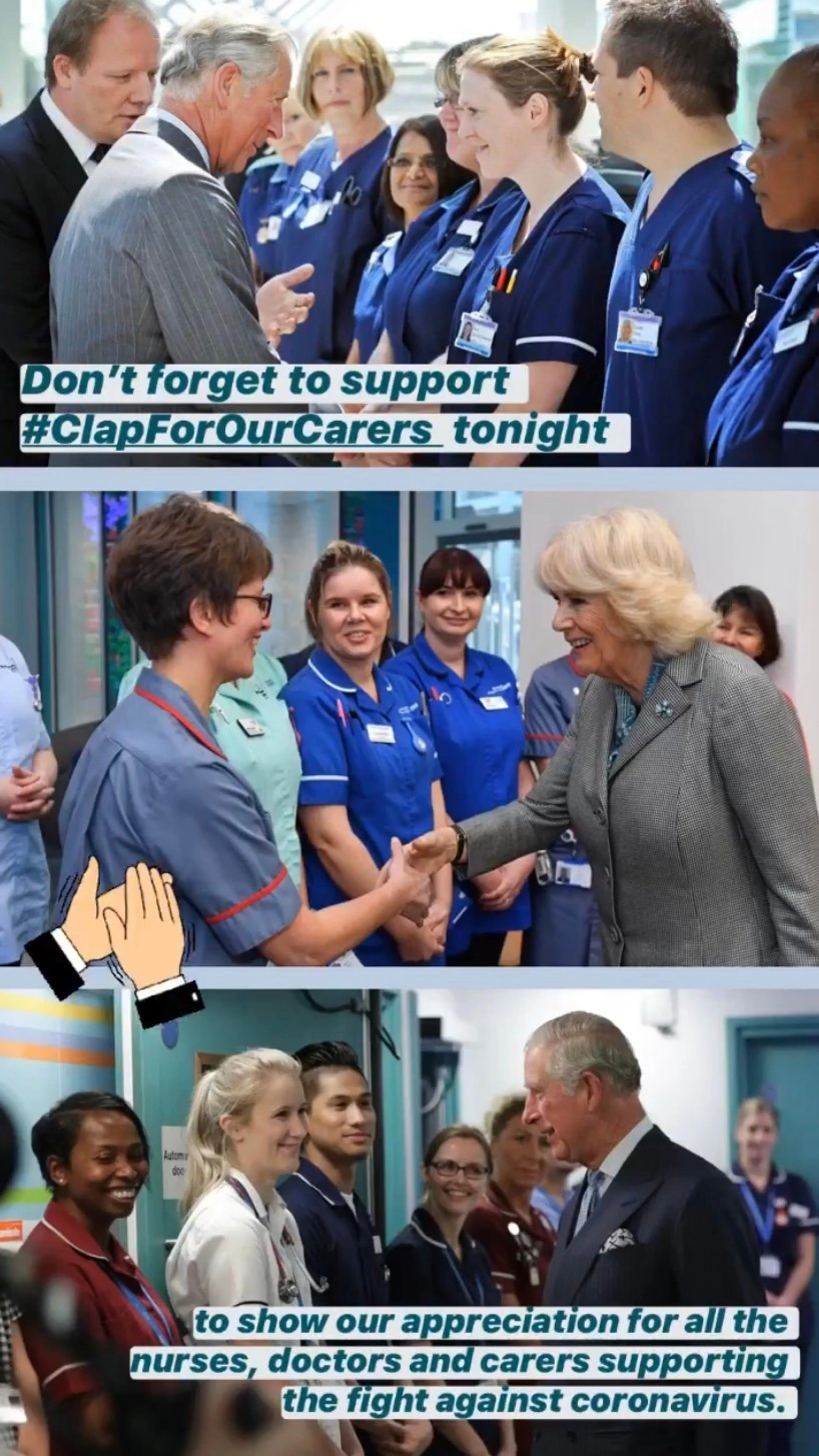Ook Charles en Camilla uiten hun steun voor de actie door verschillende foto's te delen van het stel met zorgmedewerkers op Instagram: "Wij waarderen alle verplegers, dokters en andere zorgmedewerkers die meewerken in de strijd tegen het coronavirus".