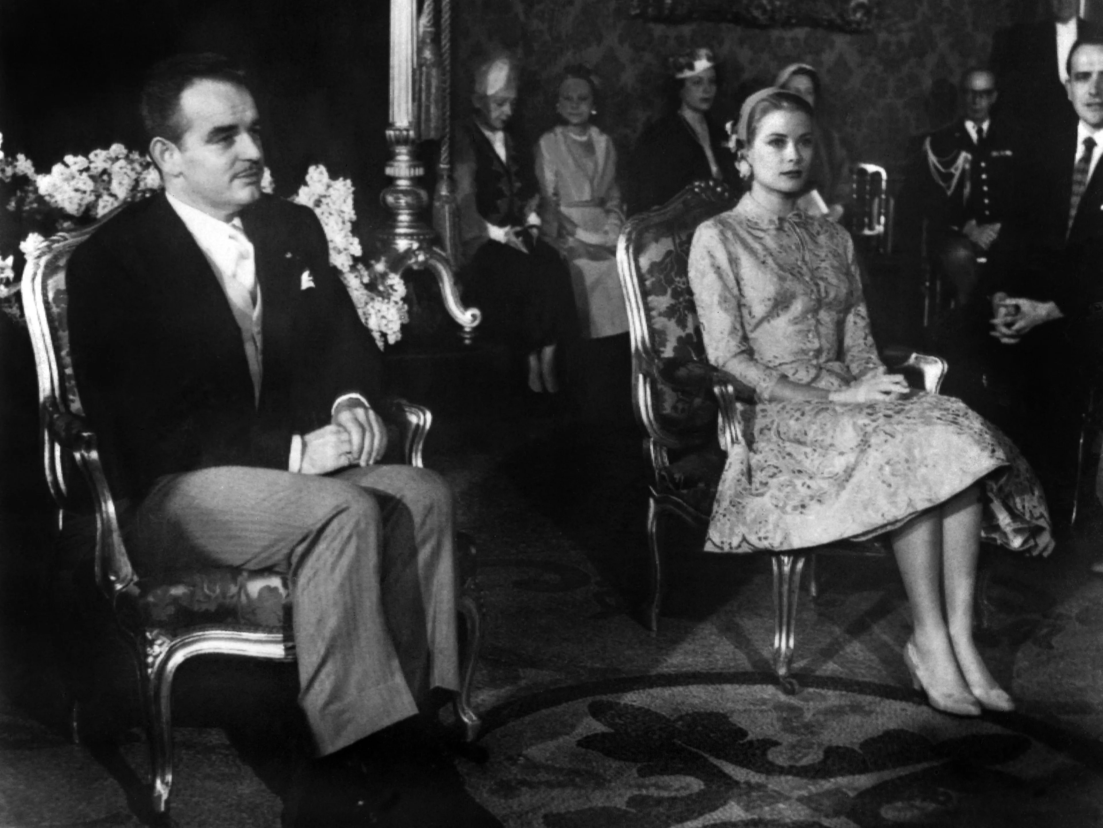 Op 18 april trouwen prins Rainier en Grace Kelly met elkaar voor de wet. Dat gebeurt middels een burgerlijke ceremonie in de troonzaal van het paleis in Monaco. Voor de burgerlijke ceremonie draagt Grace een kanten set bestaande uit een rok met een bijpassende jasje en hoofddeksel.