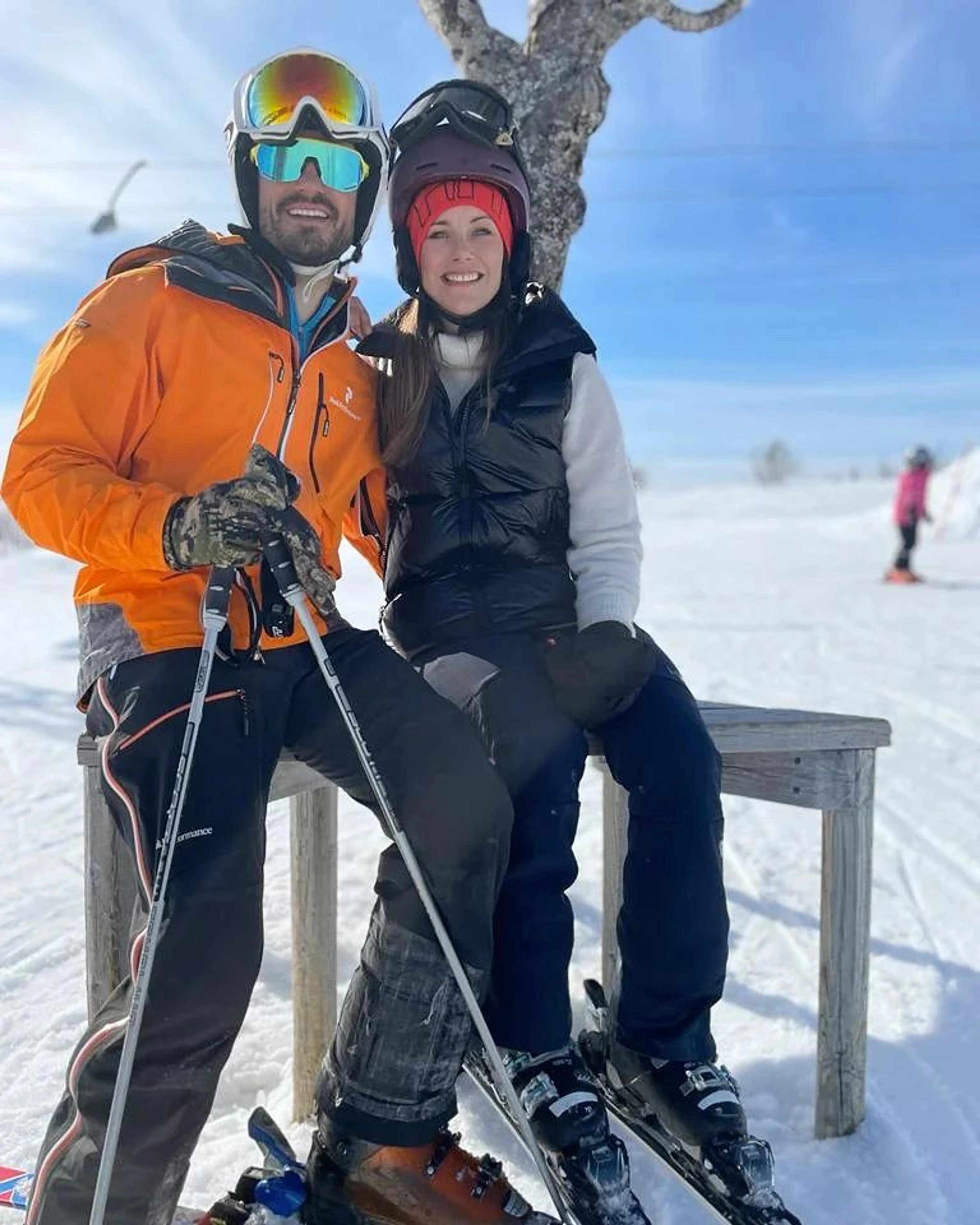 Op de eerste foto poseren Carl Philip en Sofia in hun ski-uitrusting op een bankje in de sneeuw. Op de tweede is Carl Philip aan het skiën met een van zijn zoontjes. Hoogstwaarschijnlijk is het zijn oudste zoon, prins Alexander.