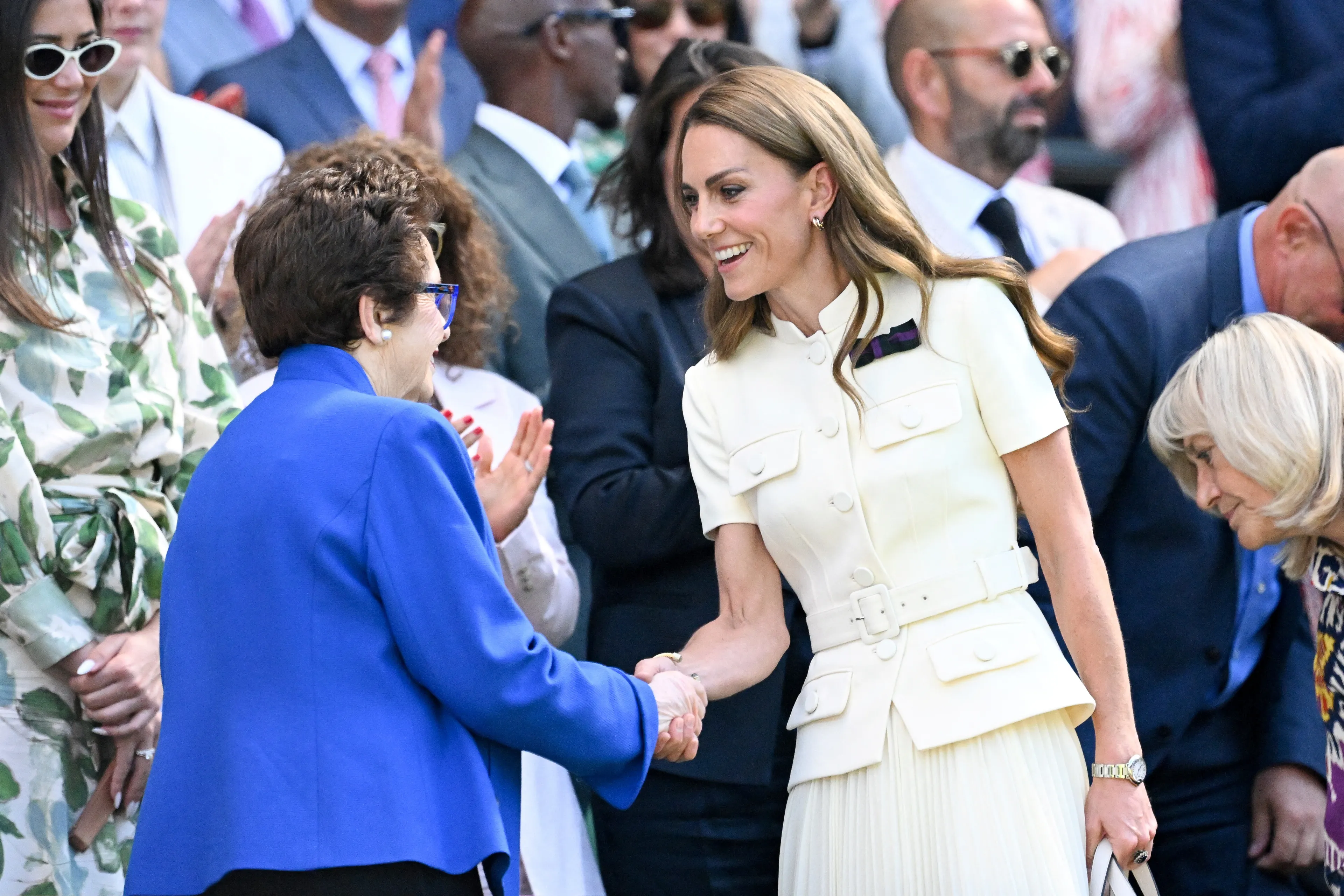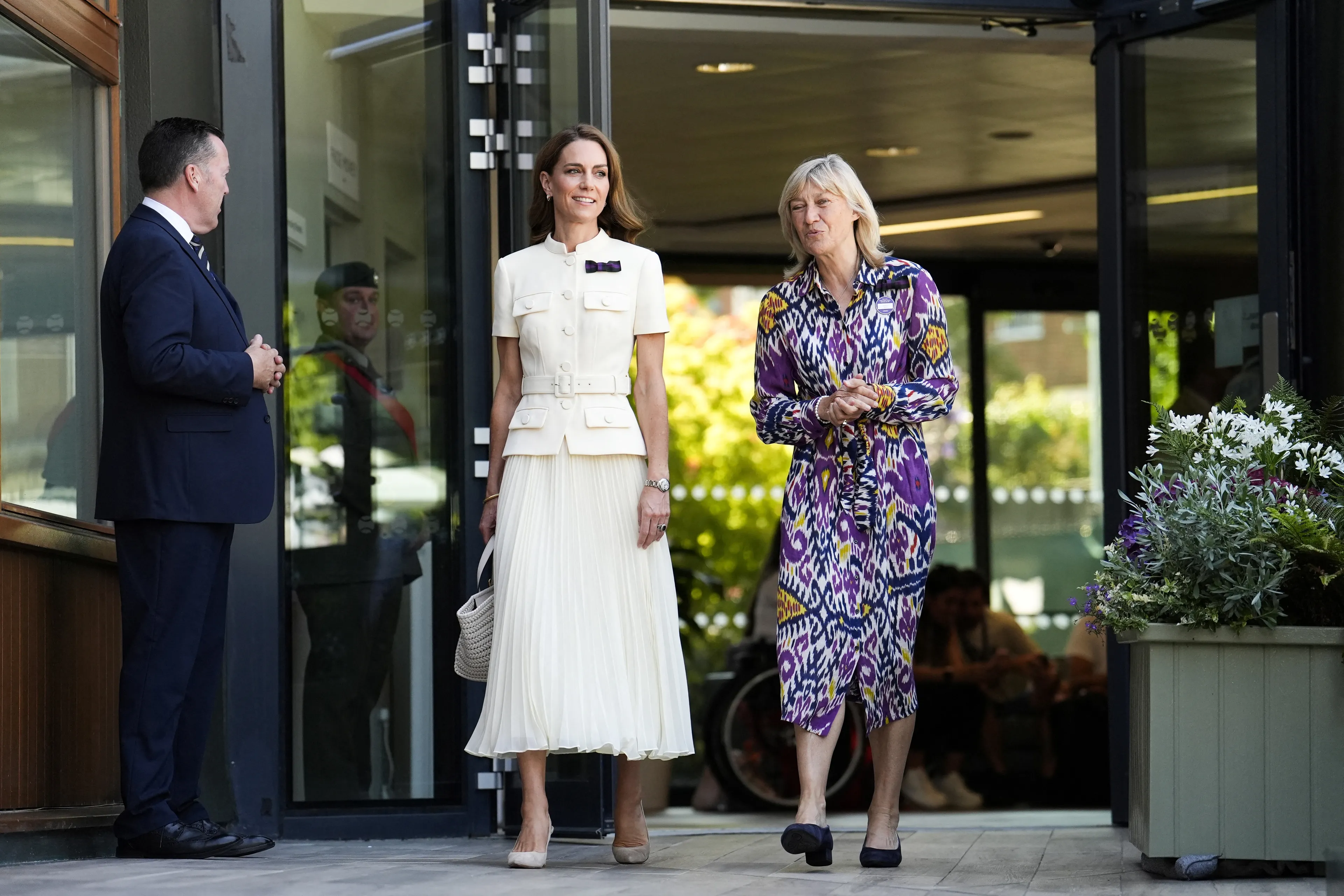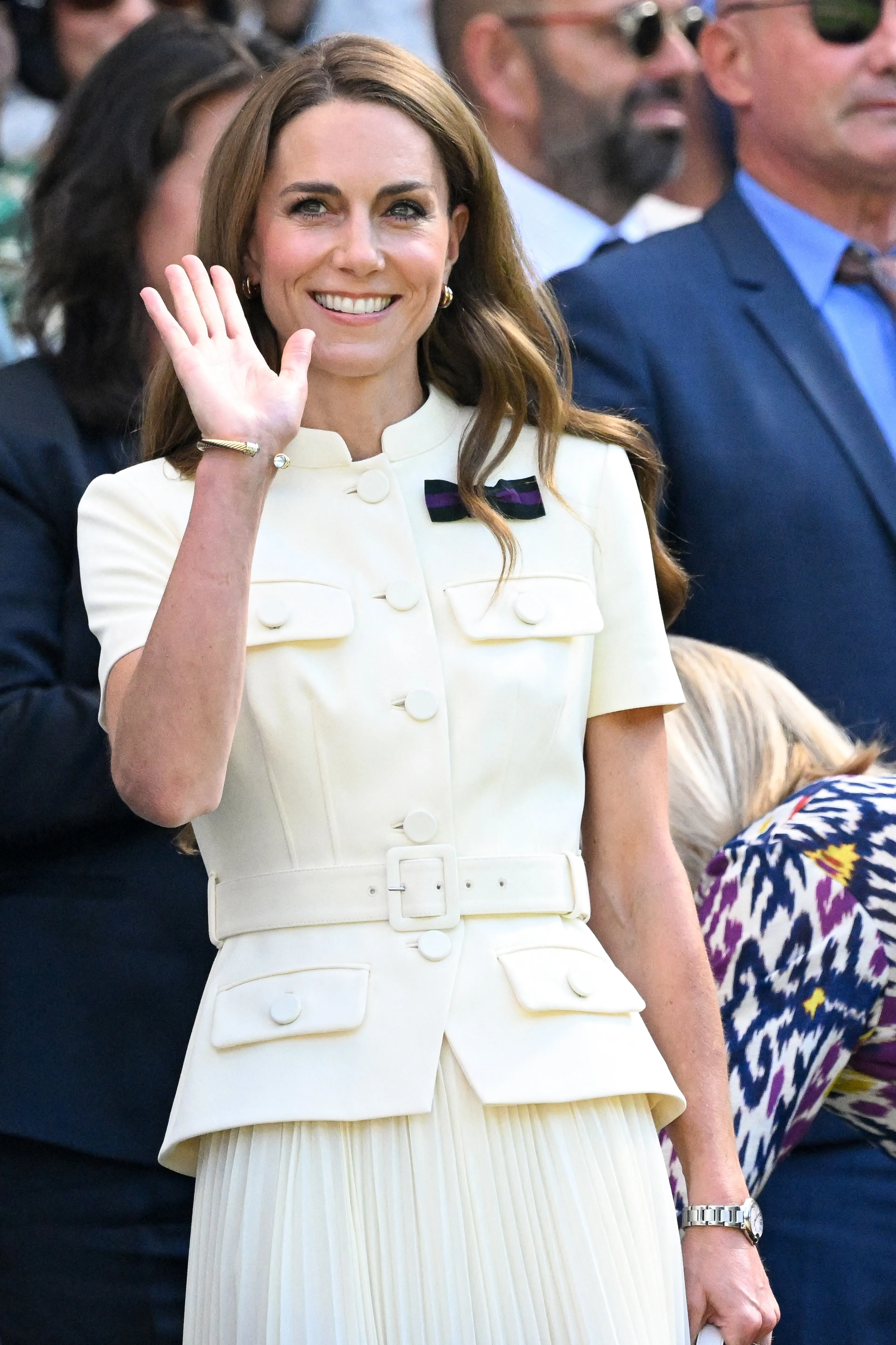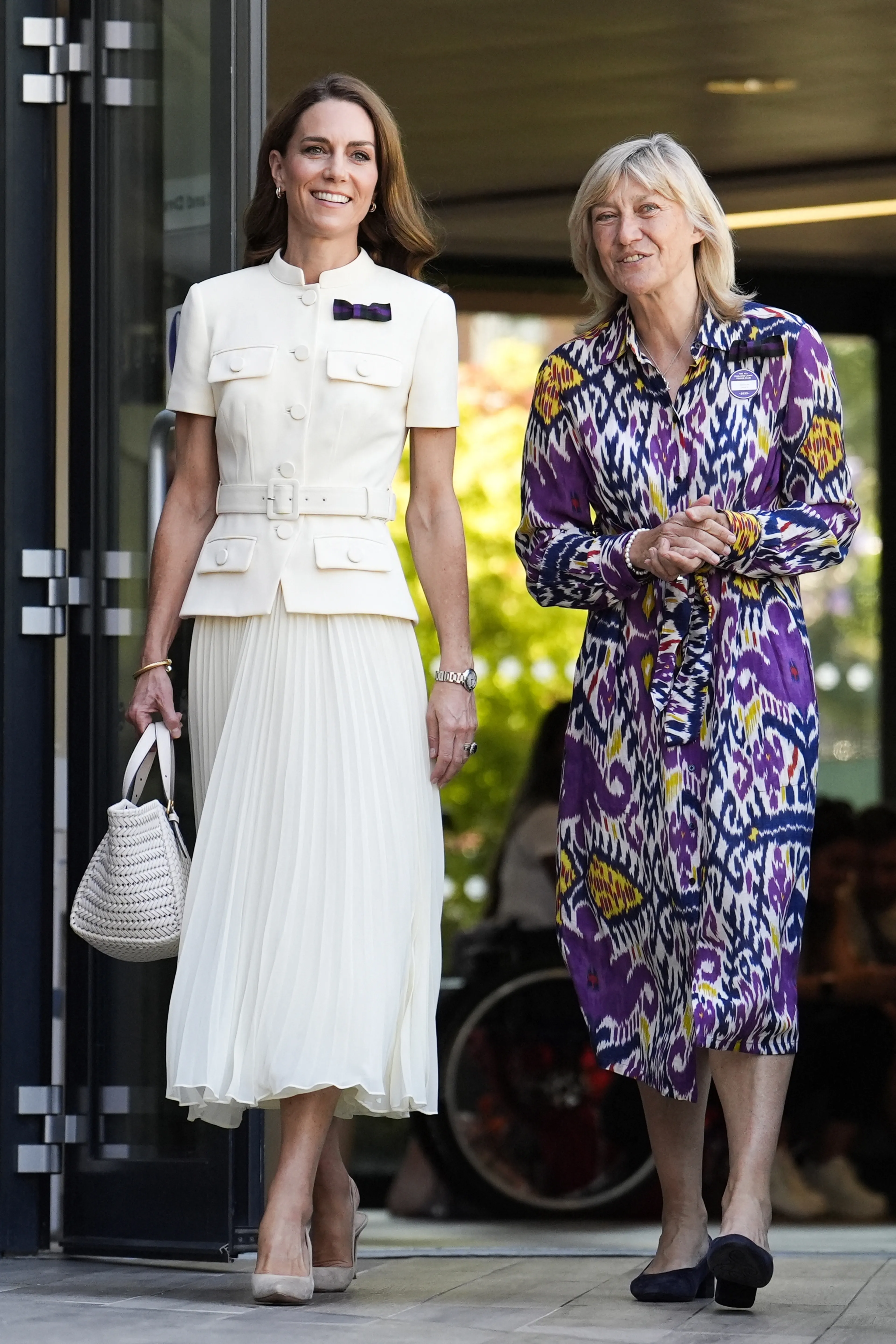 Catherine droeg een gestructureerde witte top met korte mouwen en een riem, plus een bijpassende geplooide midirok. De outfit lijkt op een witte versie van de mintgroene outfit die Catherine in 2023 droeg naar Wimbledon.