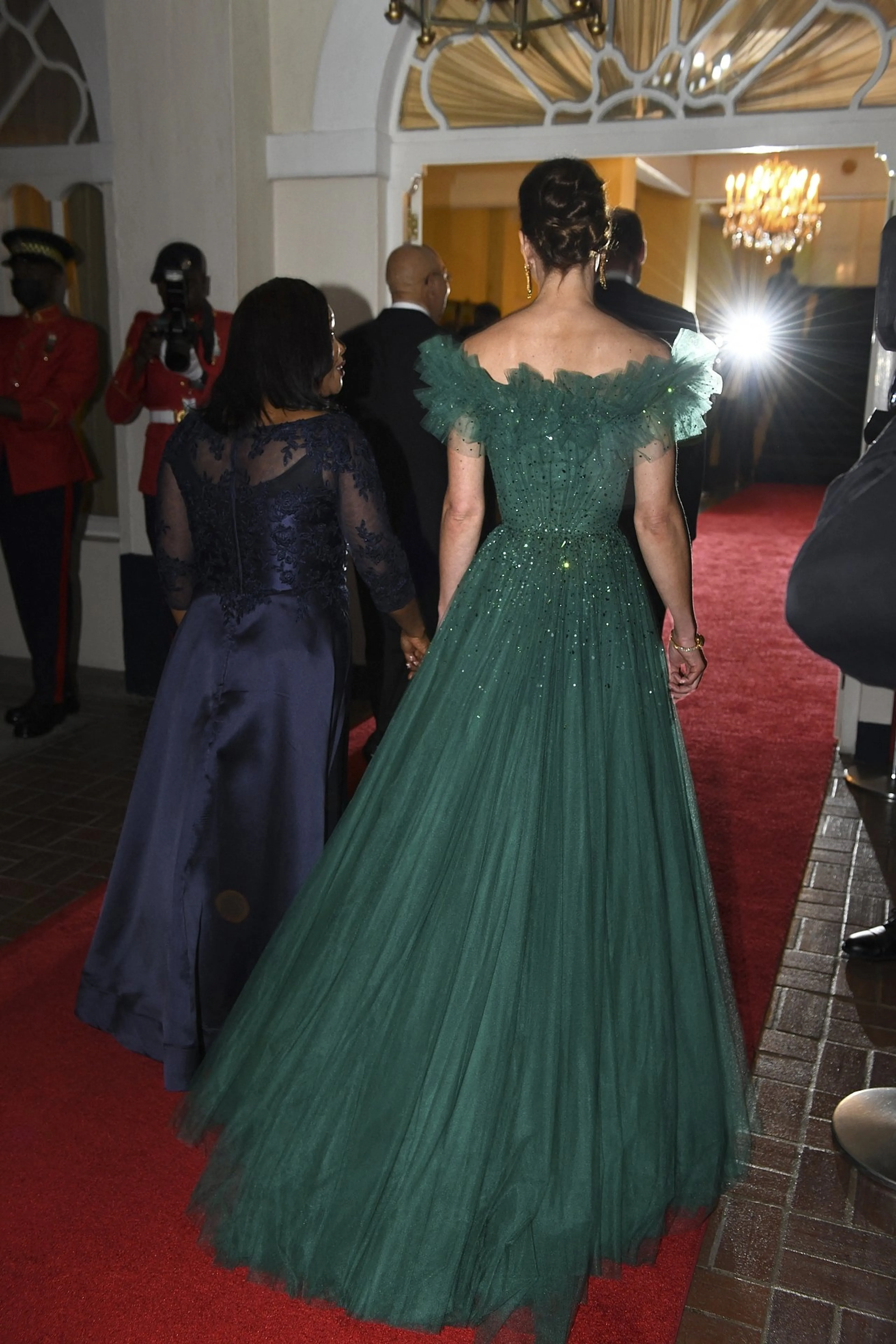 De gouverneur van Jamaica organiseerde woensdagavond een diner voor de Cambridges. Catherine had voor deze gelegenheid een groene avondjurk meegenomen in haar koffer. Heel toepasselijk, want groen is een van de nationale kleuren van het eiland.