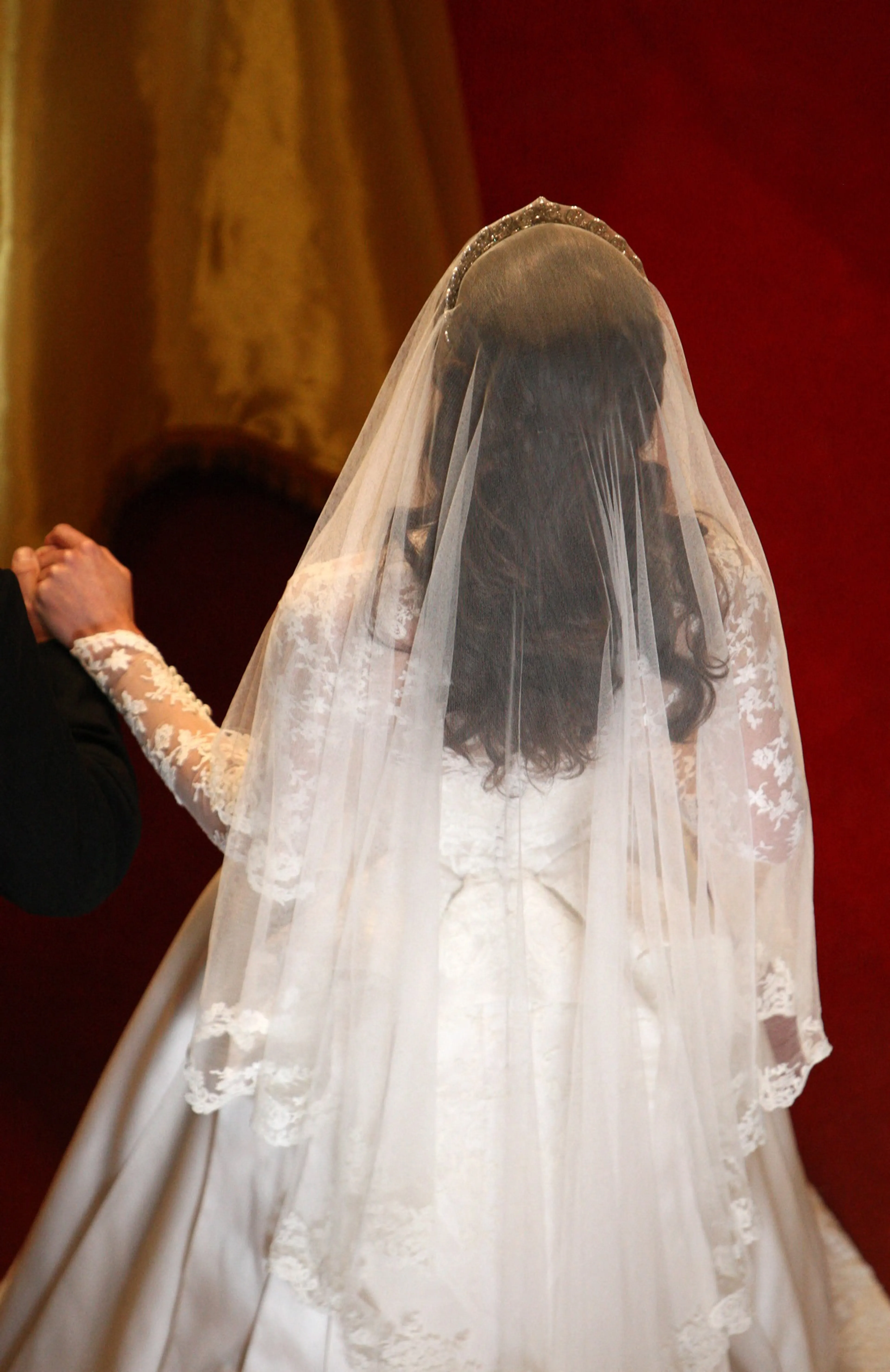 Het kant zit niet alleen op de jurk van Catherine, want ook haar sluier en schoenen zijn bedekt met de kanten bloemen.