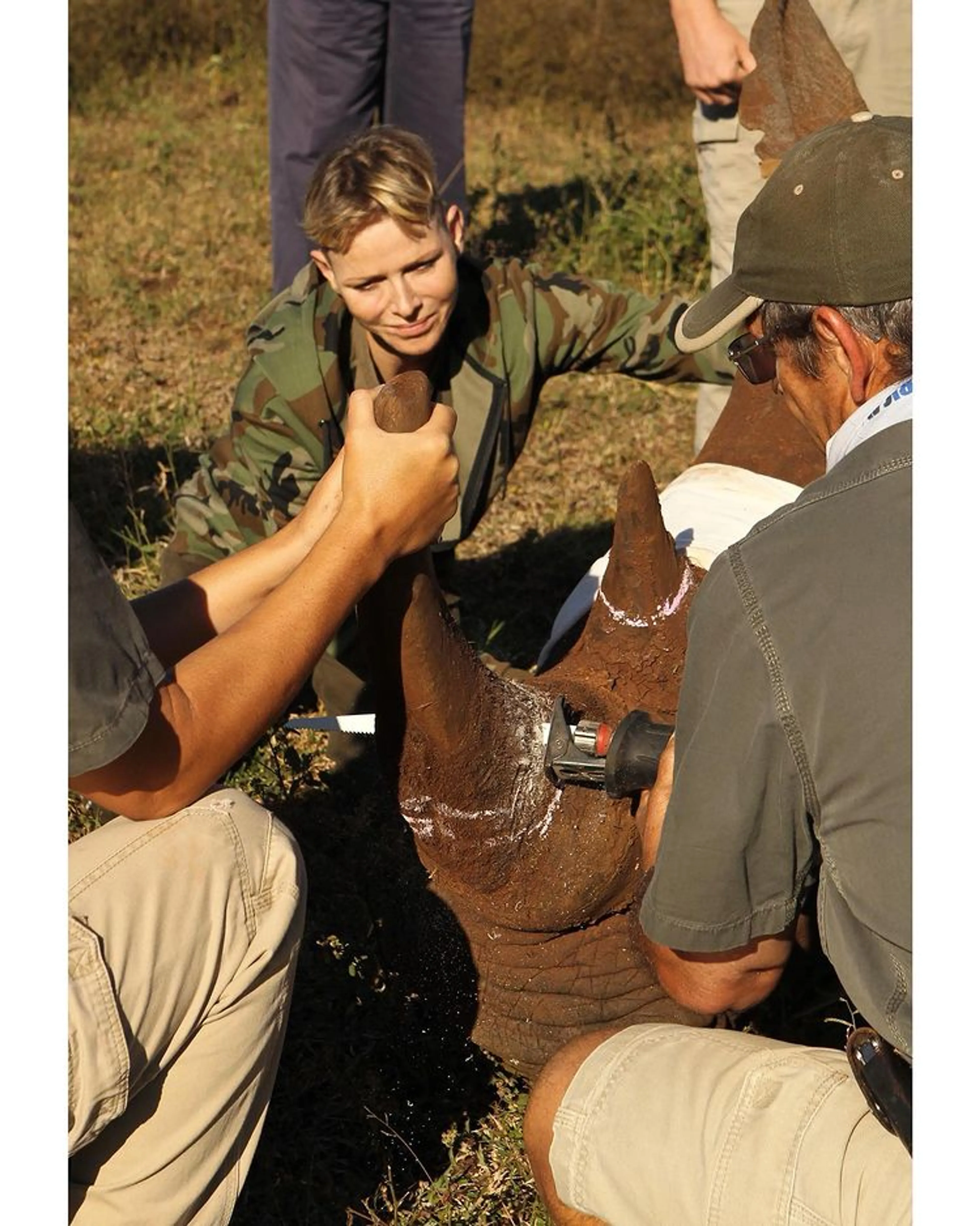 Op de foto's die prinses Charlène heeft gedeeld is te zien hoe zij naast neushoorns zit en de dieren verzorgt. Met de organisatie waar ze mee samenwerkt verwijderen ze de hoorns van de neushoorns. Dat klinkt gek, maar dat wordt gedaan om zo te voorkomen dat stropers de dieren doodschieten om zo de kostbare hoorns te gebruiken. Van neushoorns worden materialen zoals ivoor gemaakt.