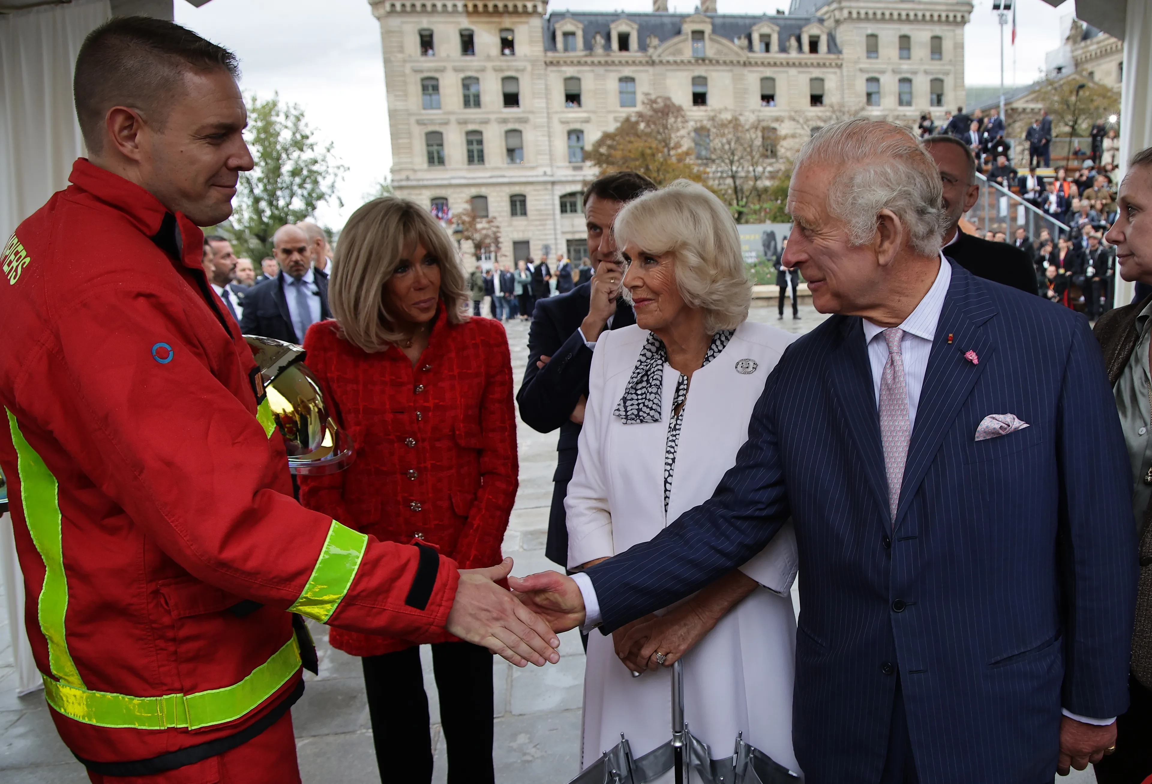 Daarna is het koninklijk paar bij de kathedraal de Notre-Dame. Hier spreken ze met de leden van de brandweer die de brand in de eeuwenoude kathedraal hebben geblust in 2019.