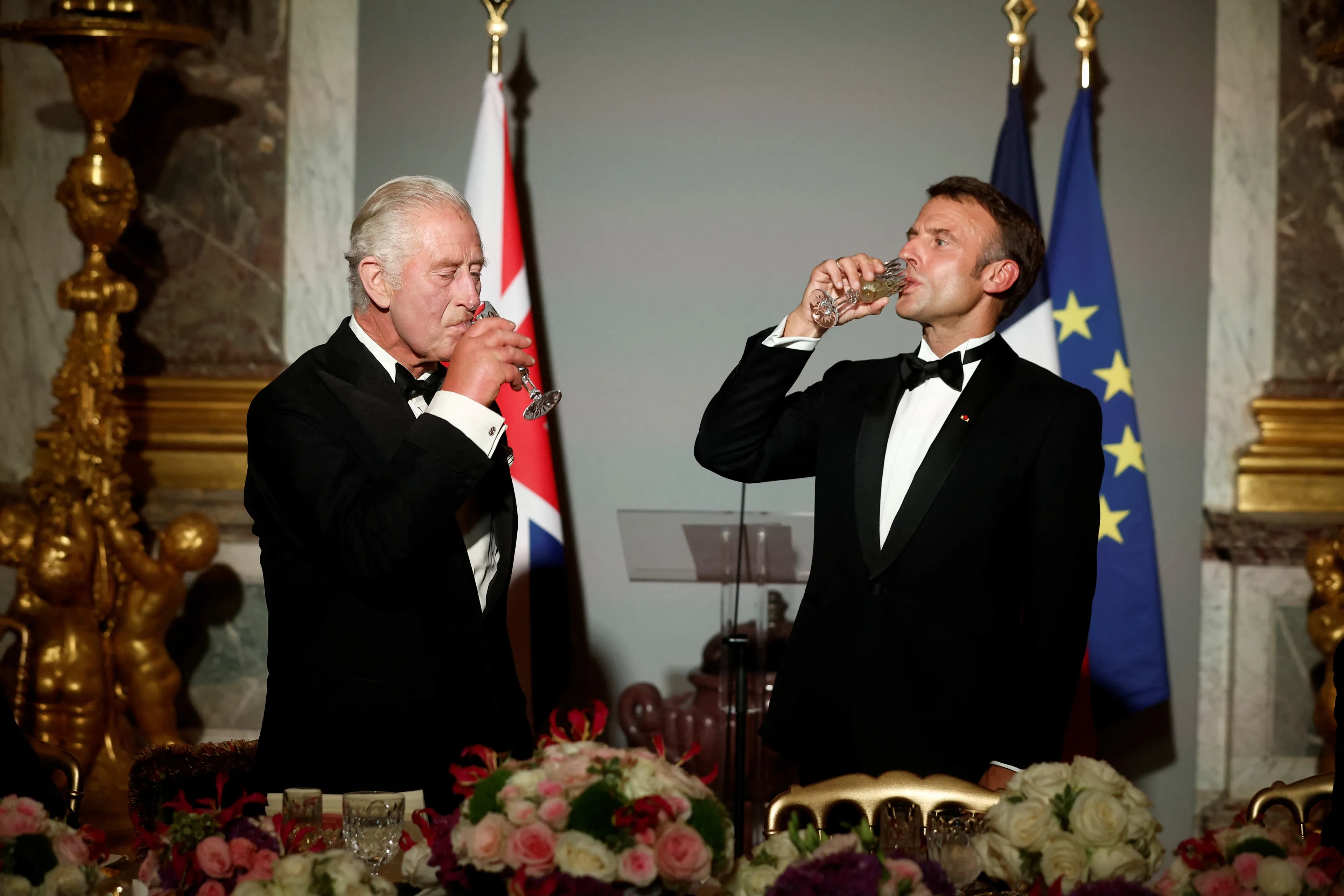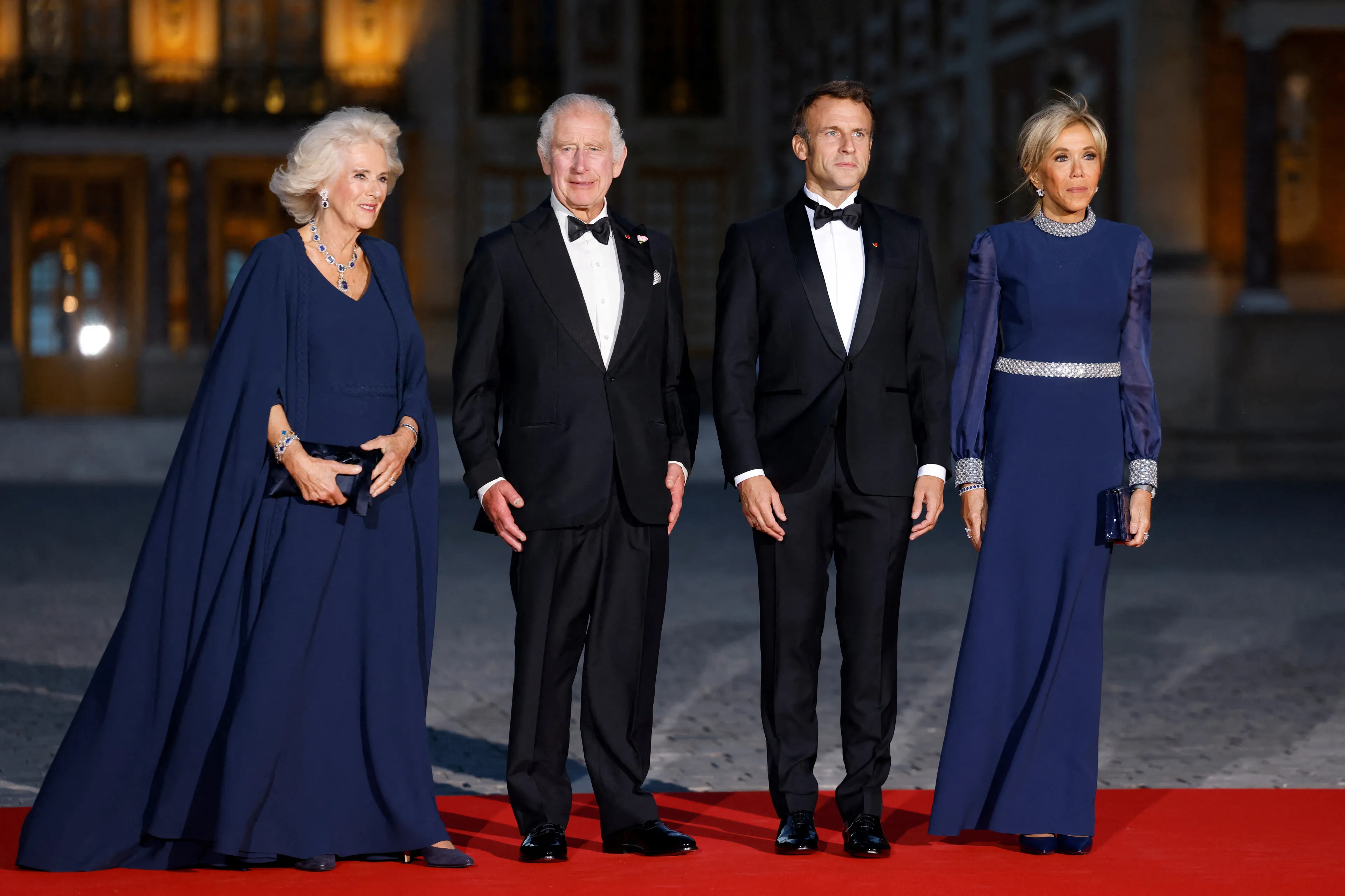 In de avond gaan Charles en Camilla naar het paleis van Versailles voor het staatsbanket. Samen met beroemde sterren schuift het koninklijk paar aan de lange tafel in de bekende Spiegelzaal. Camilla en Brigitte zijn helemaal op elkaar afgestemd en kiezen allebei voor de gelegenheid voor een donkerblauwe japon. Toepasselijk is ook dat de jurk van Camilla van het Franse modehuis Dior komt en haar ketting is van schoonmoeder Elizabeth, een mooi eerbetoon.
