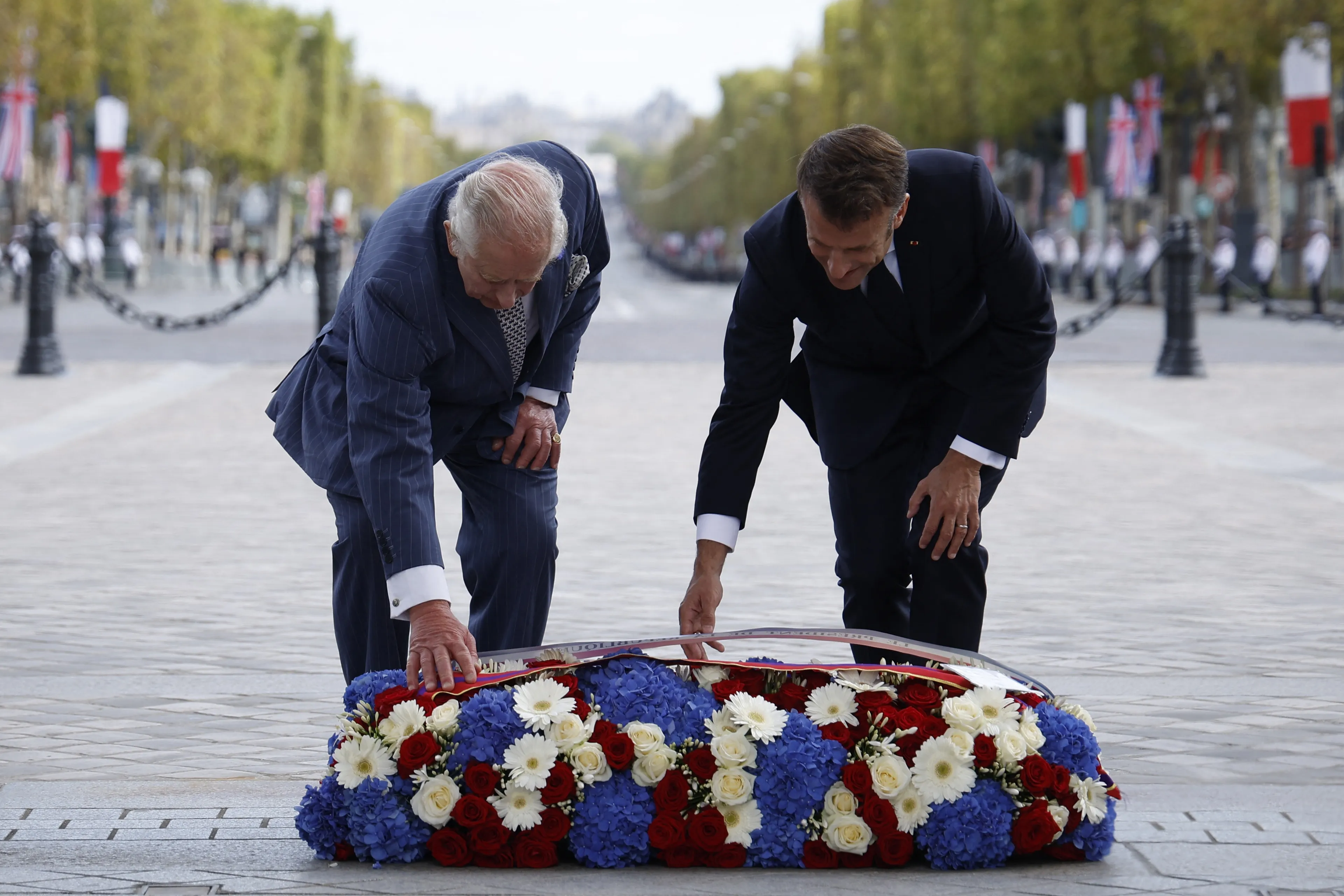 De eerste dag heeft het koninklijk paar meteen een volle agenda. Ze ontmoeten Macron en zijn vrouw Brigitte en beginnen de dag bij de Arc de Triomphe. Daar leggen Charles en de president een krans bij het graf van de onbekende soldaat.