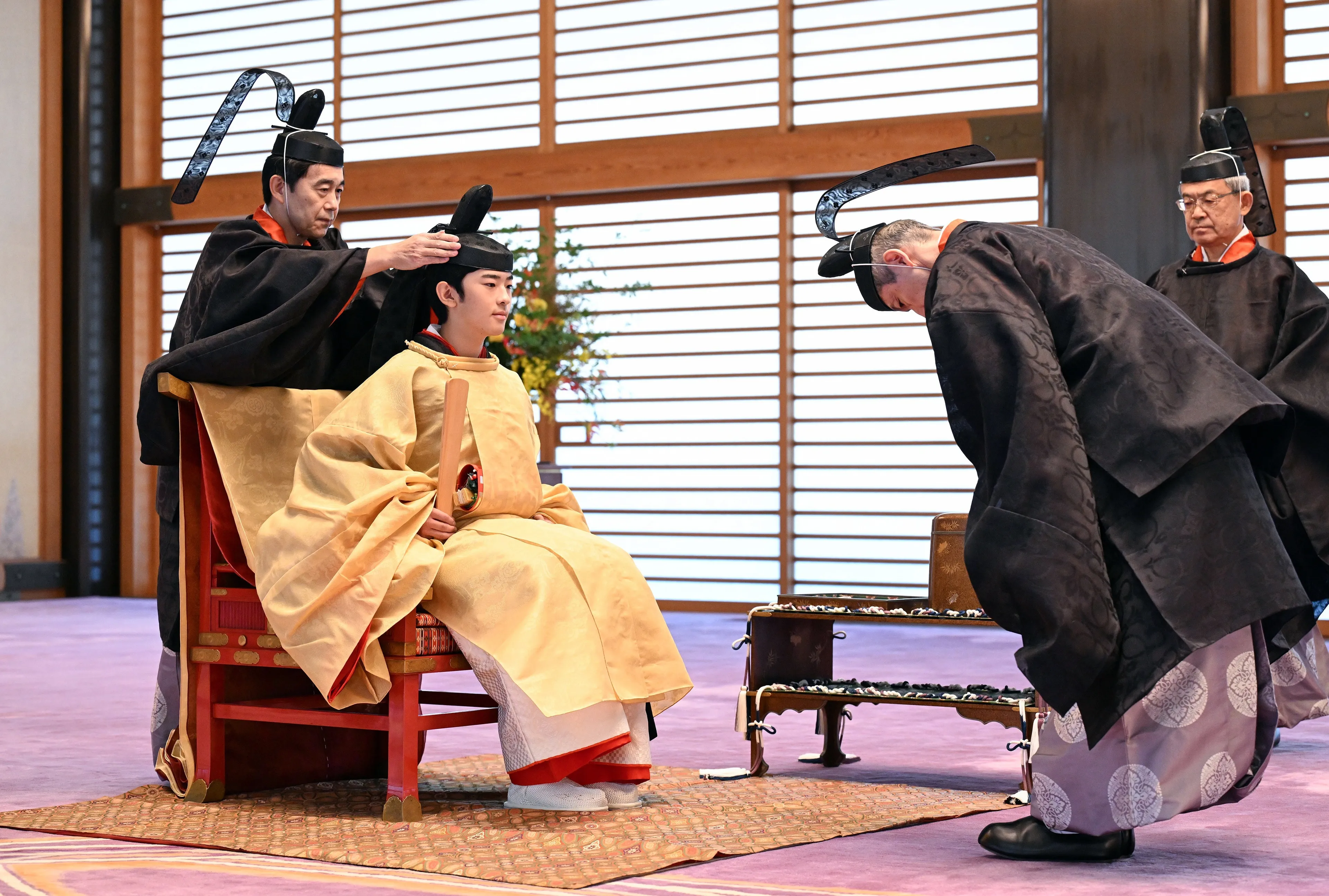 De zogeheten 'coming-of-age ceremony' begon in de familieresidentie van prins Hisahito. Gekleed in kostuum ontving hij namens keizer Naruhito een kroon. De ceremonie werd vervolgd in het Keizerlijk Paleis in Tokio. Meerdere familieleden waren hier aanwezig om dit bijzondere moment bij te wonen. Bij Hisahito, die inmiddels was omgekleed in traditionele kledij, werd een 'Kanmuri' op zijn hoofd gezet. Deze zwarte hoofdtooi symboliseert zijn volwassenwoording. De volwassen prins was dankbaar voor de ceremonie, dat vertelde hij na een diepe buiging voor keizer Naruhito en een dankwoord richting zijn ouders.
