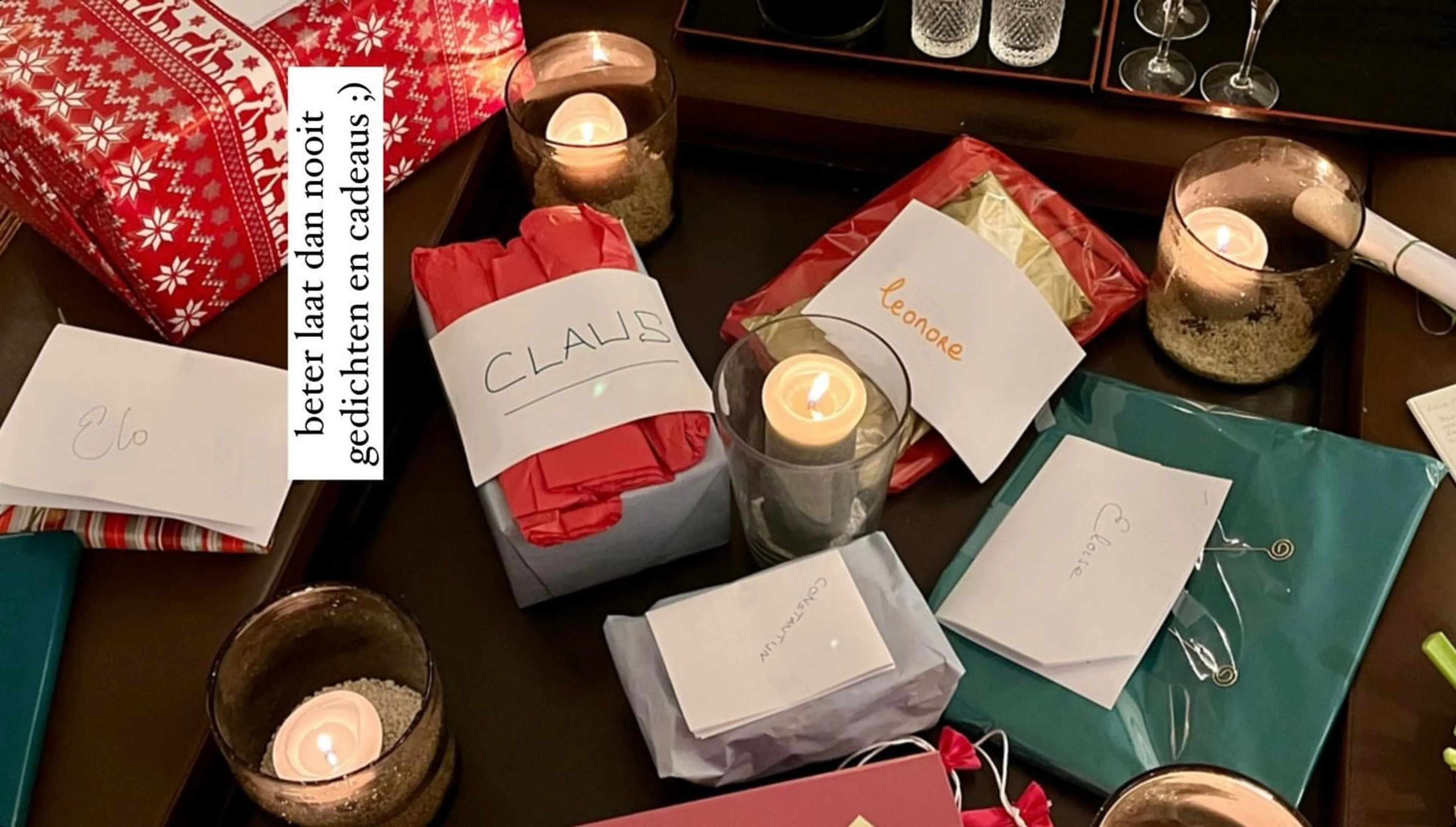 Prins Constantijn en prinses Laurentien hebben donderdag met hun drie kinderen Eloise, Claus-Casimir en Leonore pakjesavond gevierd. Dat is te zien op de Instagram pagina van oudste dochter Eloise. Zij deelt een foto waar de cadeautjes, met gedichtjes en namen erop, op tafel liggen. Eloise schrijft bij de foto 'beter laat dan nooit, gedichten en cadeaus'. De avond werd vervolgd met een potje Rummikub.