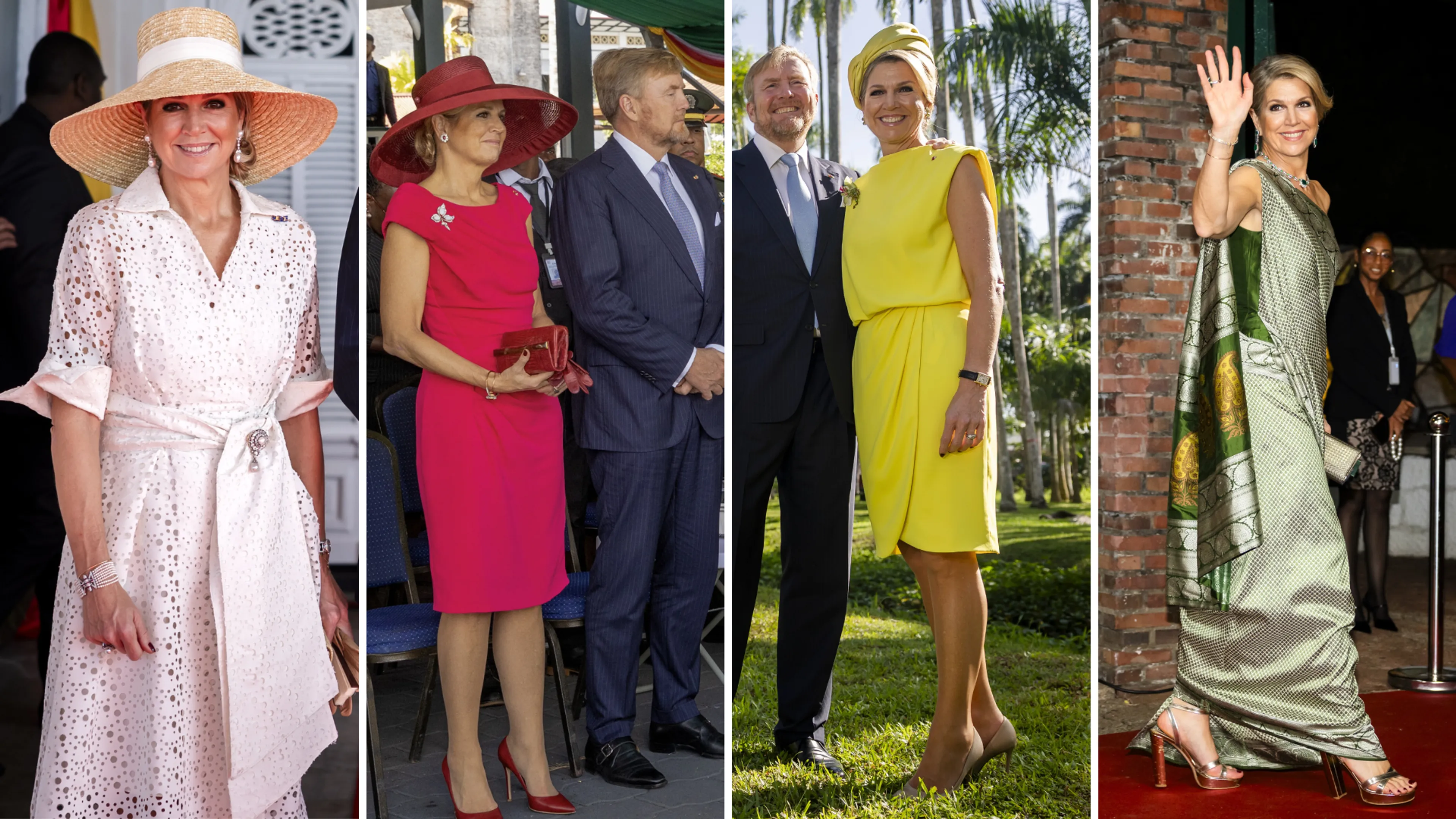 Toeval of niet, maar met deze groene creatie is koningin Máxima's flagdressing in Suriname compleet. Die term houdt namelijk in dat iemand met zijn of haar kleding een knipoog geeft naar het gastland, door bijvoorbeeld de kleuren van het land te dragen. Dat heeft de koningin in de eerste twee dagen in ieder geval gedaan. Bij aankomst koos Máxima voor wit en later op de dag droeg ze rode accessoires. Met het felgele ontwerp van de tweede dag en de groene sari van de contraprestatie, hebben we alle kleuren van de Surinaamse vlag voorbij zien komen.