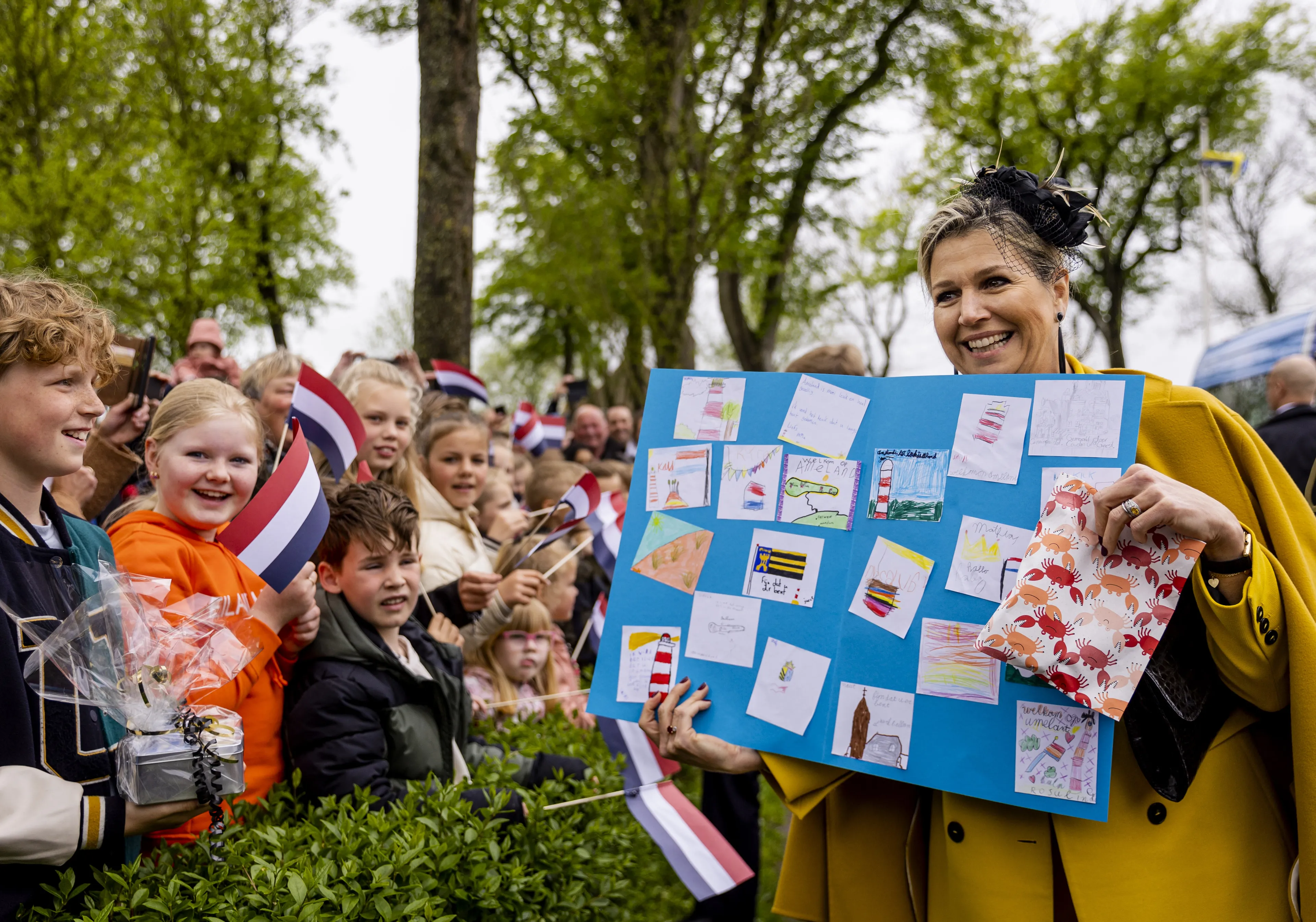 Het koningspaar heeft het bezoek aan Terschelling afgesloten en is per helikopter aangekomen het volgende eiland dat ze bezoeken, Ameland. Ruim honderd Amelanders zongen "oranje boven" en er stond een man met een bord met de tekst "Mag ik een kiekje maken voor mijn fotowand?" Dat wilden de koning en koningin wel. Ze gingen met hem op de foto.
