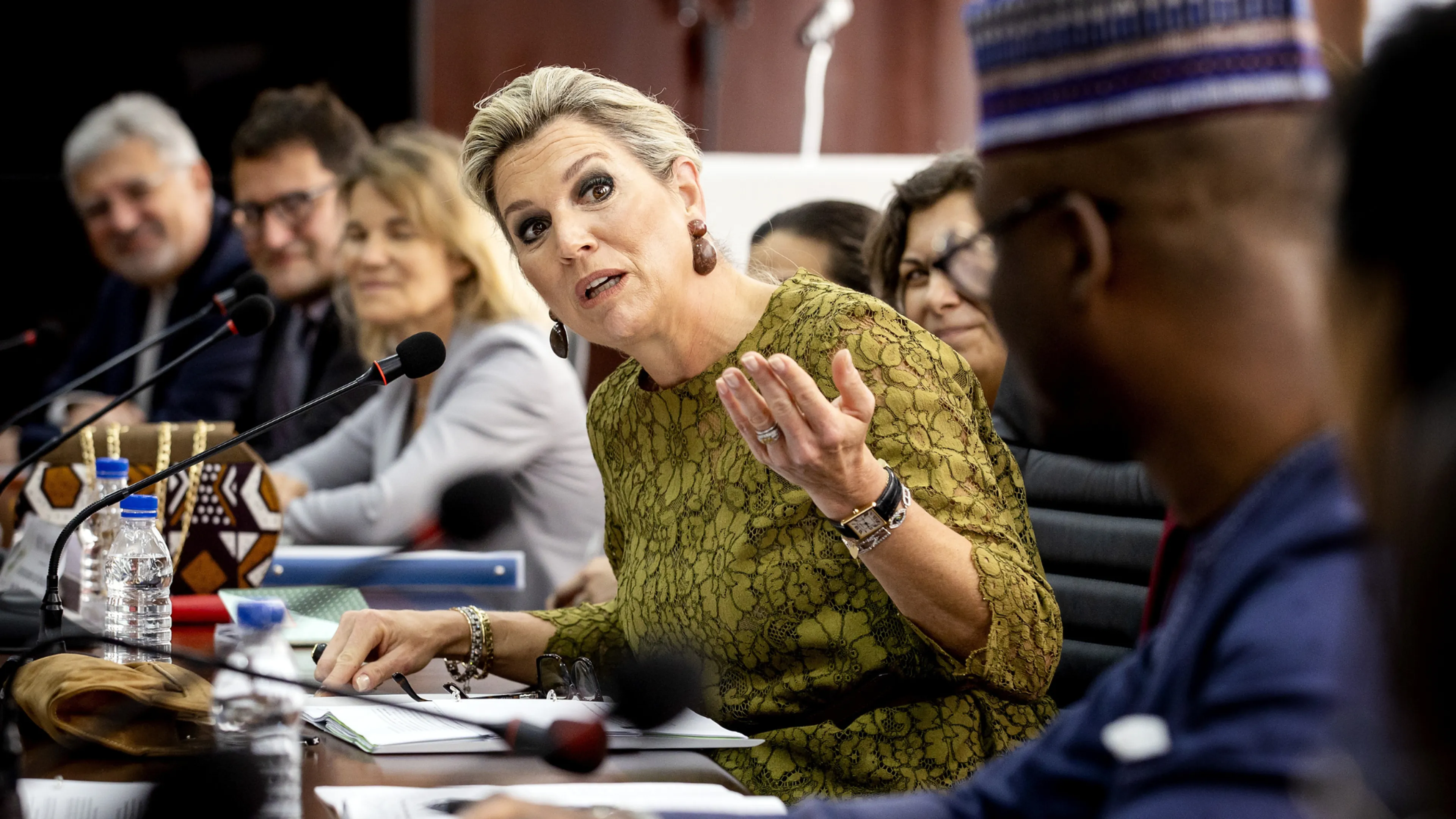 De koningin spreekt dinsdag in haar rol als speciale gezant van de Verenigde Naties met onder anderen ministers Adama Coulibaly (economie en financiën) en Amadou Coulibaly (communicatie en digitale economie). Aan het begin van het gesprek maakte de koningin nog een grapje over het schijnen van de zon, verwijzend naar de familienaam Van Oranje en de kleur van de zon.