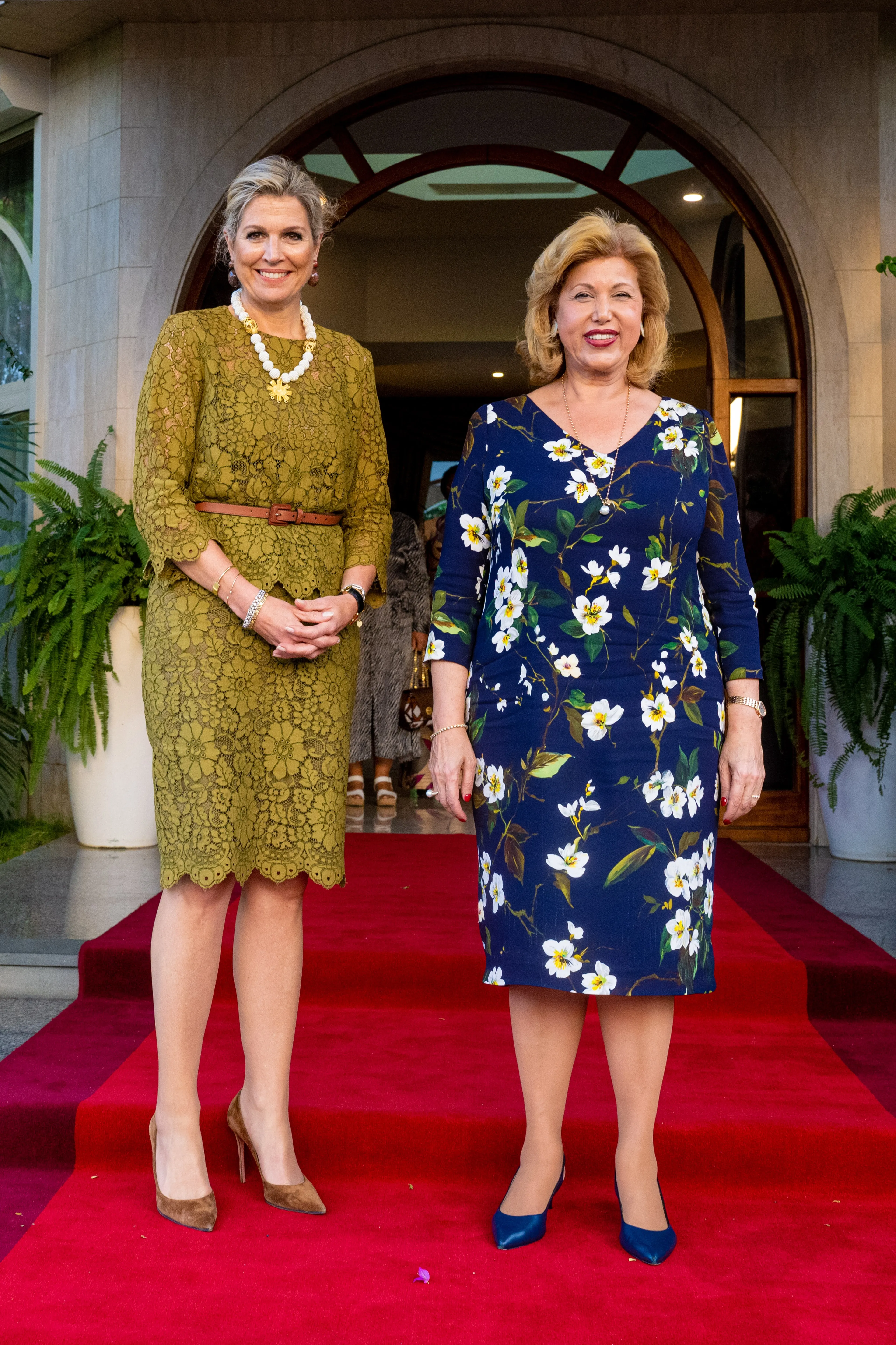 De koningin was dinsdag daarom ook een stuk zakelijker gekleed dan maandag, toen haar dag voornamelijk in het teken van veldbezoeken en ontmoetingen met inwoners stond. Waar ze maandag een luchtige rok met simpele top droeg, was dat maandag een groene kanten jurk van haar geliefde modehuis Natan.