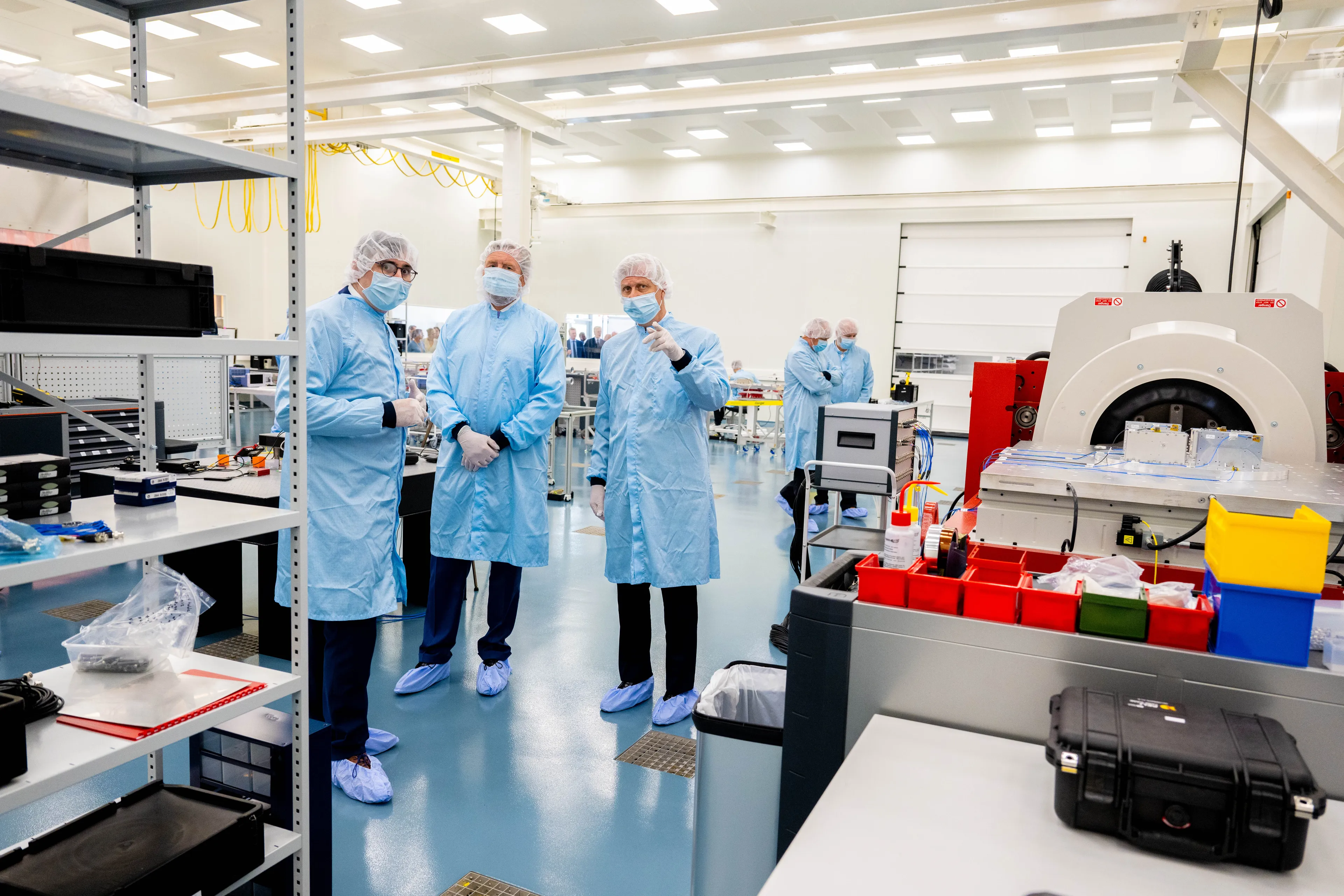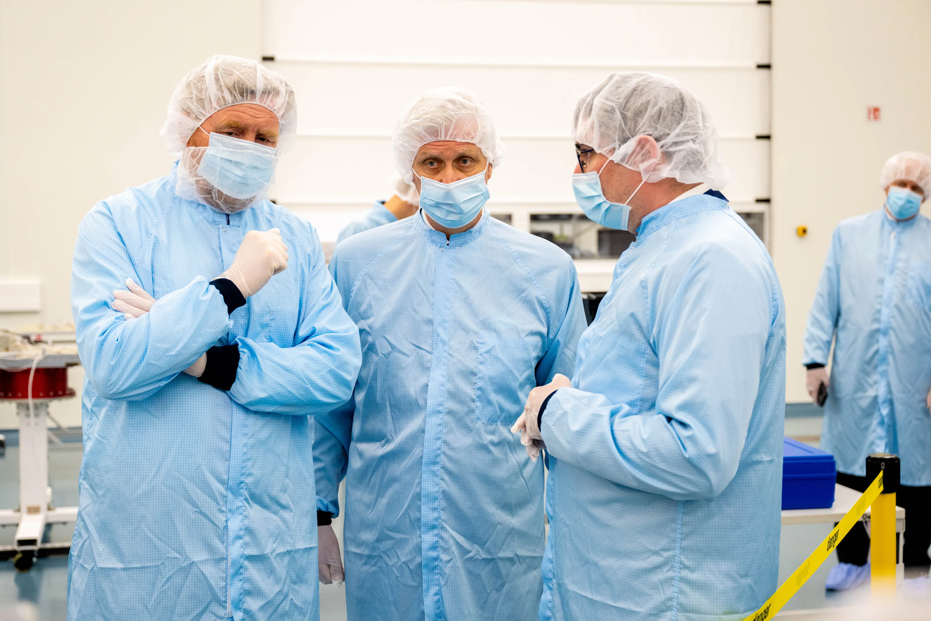 De koningen trokken voordat zij de zogeheten clean room ingingen, waar de satellieten worden gebouwd, beschermende kleding aan. Met handschoenen, overschoenen, jas, haarnet en mondkapje betraden ze de ruimte. Hier kregen zij een rondleiding, waarbij met name de aandacht was gericht op de satelliet die in oktober de ruimte in zal gaan.