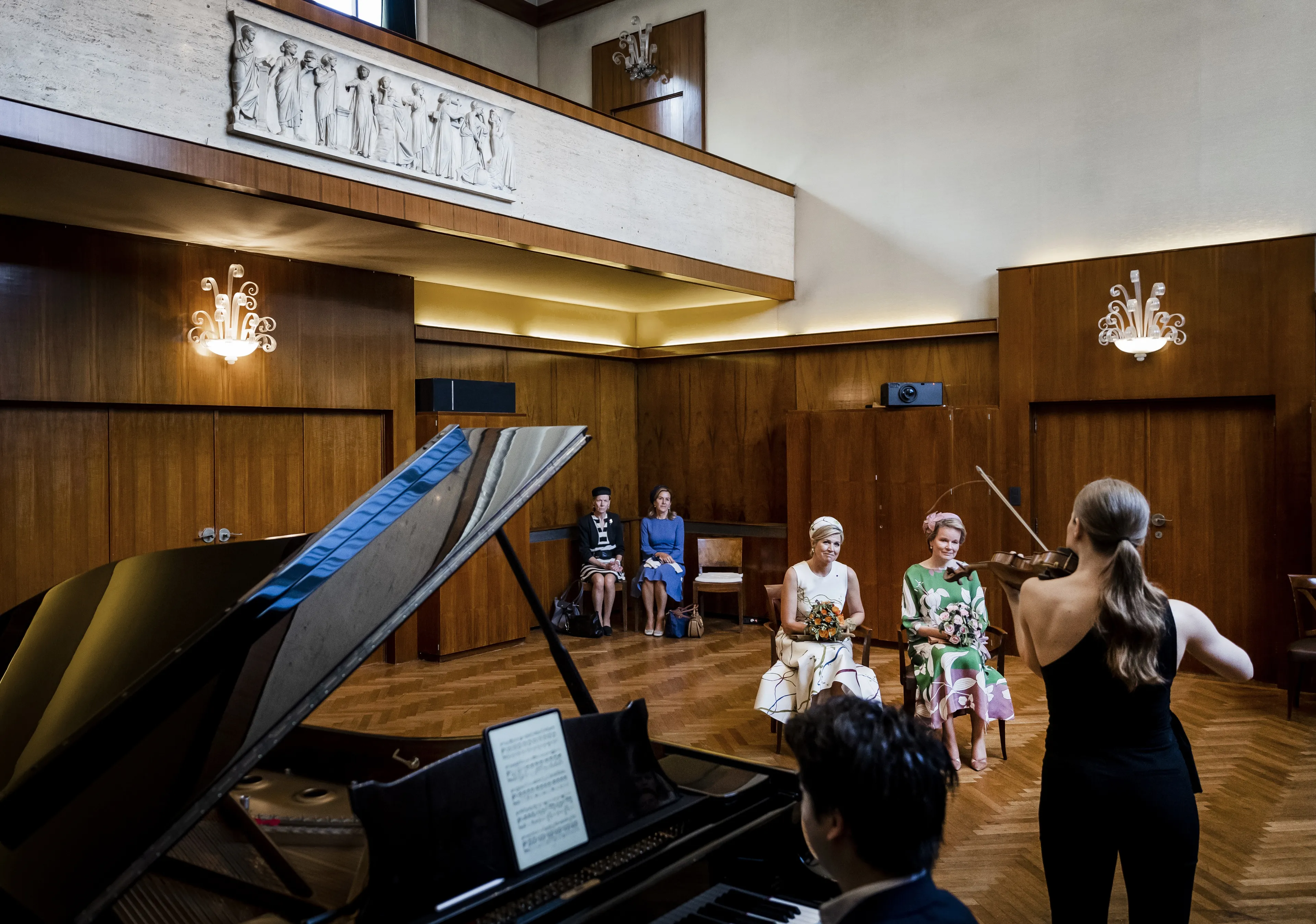 In de muziekkapel volgen internationale jonge musici een programma dat onder meer bestaat uit lessen en concerten. De koninginnen hebben een aantal van de jonge muzikanten ontmoet, werden getrakteerd op optredens en kregen een rondleiding.