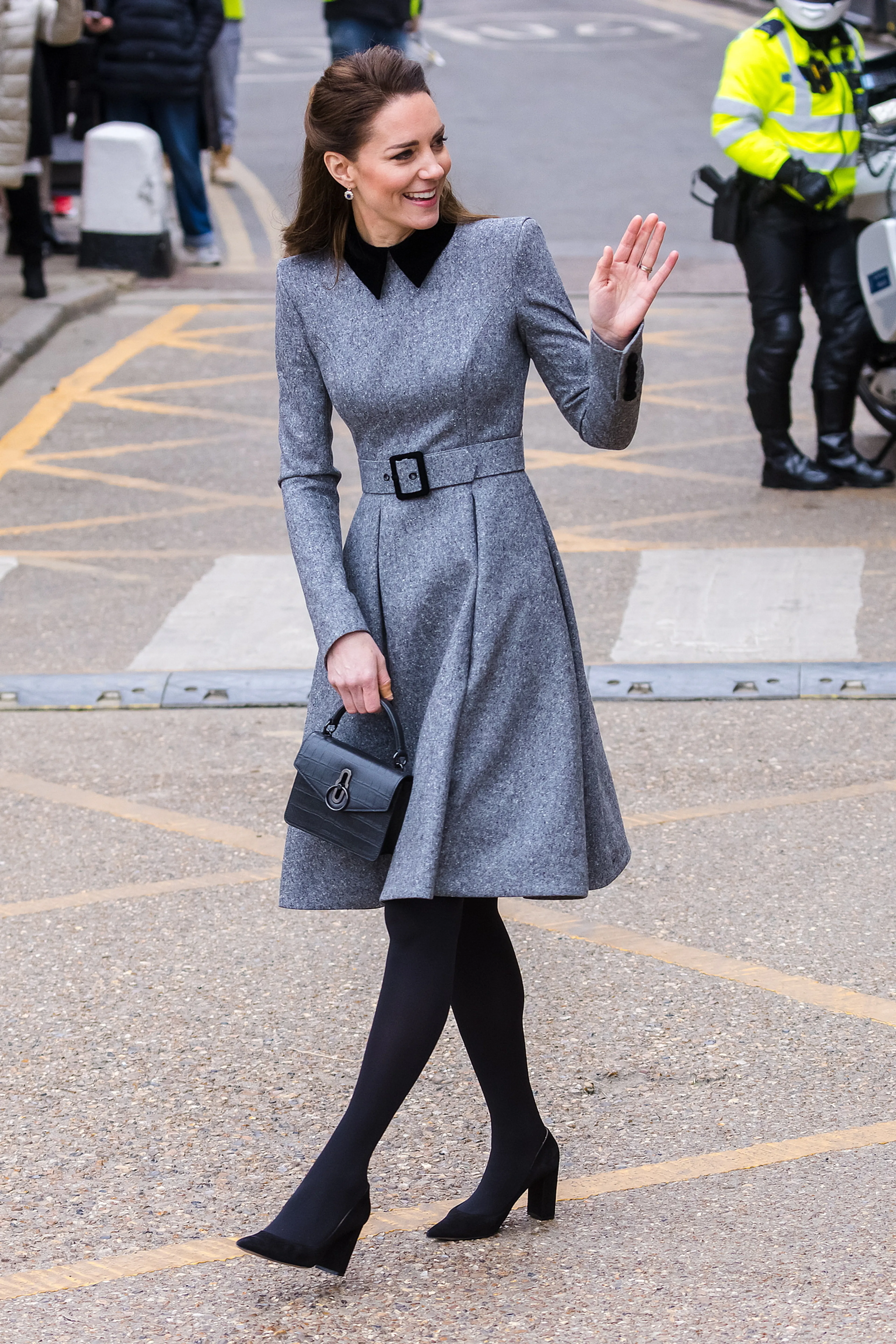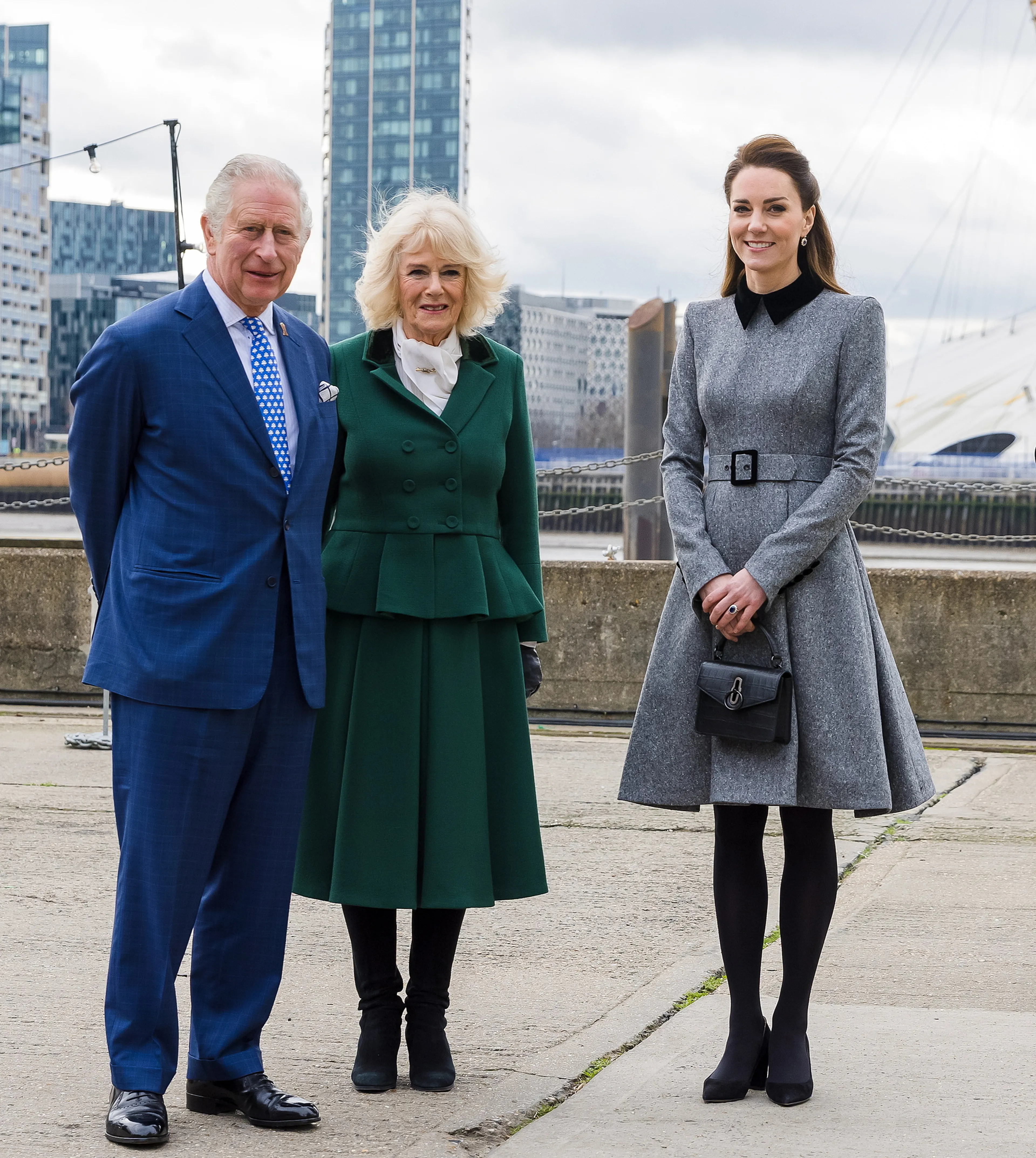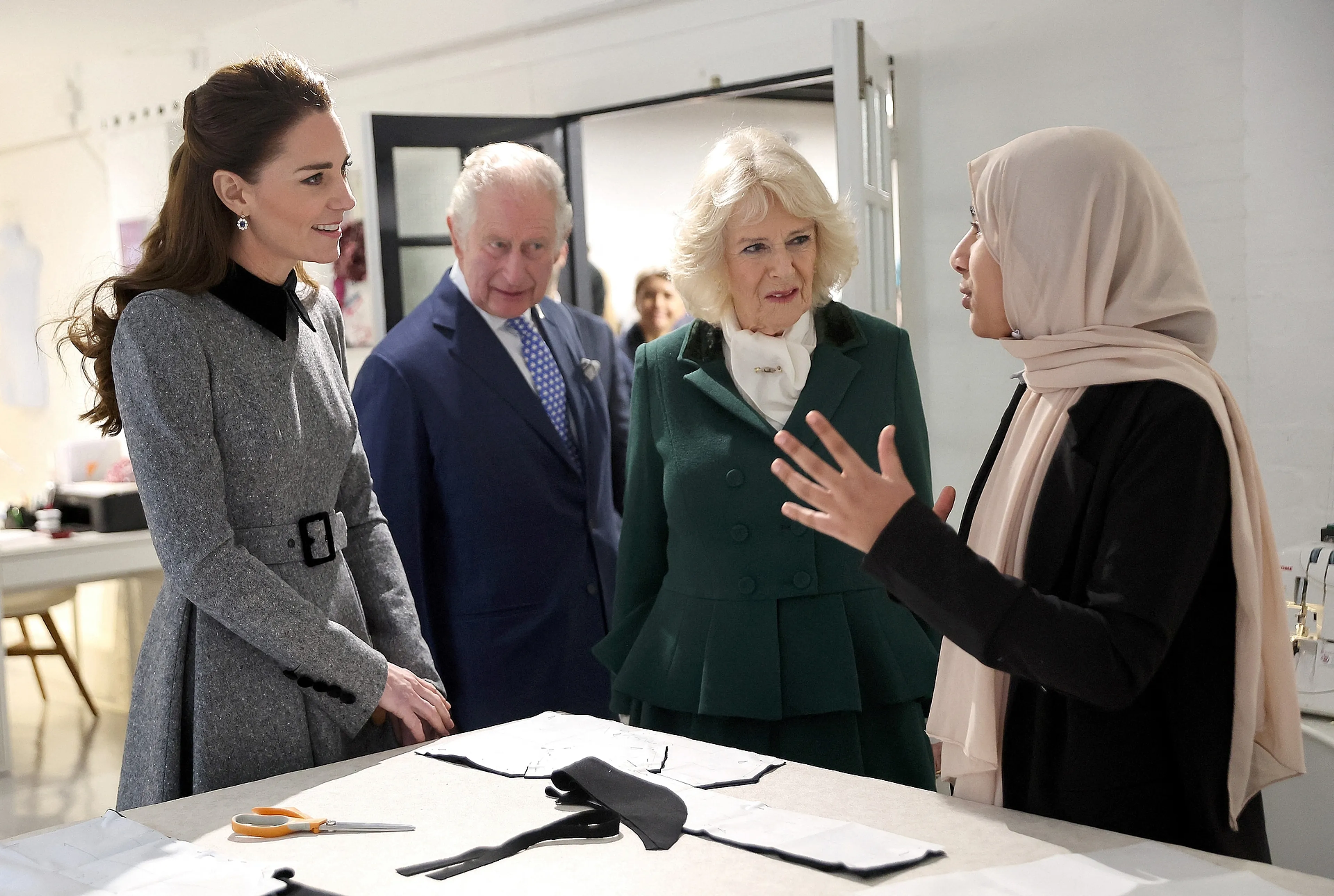 Het gebeurt niet vaak dat Catherine samen met haar schoonouders op pad gaat. Voor de gelegenheid - er zijn veel textielontwerpers gevestigd in Trinity Buoy Wharf - droeg de vrouw van prins William een jurk van ontwerper Catherine Walker die ze in 2019 ook al eens aan had.