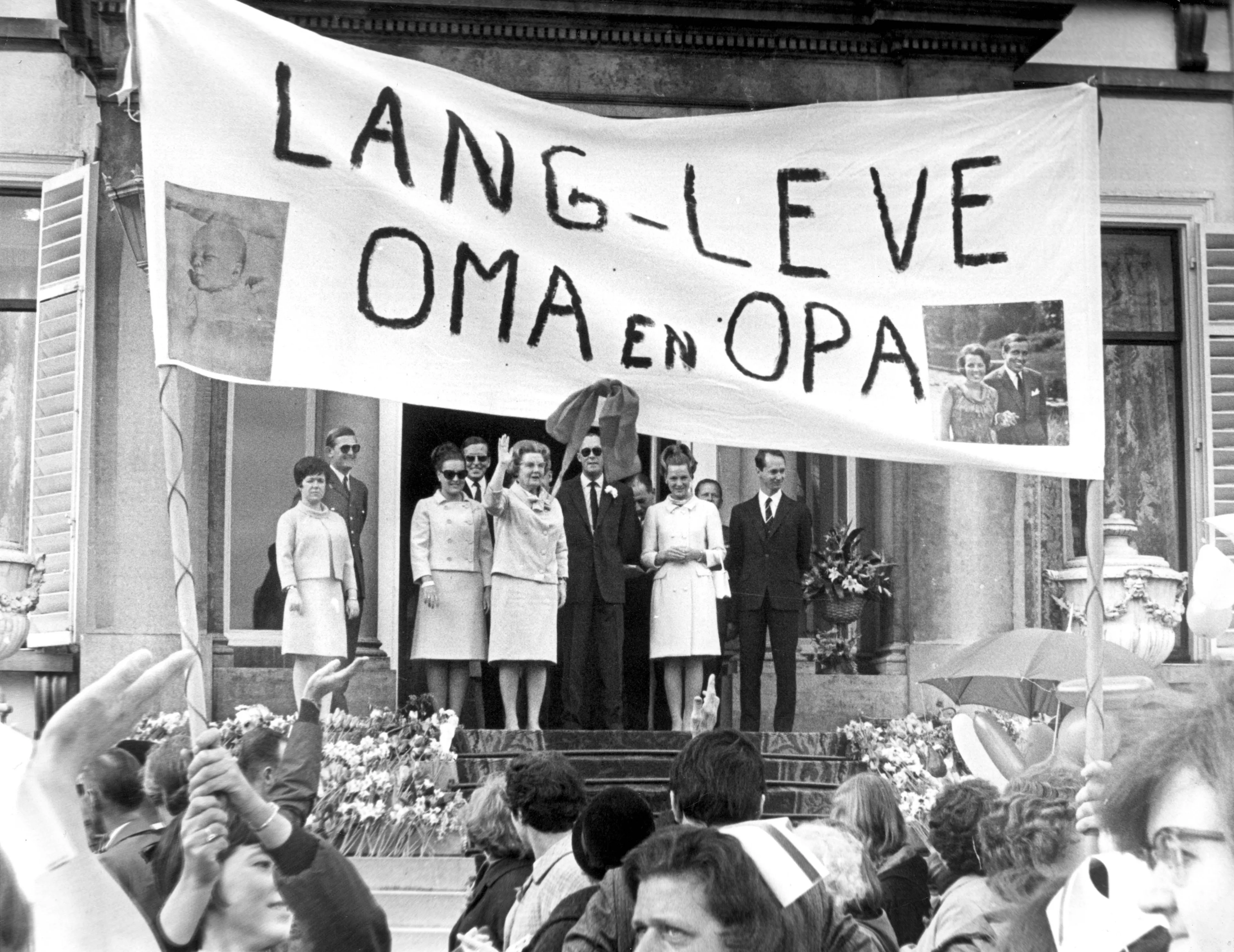 In het geboortejaar van Willem-Alexander in 1967, worden koningin Juliana en prins Bernhard door de toeschouwers gefeliciteerd met de geboorte van hun kleinkind.