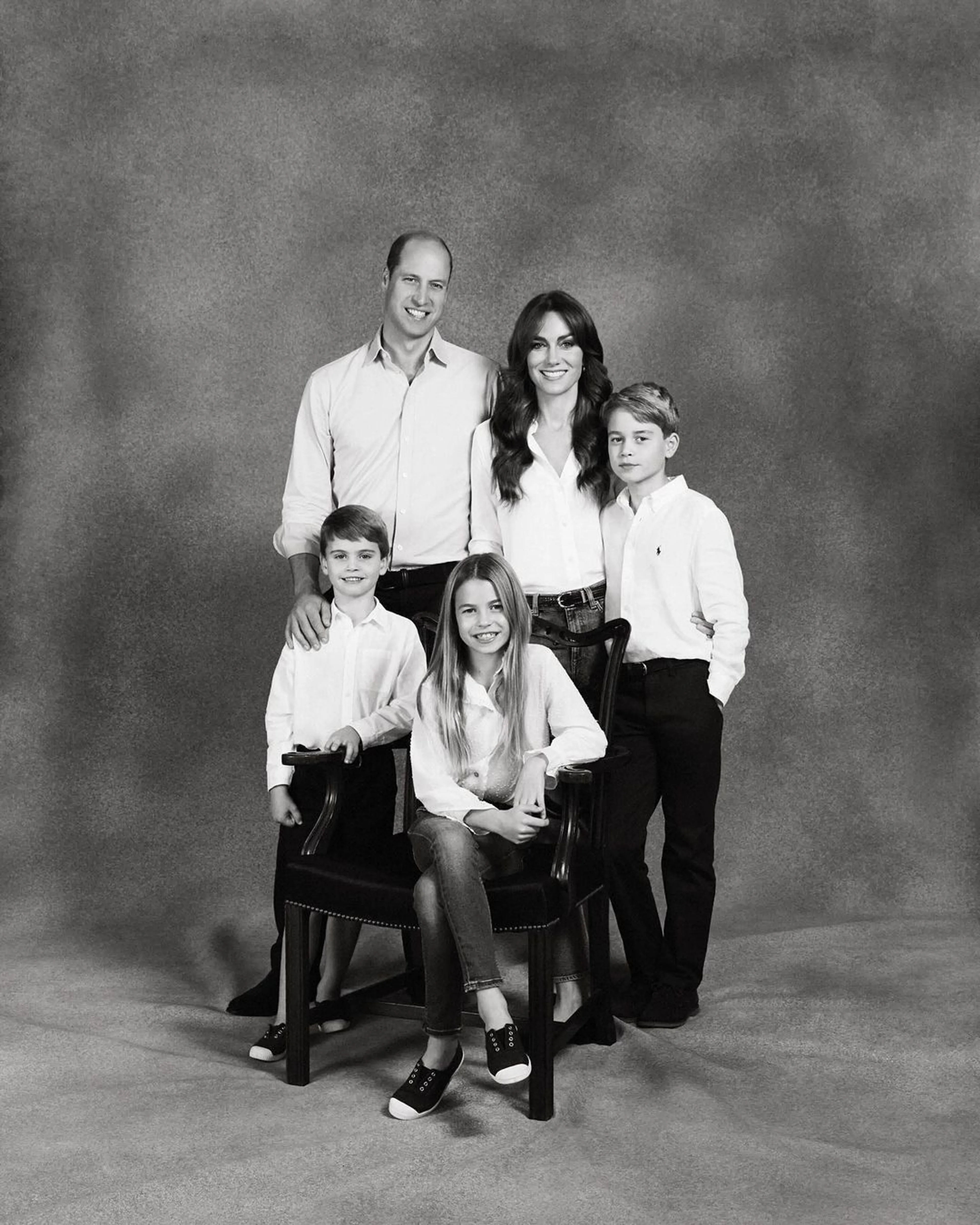 Bijzonder aan de kerstkaart is natuurlijk dat het een zwart-wit foto is. Dat maakt de hele kaart direct erg klassiek. De kinderen van prins William en Catherine, de prinses van Wales zijn in dezelfde outfits als hun ouders gestoken. Met een zwarte jeans en een wit overhemd (of een blouse voor de dames) aan, kijkt het vijftal lachend in de camera.