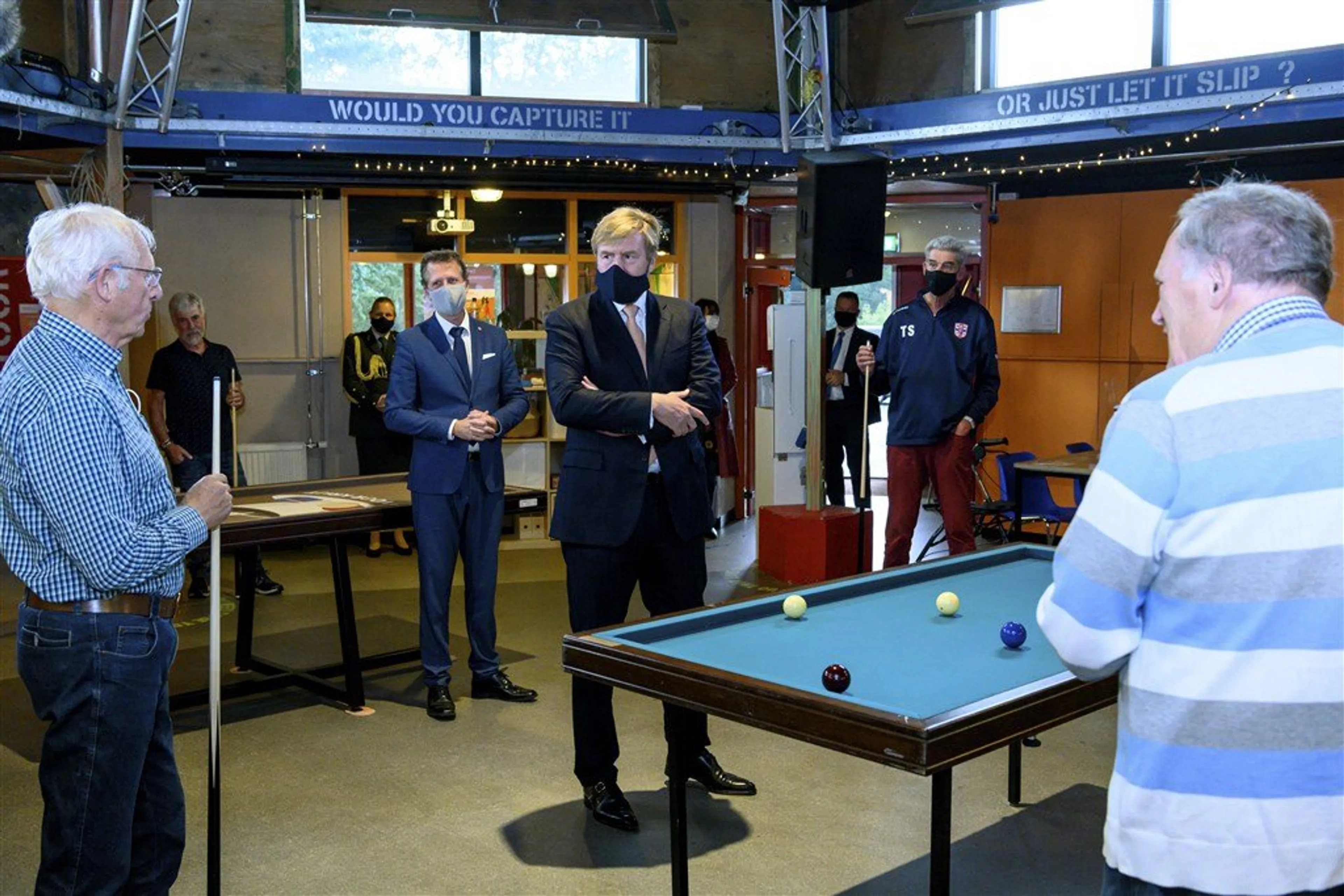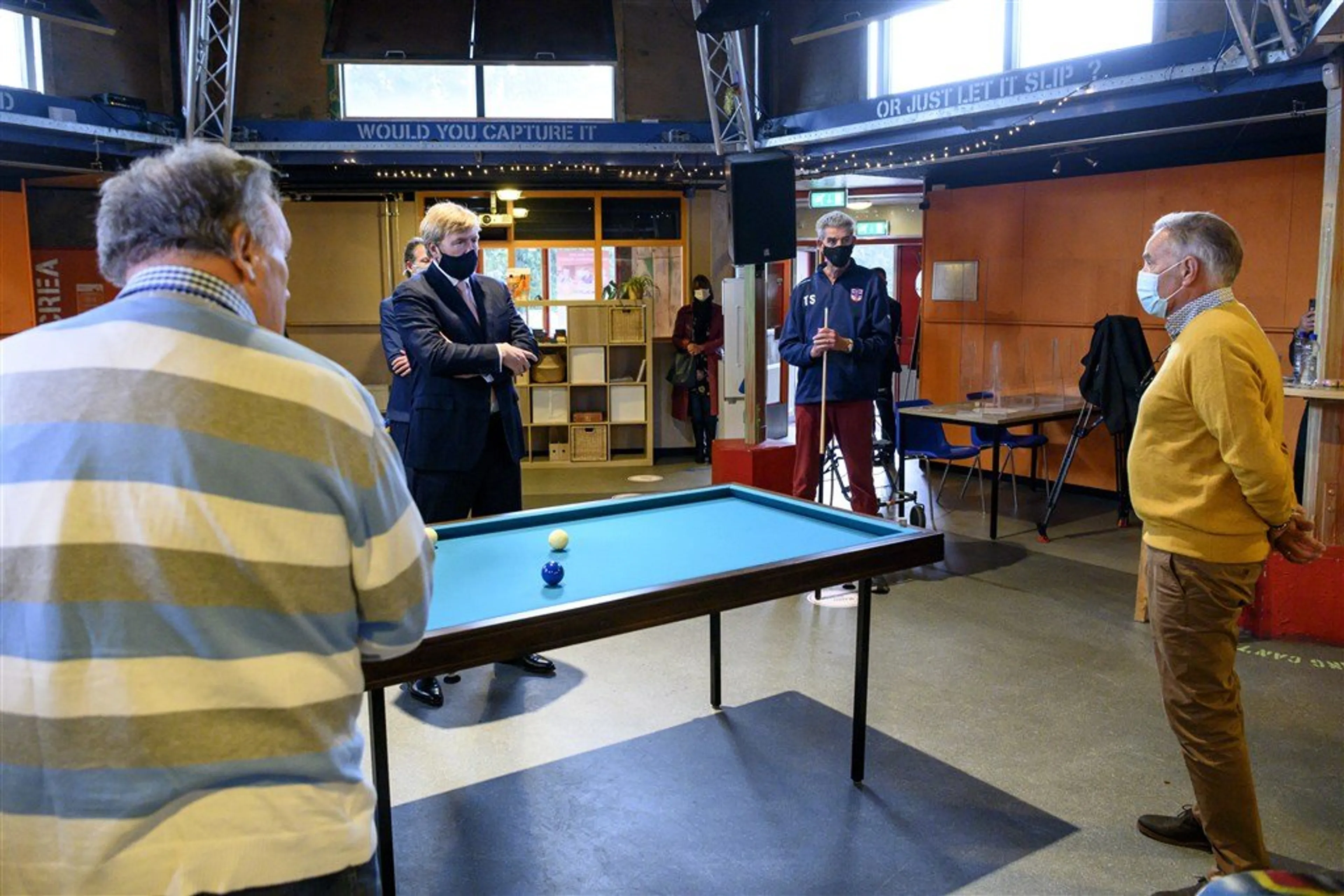 De koning, die bij het bezoek deels een mondkapje ophield, pakte de biljartkeu niet zelf op. Biljarten had hij sinds zijn diensttijd bij de Koninklijke Marine niet meer gedaan, zo verontschuldigde hij zich bij de 70-plussers die bijeen waren gekomen om op een aangepast en mobiel biljart te spelen. Het gaat daarbij niet om het biljarten per se maar om de gezelligheid en het onderling contact. "Het is geen doel, maar een middel om mensen bij elkaar te brengen", aldus directeur Willem La Rivière van de KNBB.