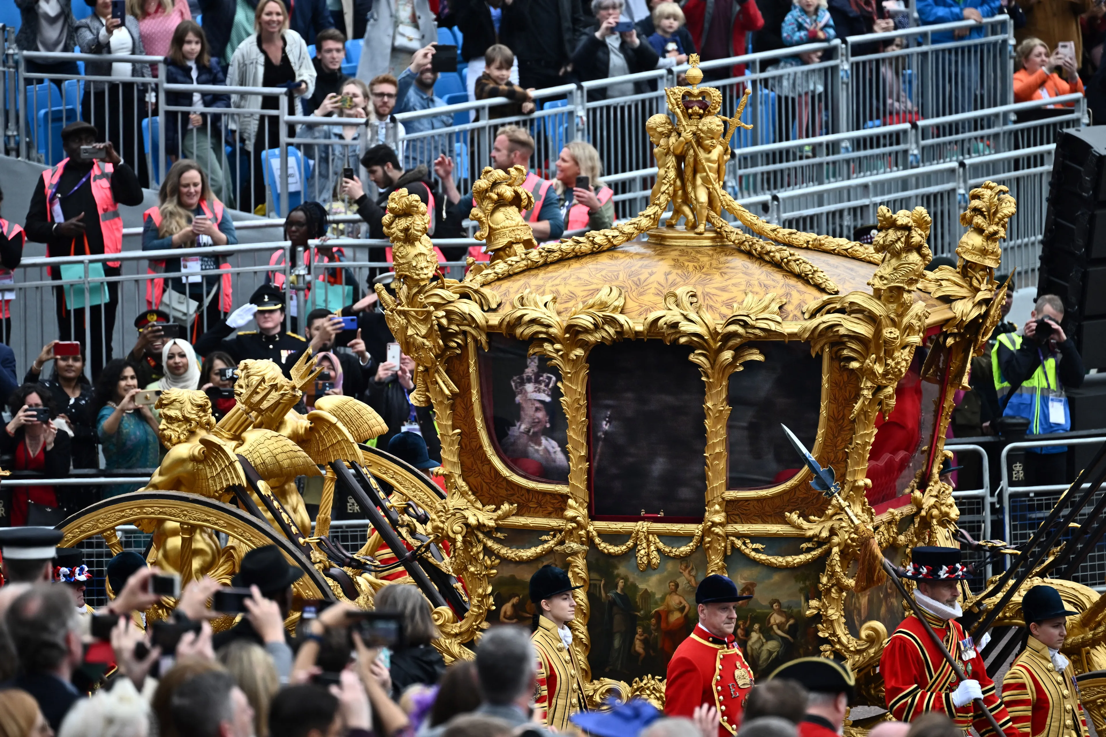 Dit is de Gold State Coach. Het lijkt of koningin Elizabeth er in zit op de dag van haar kroning in 1953, maar eromheen staan mensen met smartphones. Deze foto is namelijk genomen tijdens de Platinum Jubilee, 2022. Toen reed de Gold State Coach door Londen en werden er bewegende beelden van wijlen koningin Elizabeth op de zijkant van de koets geprojecteerd.