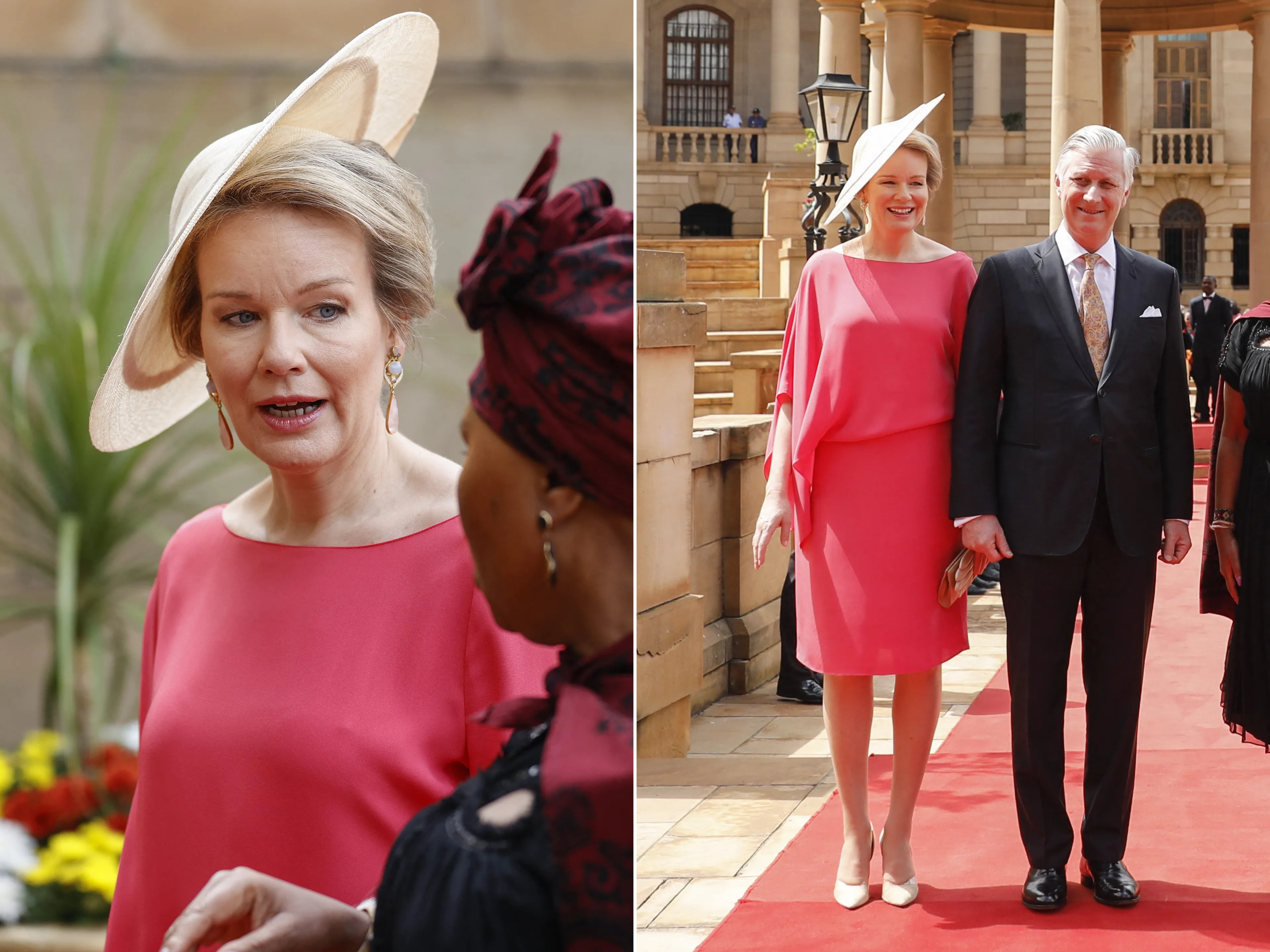 De eerste dag van het Belgisch staatsbezoek aan Zuid-Afrika vond plaats in Pretoria. Tijdens de welkomstceremonie en het bezoek aan het Freedom Park droeg koningin een felroze japon van het modehuis Natan. De opvallende, asymmetrische hoed die zij droeg, is speciaal voor dit staatsbezoek ontworpen door het Brusselse merk Maison Fabienne Delvigne. De 'Johanna' hoed is gemaakt van natuurlijke vezels.