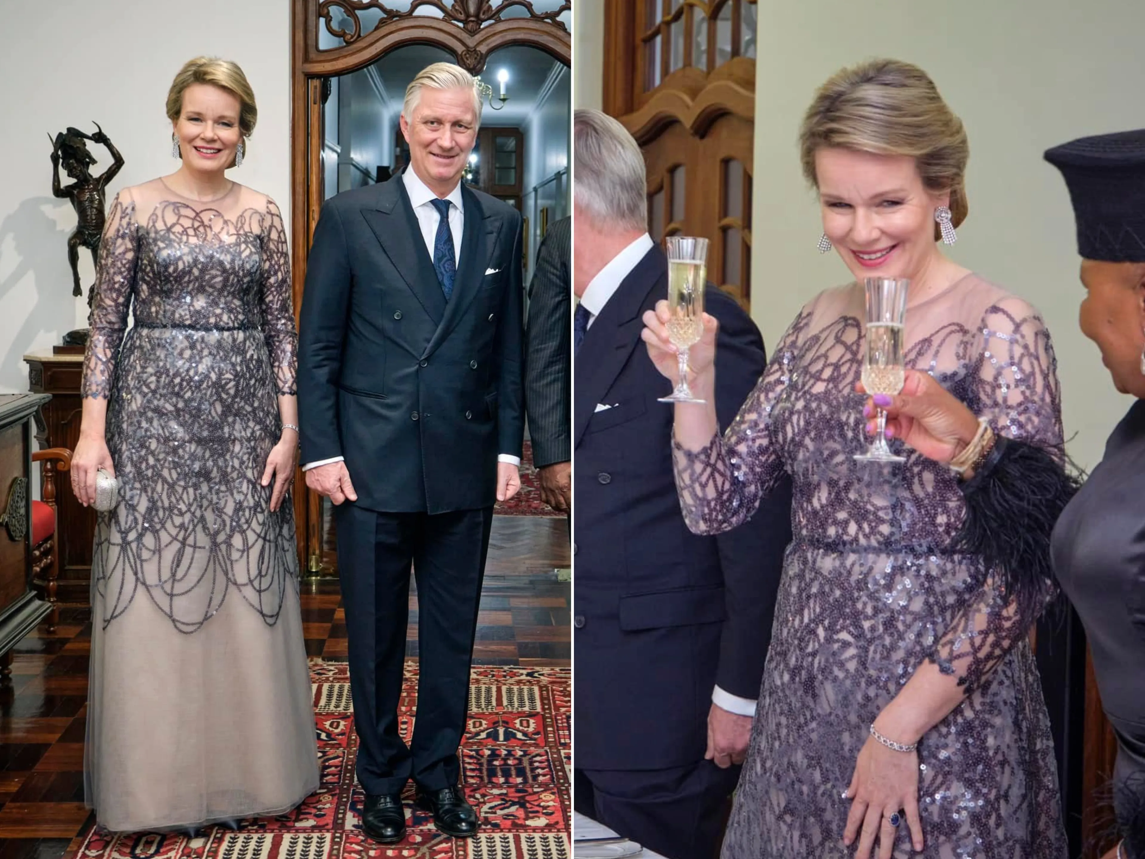De eerste dag van het staatsbezoek werd afgesloten met een staatsdiner. Koningin Mathilde droeg voor de gelegenheid een lange galajurk met paars-blauwe pailetten. Het patroon van de pailetten op de tule geeft de jurk een interessant ontwerp. De jurk is een ontwerp van het modehuis Natan. Koningin Mathilde droeg tijdens het diner géén tiara. Dit kwam door de dress code 'Cocktail dress', waarbij het dragen van een tiara niet verwacht werd.