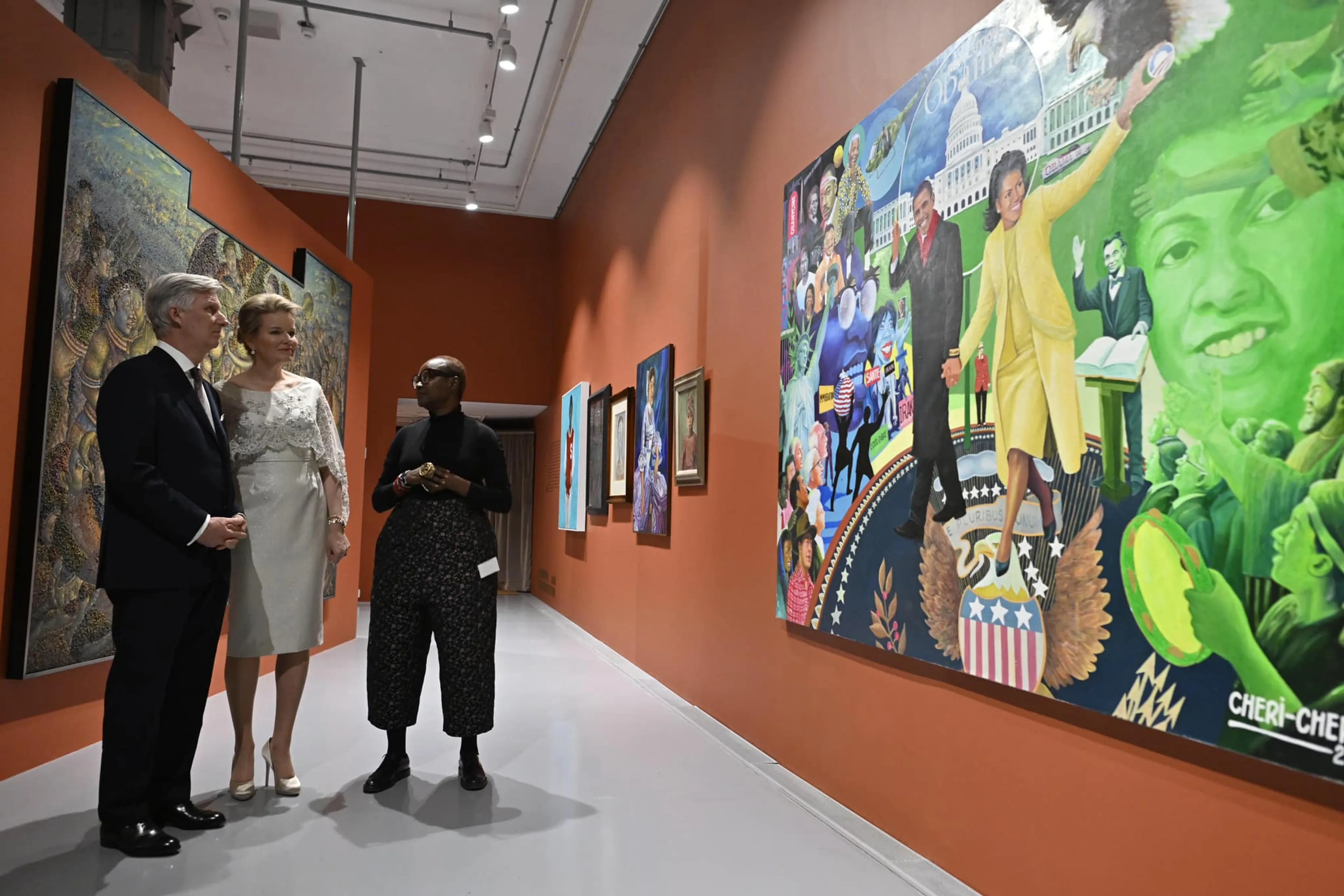 's Avonds bezocht het Belgisch koningspaar de tentoonstelling "When We See Us: A Century of Black Figuration in Painting" in het Zeitz Museum. De schitterende witte jurk is een ontwerp van de Belgische modeontwerper Bernard Depoorter.