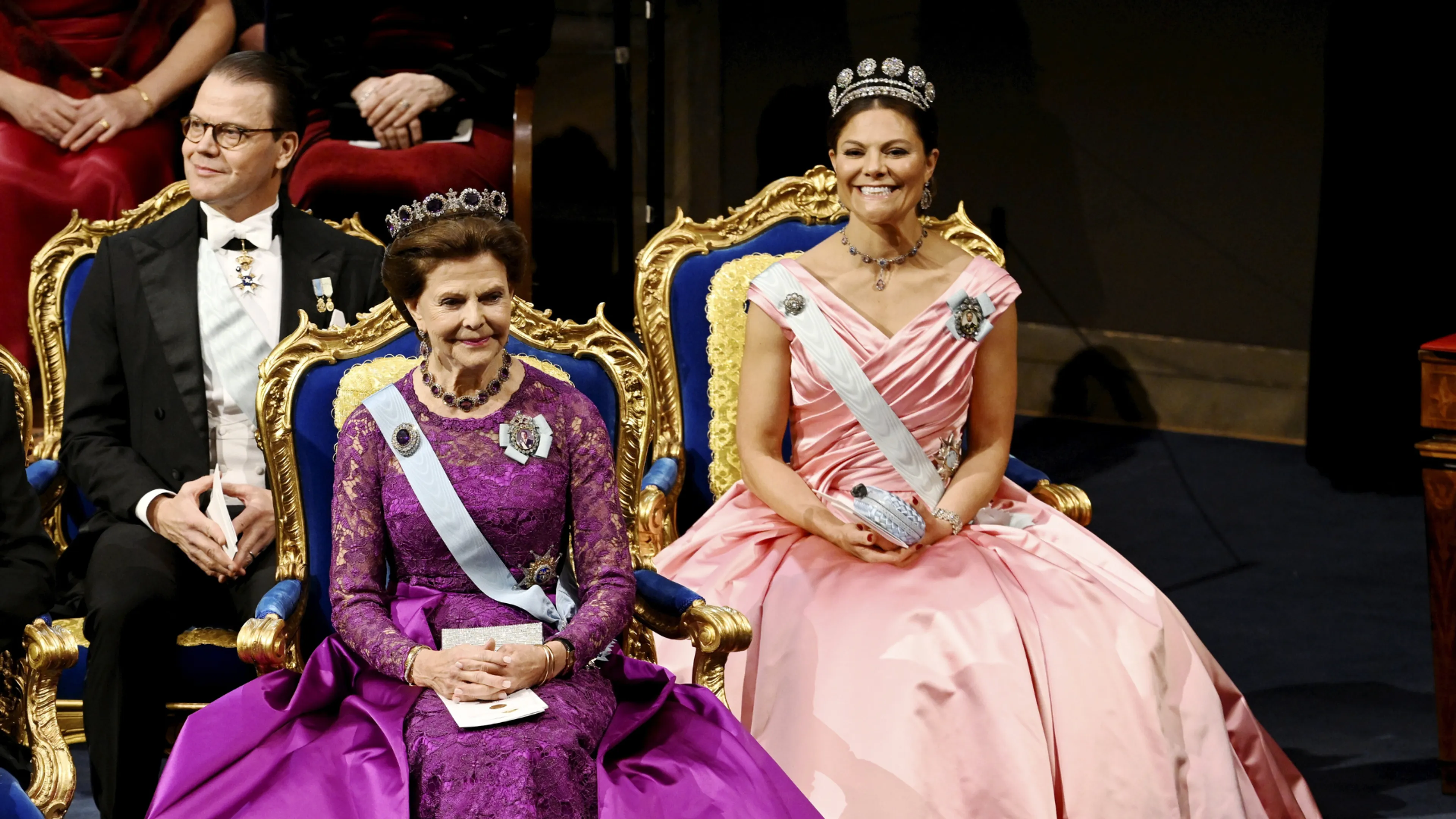 Ook tijdens de uitreiking van de Nobelprijzen in 2024 had de koningin een feestelijke jurk aan. Dit keer in een andere kleur, namelijk donkergrijs. De japon met pailletten en lange mouwen zorgde voor een glinsterend effect. Als accessoires droeg de koningin de Leuchtenberg-parure met saffieren.