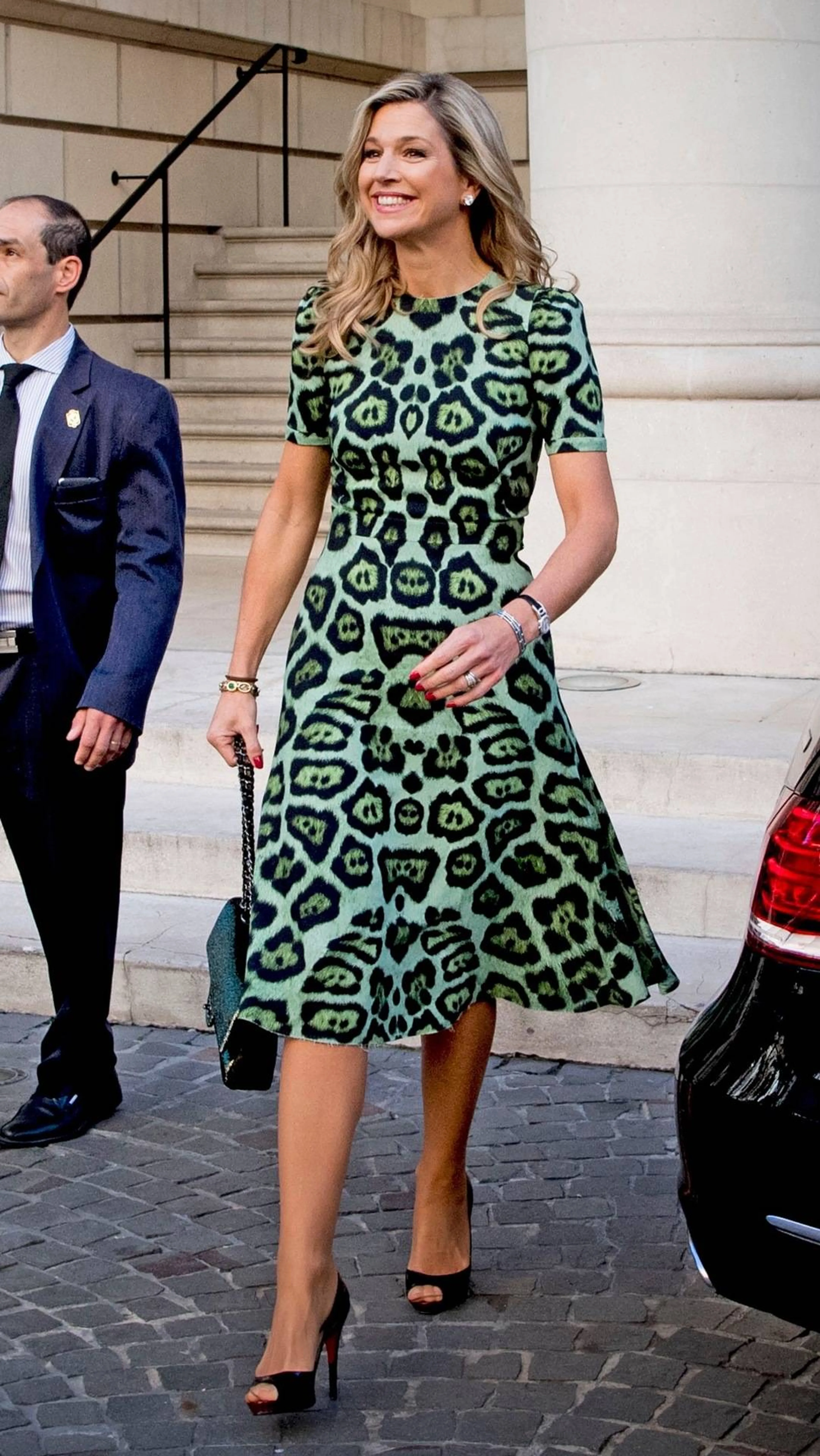 ArgentiniëTwee keer dit jaar draagt Máxima de groenkleurige japon met panterprint: eerst tijdens een bezoek aan Argentinië in oktober en later nog tijdens het staatsbezoek aan Nieuw-Zeeland in november. De jurk is van modehuis Givenchy.